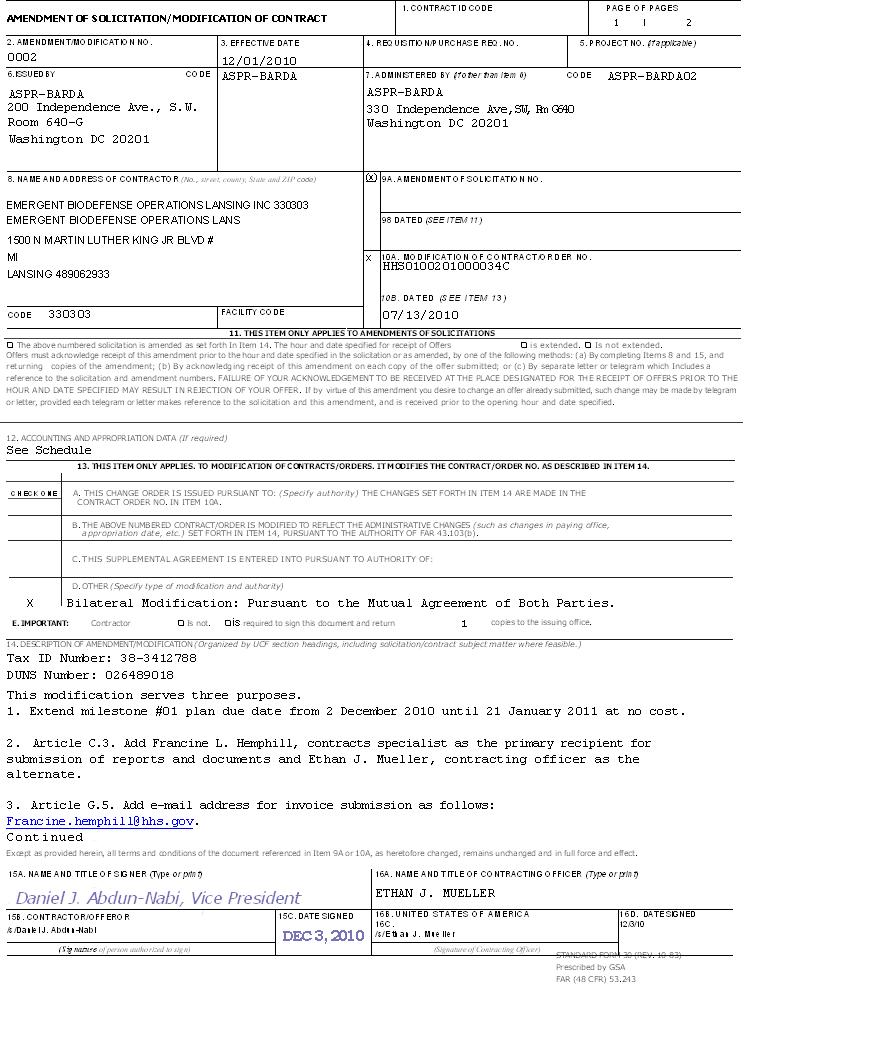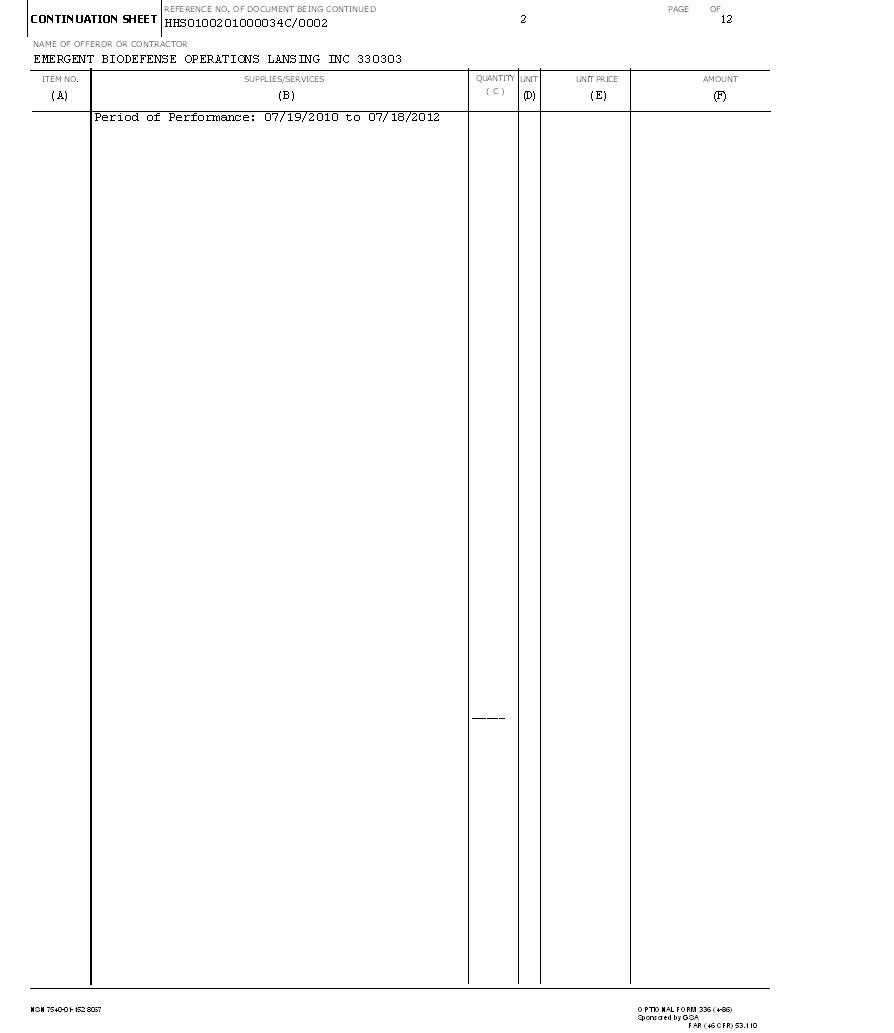 FOR: EMERGENT BIODEFENSE OPERATIONS LANSING LLC