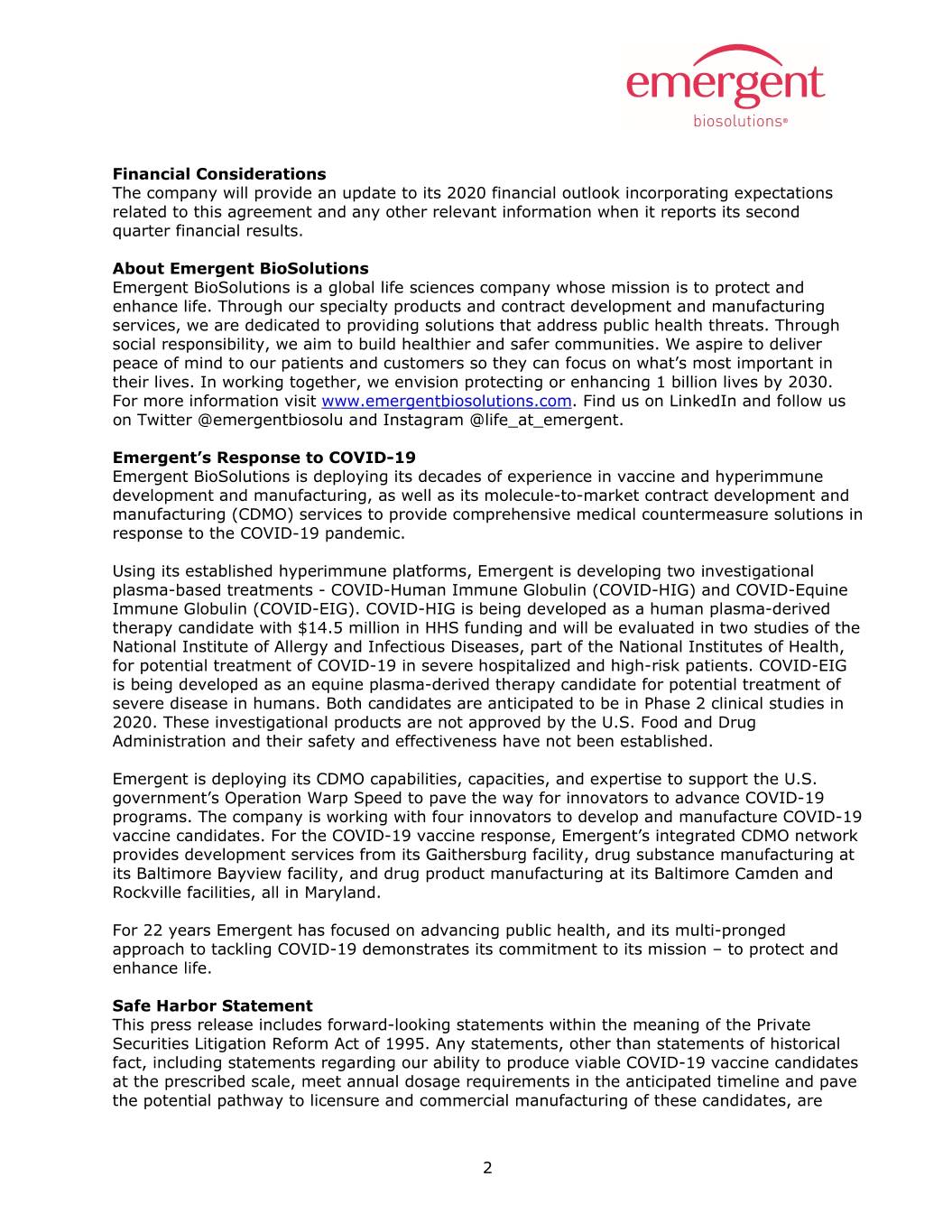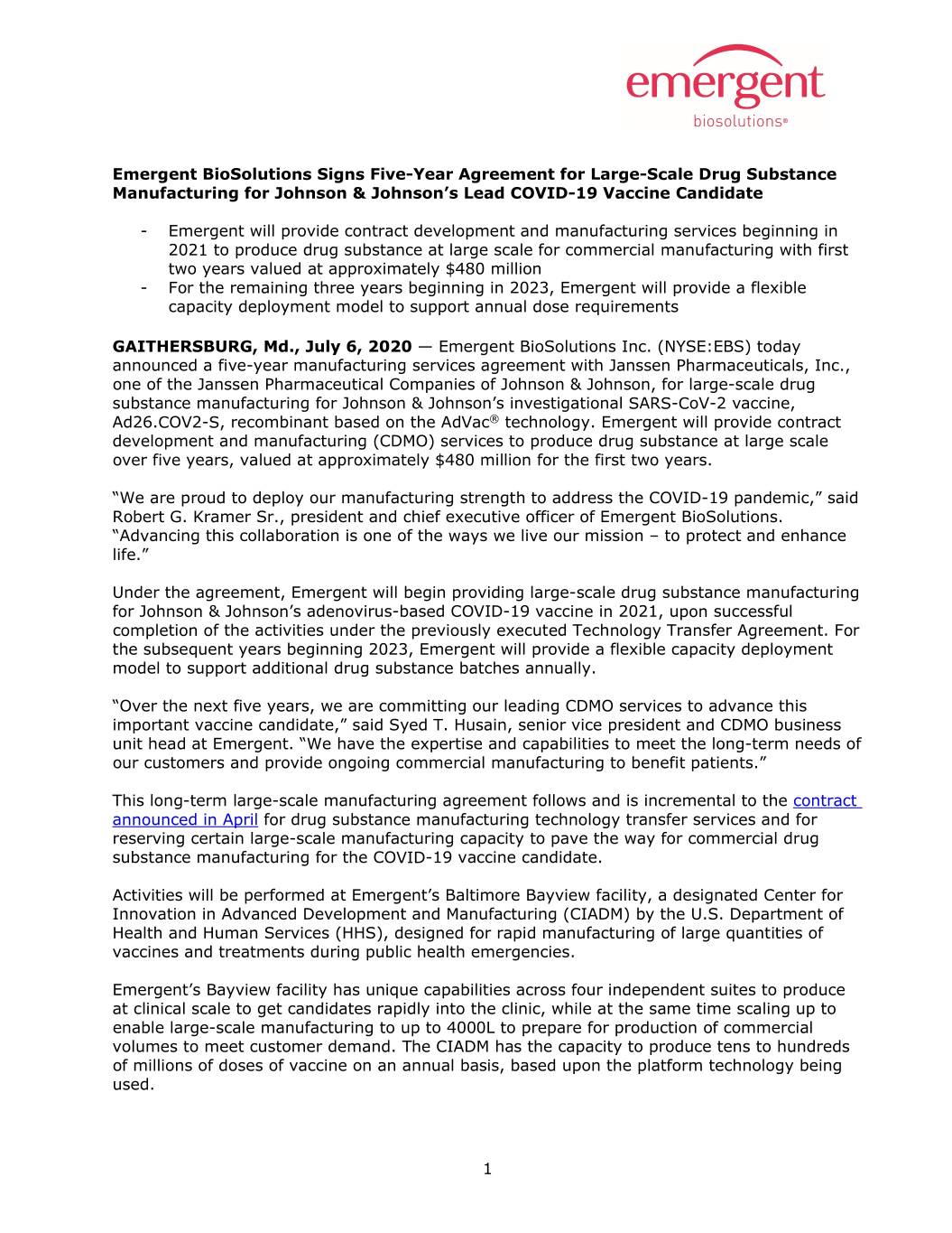 On July 2, 2020, Emergent BioSolutions Inc., through its wholly-owned subsidiary, Emergent Manufacturing Operations Baltimore, LLC (collectively, the “Company”), entered into a manufacturing services agreement (the “Agreement”) with Janssen Pharmaceuticals, Inc., one of the Janssen Pharmaceutical Companies of Johnson & Johnson, for large-scale drug substance manufacturing of Johnson & Johnson’s investigational SARS-CoV-2 vaccine, Ad26.COV2-S, recombinant based on the AdVac® technology. The parties previously agreed to work together to negotiate the terms of the Agreement under a technology transfer letter agreement entered into in April 2020.
