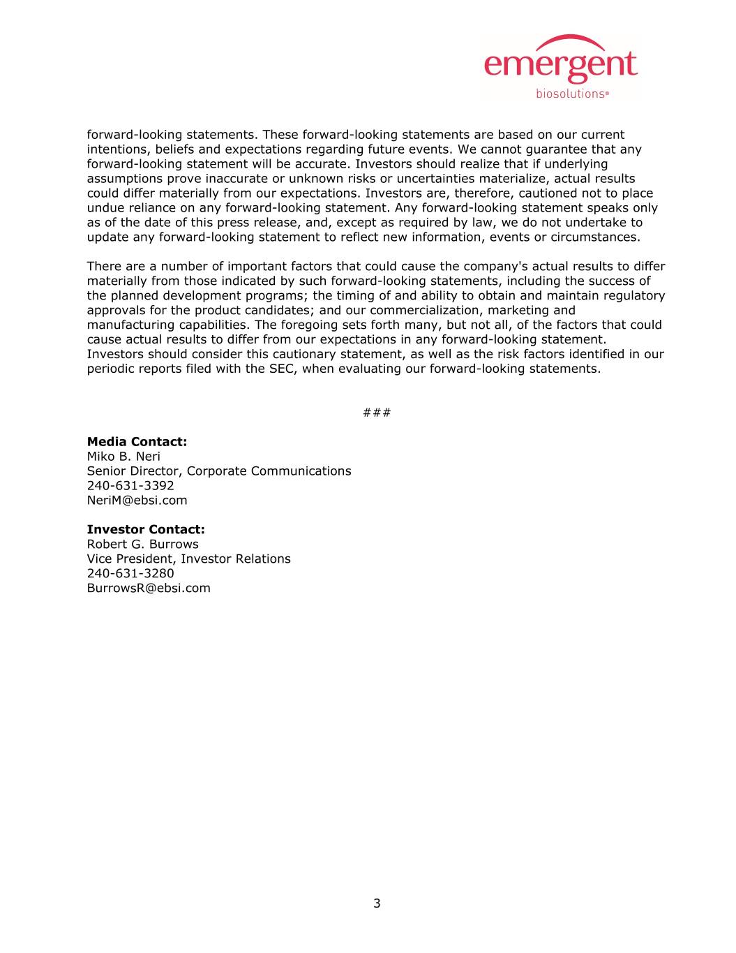 101 | | Emergent BioSolutions Inc. Current Report on Form 8-K, dated July 2, 2020, formatted in XBRL (Extensible Business Reporting Language): Cover Page. The instance document does not appear in the Interactive Data File because its XBRL tags are embedded within the Inline XBRL document. |