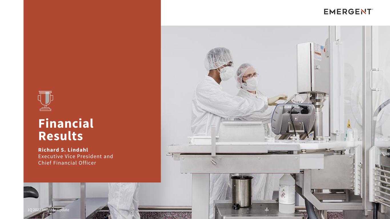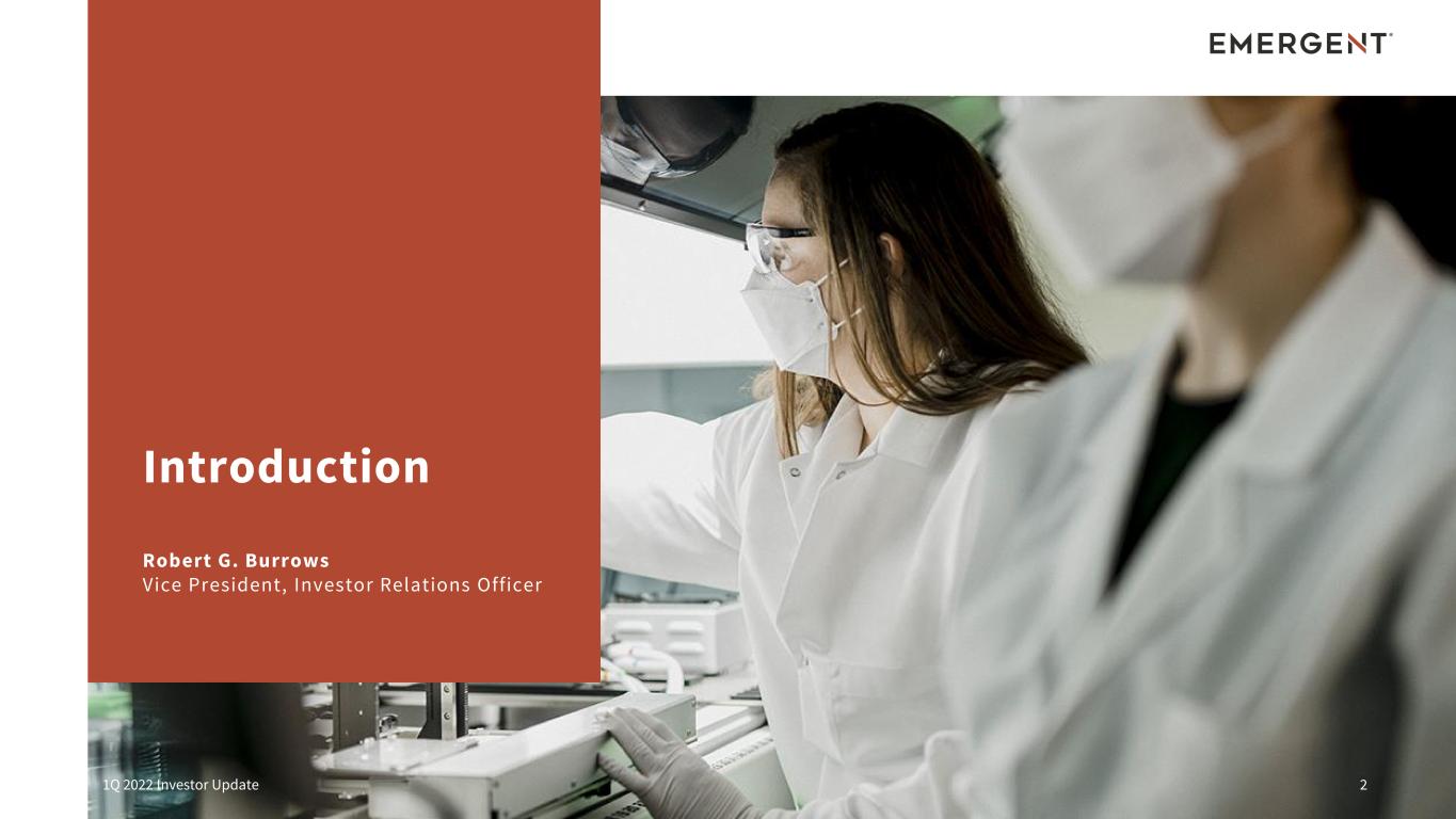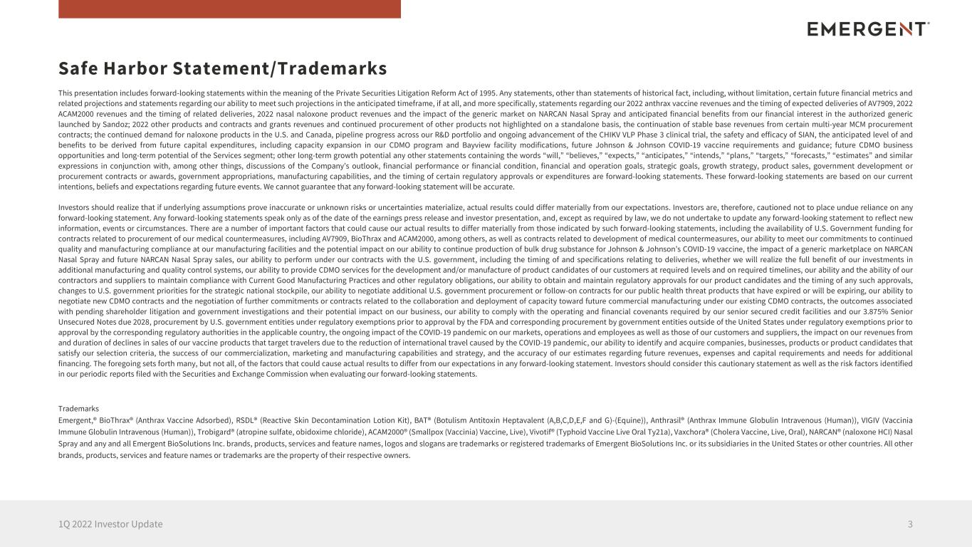 This presentation includes forward-looking statements within the meaning of the Private Securities Litigation Reform Act of 1995. Any statements, other than statements of historical fact, including, without limitation, certain future financial metrics and related projections and statements regarding our ability to meet such projections in the anticipated timeframe, if at all, and more specifically, statements regarding our 2022 anthrax vaccine revenues and the timing of expected deliveries of AV7909, 2022 ACAM2000 revenues and the timing of related deliveries, 2022 nasal naloxone product revenues and the impact of the generic market on NARCAN Nasal Spray and anticipated financial benefits from our financial interest in the authorized generic launched by Sandoz; 2022 other products and contracts and grants revenues and continued procurement of other products not highlighted on a standalone basis, the continuation of stable base revenues from certain multi-year MCM procurement contracts; the continued demand for naloxone products in the U.S. and Canada, pipeline progress across our R&D portfolio and ongoing advancement of the CHIKV VLP Phase 3 clinical trial, the safety and efficacy of SIAN, the anticipated level of and benefits to be derived from future capital expenditures, including capacity expansion in our CDMO program and Bayview facility modifications, future Johnson & Johnson COVID-19 vaccine requirements and guidance; future CDMO business opportunities and long-term potential of the Services segment; other long-term growth potential any other statements containing the words “will,” “believes,” “expects,” “anticipates,” “intends,” “plans,” “targets,” “forecasts,” “estimates” and similar expressions in conjunction with, among other things, discussions of the Company’s outlook, financial performance or financial condition, financial and operation goals, strategic goals, growth strategy, product sales, government development or procurement contracts or awards, government appropriations, manufacturing capabilities, and the timing of certain regulatory approvals or expenditures are forward-looking statements. These forward-looking statements are based on our current intentions, beliefs and expectations regarding future events. We cannot guarantee that any forward-looking statement will be accurate. Investors should realize that if underlying assumptions prove inaccurate or unknown risks or uncertainties materialize, actual results could differ materially from our expectations. Investors are, therefore, cautioned not to place undue reliance on any forward-looking statement. Any forward-looking statements speak only as of the date of the earnings press release and investor presentation, and, except as required by law, we do not undertake to update any forward-looking statement to reflect new information, events or circumstances. There are a number of important factors that could cause our actual results to differ materially from those indicated by such forward-looking statements, including the availability of U.S. Government funding for contracts related to procurement of our medical countermeasures, including AV7909, BioThrax and ACAM2000, among others, as well as contracts related to development of medical countermeasures, our ability to meet our commitments to continued quality and manufacturing compliance at our manufacturing facilities and the potential impact on our ability to continue production of bulk drug substance for Johnson & Johnson’s COVID-19 vaccine, the impact of a generic marketplace on NARCAN Nasal Spray and future NARCAN Nasal Spray sales, our ability to perform under our contracts with the U.S. government, including the timing of and specifications relating to deliveries, whether we will realize the full benefit of our investments in additional manufacturing and quality control systems, our ability to provide CDMO services for the development and/or manufacture of product candidates of our customers at required levels and on required timelines, our ability and the ability of our contractors and suppliers to maintain compliance with Current Good Manufacturing Practices and other regulatory obligations, our ability to obtain and maintain regulatory approvals for our product candidates and the timing of any such approvals, changes to U.S. government priorities for the strategic national stockpile, our ability to negotiate additional U.S. government procurement or follow-on contracts for our public health threat products that have expired or will be expiring, our ability to negotiate new CDMO contracts and the negotiation of further commitments or contracts related to the collaboration and deployment of capacity toward future commercial manufacturing under our existing CDMO contracts, the outcomes associated with pending shareholder litigation and government investigations and their potential impact on our business, our ability to comply with the operating and financial covenants required by our senior secured credit facilities and our 3.875% Senior Unsecured Notes due 2028, procurement by U.S. government entities under regulatory exemptions prior to approval by the FDA and corresponding procurement by government entities outside of the United States under regulatory exemptions prior to approval by the corresponding regulatory authorities in the applicable country, the ongoing impact of the COVID-19 pandemic on our markets, operations and employees as well as those of our customers and suppliers, the impact on our revenues from and duration of declines in sales of our vaccine products that target travelers due to the reduction of international travel caused by the COVID-19 pandemic, our ability to identify and acquire companies, businesses, products or product candidates that satisfy our selection criteria, the success of our commercialization, marketing and manufacturing capabilities and strategy, and the accuracy of our estimates 