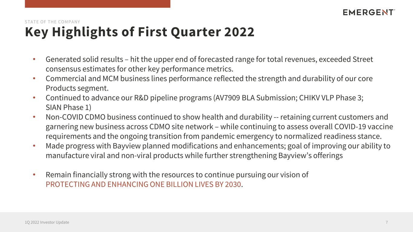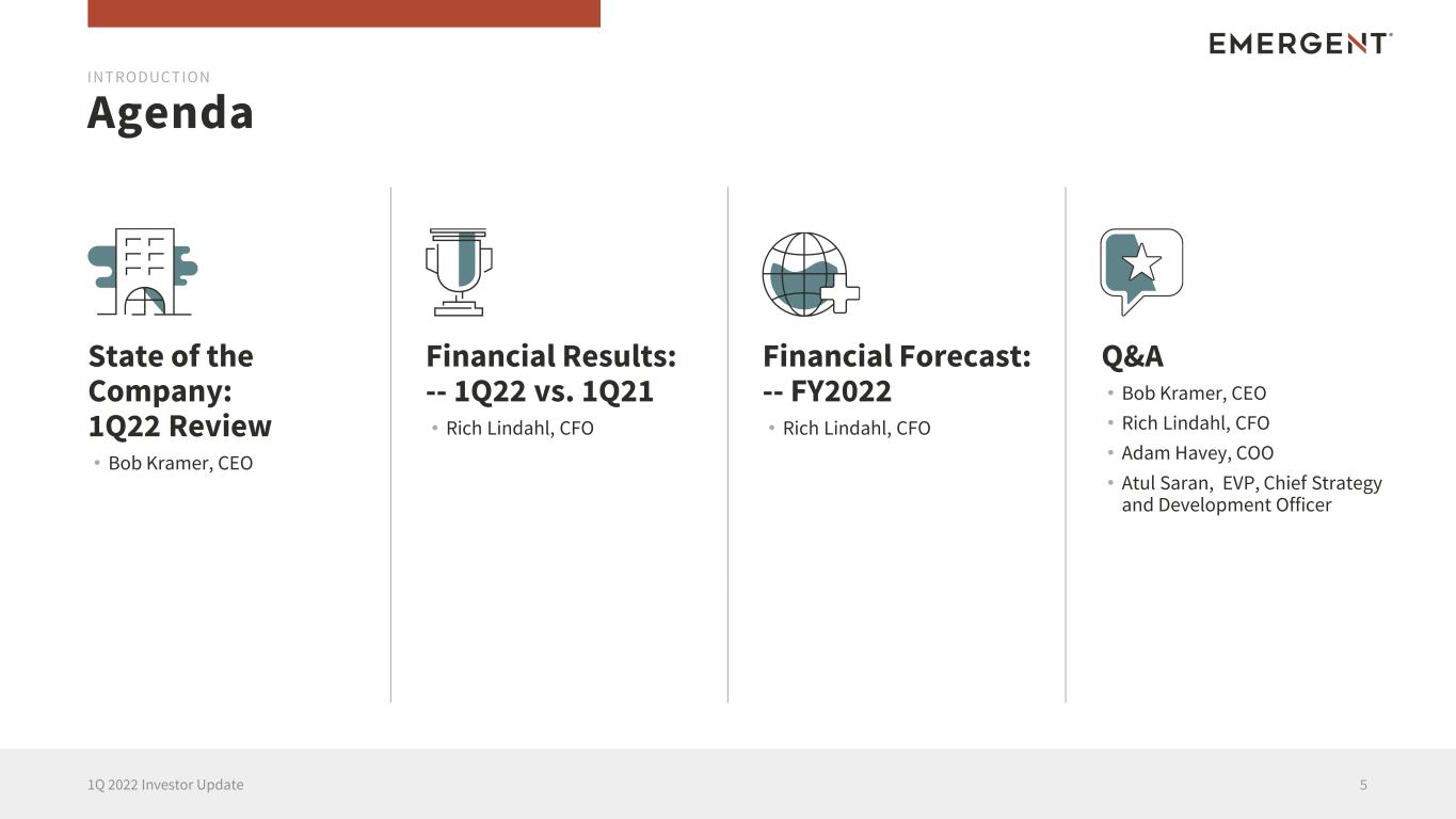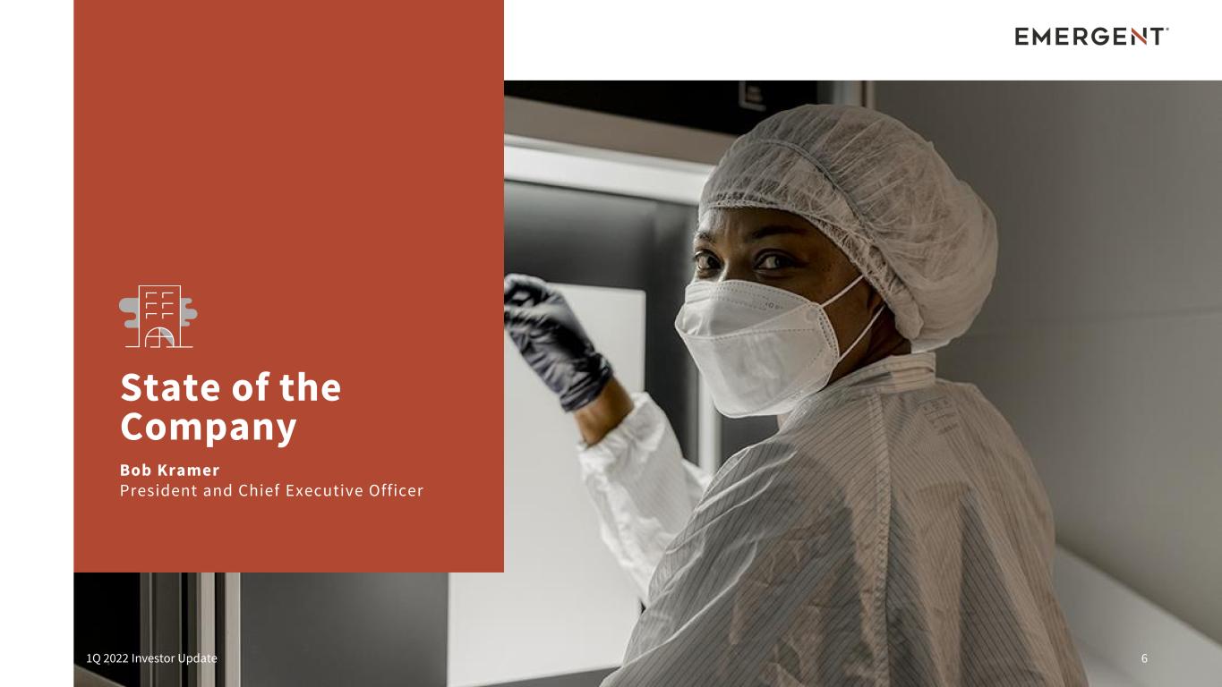 This presentation includes forward-looking statements within the meaning of the Private Securities Litigation Reform Act of 1995. Any statements, other than statements of historical fact, including, without limitation, certain future financial metrics and related projections and statements regarding our ability to meet such projections in the anticipated timeframe, if at all, and more specifically, statements regarding our 2022 anthrax vaccine revenues and the timing of expected deliveries of AV7909, 2022 ACAM2000 revenues and the timing of related deliveries, 2022 nasal naloxone product revenues and the impact of the generic market on NARCAN Nasal Spray and anticipated financial benefits from our financial interest in the authorized generic launched by Sandoz; 2022 other products and contracts and grants revenues and continued procurement of other products not highlighted on a standalone basis, the continuation of stable base revenues from certain multi-year MCM procurement contracts; the continued demand for naloxone products in the U.S. and Canada, pipeline progress across our R&D portfolio and ongoing advancement of the CHIKV VLP Phase 3 clinical trial, the safety and efficacy of SIAN, the anticipated level of and benefits to be derived from future capital expenditures, including capacity expansion in our CDMO program and Bayview facility modifications, future Johnson & Johnson COVID-19 vaccine requirements and guidance; future CDMO business opportunities and long-term potential of the Services segment; other long-term growth potential any other statements containing the words “will,” “believes,” “expects,” “anticipates,” “intends,” “plans,” “targets,” “forecasts,” “estimates” and similar expressions in conjunction with, among other things, discussions of the Company’s outlook, financial performance or financial condition, financial and operation goals, strategic goals, growth strategy, product sales, government development or procurement contracts or awards, government appropriations, manufacturing capabilities, and the timing of certain regulatory approvals or expenditures are forward-looking statements. These forward-looking statements are based on our current intentions, beliefs and expectations regarding future events. We cannot guarantee that any forward-looking statement will be accurate. Investors should realize that if underlying assumptions prove inaccurate or unknown risks or uncertainties materialize, actual results could differ materially from our expectations. Investors are, therefore, cautioned not to place undue reliance on any forward-looking statement. Any forward-looking statements speak only as of the date of the earnings press release and investor presentation, and, except as required by law, we do not undertake to update any forward-looking statement to reflect new information, events or circumstances. There are a number of important factors that could cause our actual results to differ materially from those indicated by such forward-looking statements, including the availability of U.S. Government funding for contracts related to procurement of our medical countermeasures, including AV7909, BioThrax and ACAM2000, among others, as well as contracts related to development of medical countermeasures, our ability to meet our commitments to continued quality and manufacturing compliance at our manufacturing facilities and the potential impact on our ability to continue production of bulk drug substance for Johnson & Johnson’s COVID-19 vaccine, the impact of a generic marketplace on NARCAN Nasal Spray and future NARCAN Nasal Spray sales, our ability to perform under our contracts with the U.S. government, including the timing of and specifications relating to deliveries, whether we will realize the full benefit of our investments in additional manufacturing and quality control systems, our ability to provide CDMO services for the development and/or manufacture of product candidates of our customers at required levels and on required timelines, our ability and the ability of our contractors and suppliers to maintain compliance with Current Good Manufacturing Practices and other regulatory obligations, our ability to obtain and maintain regulatory approvals for our product candidates and the timing of any such approvals, changes to U.S. government priorities for the strategic national stockpile, our ability to negotiate additional U.S. government procurement or follow-on contracts for our public health threat products that have expired or will be expiring, our ability to negotiate new CDMO contracts and the negotiation of further commitments or contracts related to the collaboration and deployment of capacity toward future commercial manufacturing under our existing CDMO contracts, the outcomes associated with pending shareholder litigation and government investigations and their potential impact on our business, our ability to comply with the operating and financial covenants required by our senior secured credit facilities and our 3.875% Senior Unsecured Notes due 2028, procurement by U.S. government entities under regulatory exemptions prior to approval by the FDA and corresponding procurement by government entities outside of the United States under regulatory exemptions prior to approval by the corresponding regulatory authorities in the applicable country, the ongoing impact of the COVID-19 pandemic on our markets, operations and employees as well as those of our customers and suppliers, the impact on our revenues from and duration of declines in sales of our vaccine products that target travelers due to the reduction of international travel caused by the COVID-19 pandemic, our ability to identify and acquire companies, businesses, products or product candidates that satisfy our selection criteria, the success of our commercialization, marketing and manufacturing capabilities and strategy, and the accuracy of our estimates 