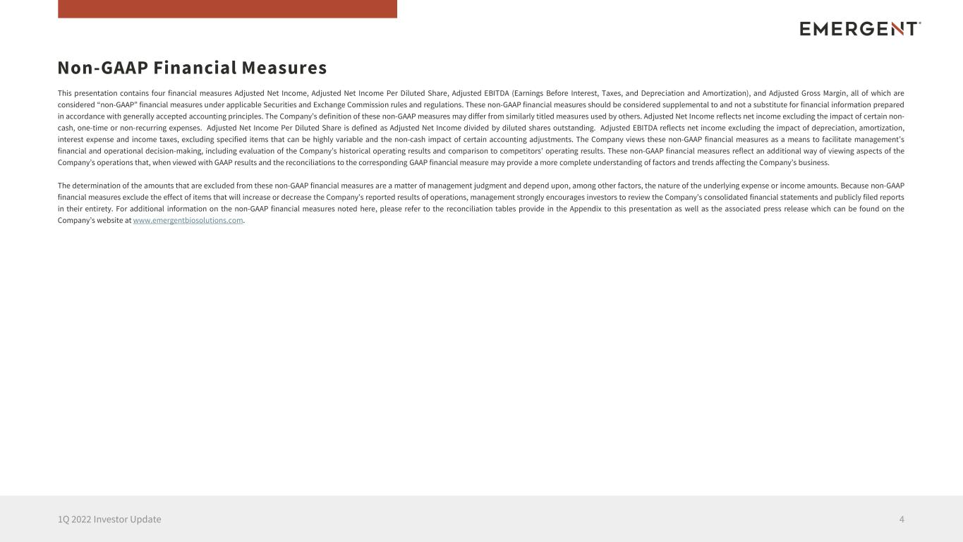 This presentation contains four financial measures Adjusted Net Income, Adjusted Net Income Per Diluted Share, Adjusted EBITDA (Earnings Before Interest, Taxes, and Depreciation and Amortization), and Adjusted Gross Margin, all of which are considered “non-GAAP” financial measures under applicable Securities and Exchange Commission rules and regulations. These non-GAAP financial measures should be considered supplemental to and not a substitute for financial information prepared in accordance with generally accepted accounting principles. The Company’s definition of these non-GAAP measures may differ from similarly titled measures used by others. Adjusted Net Income reflects net income excluding the impact of certain non- cash, one-time or non-recurring expenses. Adjusted Net Income Per Diluted Share is defined as Adjusted Net Income divided by diluted shares outstanding. Adjusted EBITDA reflects net income excluding the impact of depreciation, amortization, interest expense and income taxes, excluding specified items that can be highly variable and the non-cash impact of certain accounting adjustments. The Company views these non-GAAP financial measures as a means to facilitate management’s financial and operational decision-making, including evaluation of the Company’s historical operating results and comparison to competitors’ operating results. These non-GAAP financial measures reflect an additional way of viewing aspects of the Company’s operations that, when viewed with GAAP results and the reconciliations to the corresponding GAAP financial measure may provide a more complete understanding of factors and trends affecting the Company’s business. The determination of the amounts that are excluded from these non-GAAP financial measures are a matter of management judgment and depend upon, among other factors, the nature of the underlying expense or income amounts. Because non-GAAP financial measures exclude the effect of items that will increase or decrease the Company’s reported results of operations, management strongly encourages investors to review the Company’s consolidated financial statements and publicly filed reports in their entirety. For additional information on the non-GAAP financial measures noted here, please refer to the reconciliation tables provide in the Appendix to this presentation as well as the associated press release which can be found on the Company’s website at www.emergentbiosolutions.com. Non-GAAP Financial Measures 41Q 2022 Investor Update