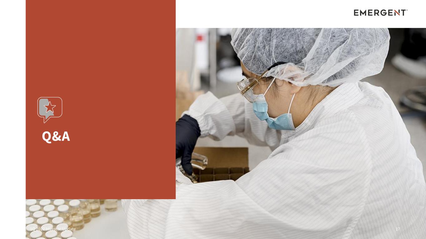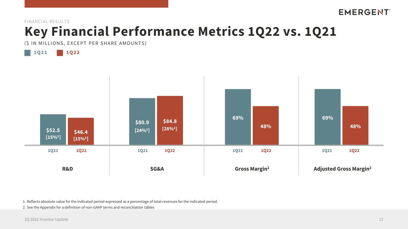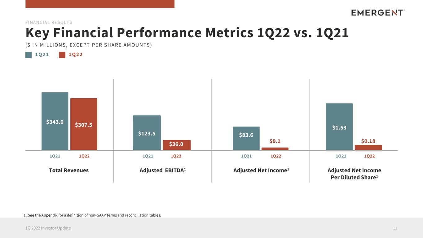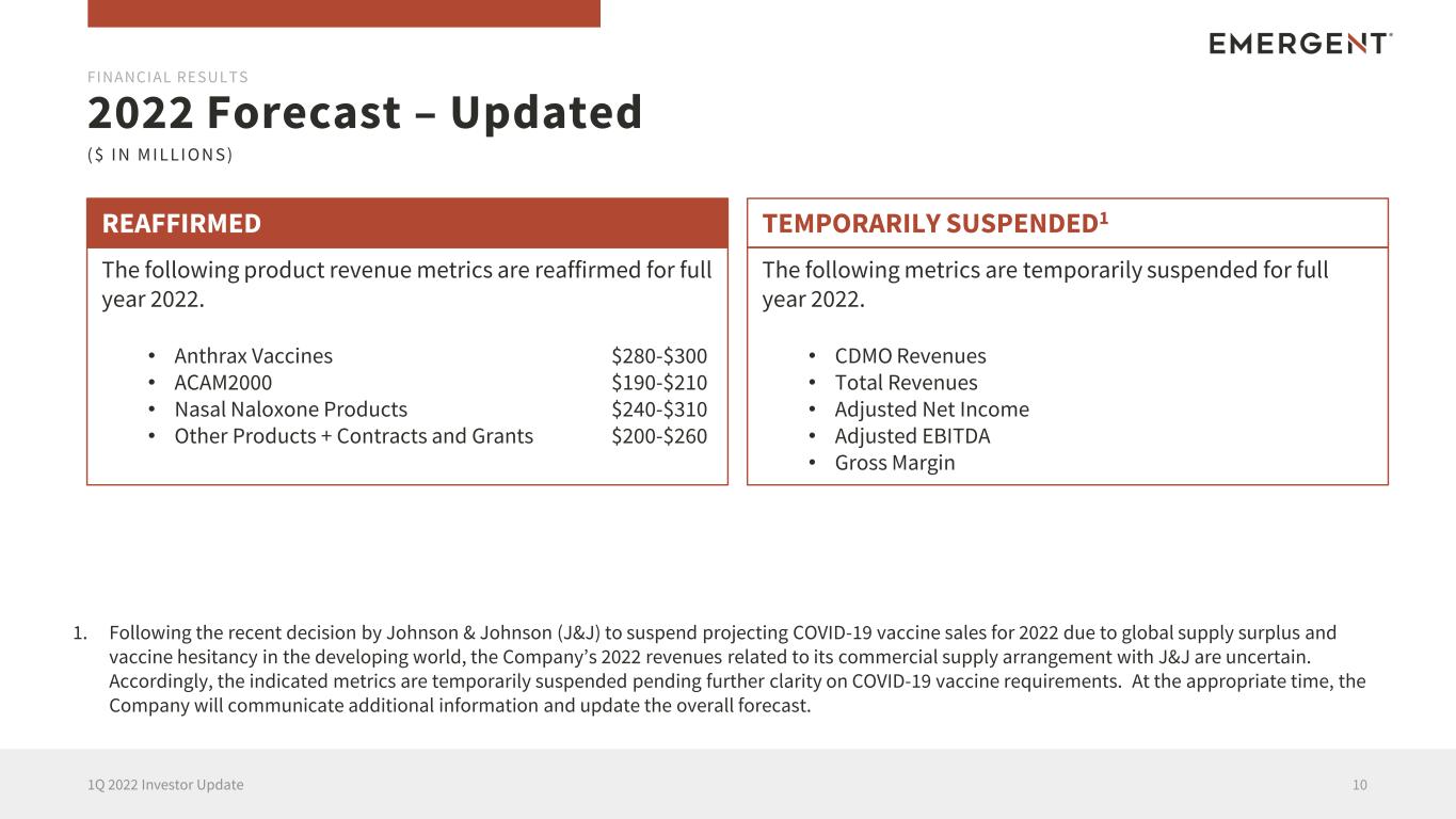 2022 Forecast – Updated 101Q 2022 Investor Update FINANCIAL RESULTS ( $ I N M I LLI O N S ) The following product revenue metrics are reaffirmed for full year 2022. • Anthrax Vaccines $280-$300 • ACAM2000 $190-$210 • Nasal Naloxone Products $240-$310 • Other Products + Contracts and Grants $200-$260 REAFFIRMED The following metrics are temporarily suspended for full year 2022. • CDMO Revenues • Total Revenues • Adjusted Net Income • Adjusted EBITDA • Gross Margin TEMPORARILY SUSPENDED1 1. Following the recent decision by Johnson & Johnson (J&J) to suspend projecting COVID-19 vaccine sales for 2022 due to global supply surplus and vaccine hesitancy in the developing world, the Company’s 2022 revenues related to its commercial supply arrangement with J&J are uncertain. Accordingly, the indicated metrics are temporarily suspended pending further clarity on COVID-19 vaccine requirements. At the appropriate time, the Company will communicate additional information and update the overall forecast.
