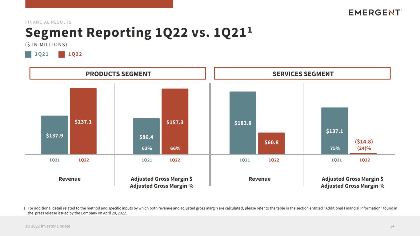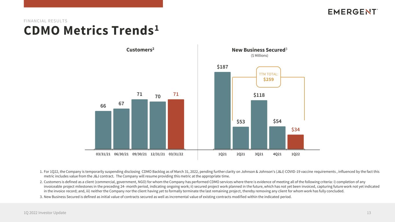 66 67 71 70 71 03/31/21 06/30/21 09/30/21 12/31/21 03/31/22 CDMO Metrics Trends1 131Q 2022 Investor Update 1. For 1Q22, the Company is temporarily suspending disclosing CDMO Backlog as of March 31, 2022, pending further clarity on Johnson & Johnson's (J&J) COVID-19 vaccine requirements , influenced by the fact this metric includes value from the J&J contract. The Company will resume providing this metric at the appropriate time. 2. Customers is defined as a client (commercial, government, NGO) for whom the Company has performed CDMO services where there is evidence of meeting all of the following criteria: i) completion of any invoiceable project milestones in the preceding 24- month period, indicating ongoing work; ii) secured project work planned in the future, which has not yet been invoiced, capturing future work not yet indicated in the invoice record; and, iii) neither the Company nor the client having yet to formally terminate the last remaining project, thereby removing any client for whom work has fully concluded. 3. New Business Secured is defined as initial value of contracts secured as well as incremental value of existing contracts modified within the indicated period. FINANCIAL RESULTS New Business Secured3 ($ Millions) Customers2 $187 $53 $118 $54 $34 1Q21 2Q21 3Q21 4Q21 1Q22 TTM TOTAL: $259