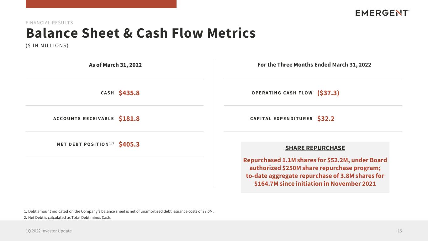 1 Q 2 1 Segment Reporting 1Q22 vs. 1Q211 141Q 2022 Investor Update Revenue Adjusted Gross Margin $ Adjusted Gross Margin % Adjusted Gross Margin $ Adjusted Gross Margin % Revenue 1. For additional detail related to the method and specific inputs by which both revenue and adjusted gross margin are calculated, please refer to the table in the section entitled “Additional Financial Information” found in the press release issued by the Company on April 28, 2022. $137.9 $237.1 FINANCIAL RESULTS $86.4 $157.3 ( $ I N M I LLI O N S ) 1 Q 2 2 1Q21 1Q22 1Q21 1Q22 1Q21 1Q22 1Q21 1Q22 PRODUCTS SEGMENT SERVICES SEGMENT 63% 66% $183.8 $60.8 $137.1 75% ($14.8) (24)%