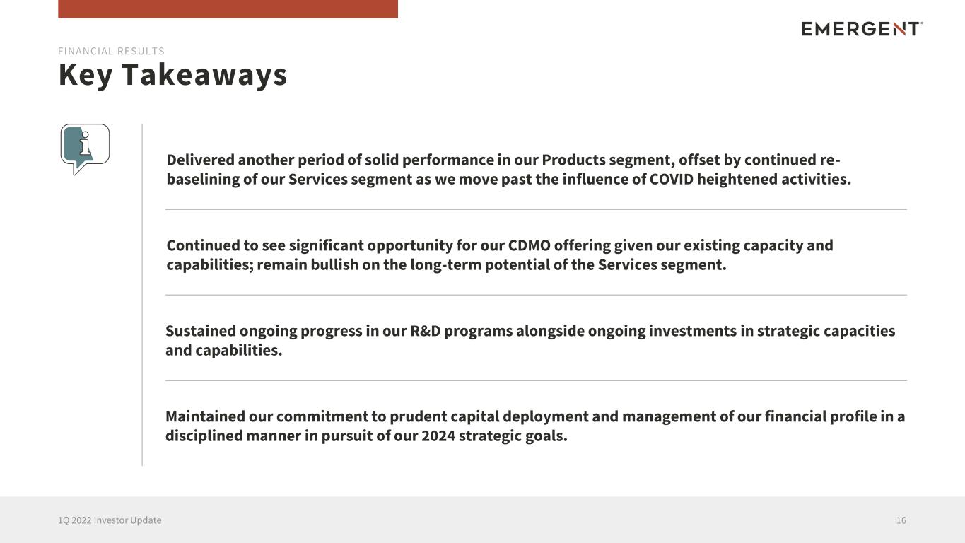 Delivered another period of solid performance in our Products segment, offset by continued re- baselining of our Services segment as we move past the influence of COVID heightened activities. Key Takeaways 161Q 2022 Investor Update FINANCIAL RESULTS Continued to see significant opportunity for our CDMO offering given our existing capacity and capabilities; remain bullish on the long-term potential of the Services segment. Sustained ongoing progress in our R&D programs alongside ongoing investments in strategic capacities and capabilities. Maintained our commitment to prudent capital deployment and management of our financial profile in a disciplined manner in pursuit of our 2024 strategic goals.