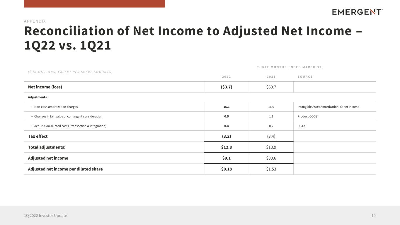 Reconciliation of Net Income to Adjusted Net Income – 1Q22 vs. 1Q21 191Q 2022 Investor Update APPENDIX ( $ I N M I L L I O N S , E X C E P T P E R S H A R E A M O U N T S ) T H R E E M O N T H S E N D E D M A R C H 3 1 , 2 0 2 2 2 0 2 1 S O U R C E Net income (loss) ($3.7) $69.7 Adjustments: + Non-cash amortization charges 15.1 16.0 Intangible Asset Amortization, Other Income + Changes in fair value of contingent consideration 0.5 1.1 Product COGS + Acquisition-related costs (transaction & integration) 0.4 0.2 SG&A Tax effect (3.2) (3.4) Total adjustments: $12.8 $13.9 Adjusted net income $9.1 $83.6 Adjusted net income per diluted share $0.18 $1.53