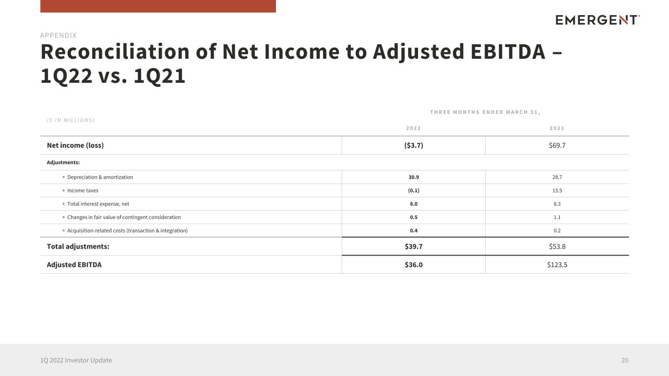 Reconciliation of Net Income to Adjusted EBITDA – 1Q22 vs. 1Q21 201Q 2022 Investor Update APPENDIX ( $ I N M I L L I O N S ) T H R E E M O N T H S E N D E D M A R C H 3 1 , 2 0 2 2 2 0 2 1 Net income (loss) ($3.7) $69.7 Adjustments: + Depreciation & amortization 30.9 28.7 + Income taxes (0.1) 15.5 + Total interest expense, net 8.0 8.3 + Changes in fair value of contingent consideration 0.5 1.1 + Acquisition-related costs (transaction & integration) 0.4 0.2 Total adjustments: $39.7 $53.8 Adjusted EBITDA $36.0 $123.5