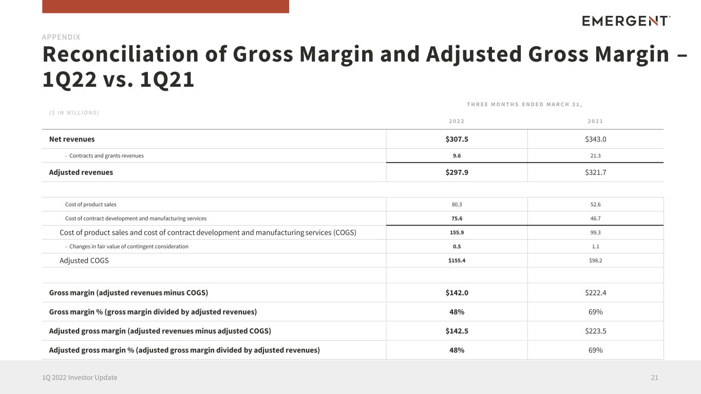 Reconciliation of Gross Margin and Adjusted Gross Margin – 1Q22 vs. 1Q21 211Q 2022 Investor Update APPENDIX ( $ I N M I L L I O N S ) T H R E E M O N T H S E N D E D M A R C H 3 1 , 2 0 2 2 2 0 2 1 Net revenues $307.5 $343.0 - Contracts and grants revenues 9.6 21.3 Adjusted revenues $297.9 $321.7 Cost of product sales 80.3 52.6 Cost of contract development and manufacturing services 75.6 46.7 Cost of product sales and cost of contract development and manufacturing services (COGS) 155.9 99.3 - Changes in fair value of contingent consideration 0.5 1.1 Adjusted COGS $155.4 $98.2 Gross margin (adjusted revenues minus COGS) $142.0 $222.4 Gross margin % (gross margin divided by adjusted revenues) 48% 69% Adjusted gross margin (adjusted revenues minus adjusted COGS) $142.5 $223.5 Adjusted gross margin % (adjusted gross margin divided by adjusted revenues) 48% 69%