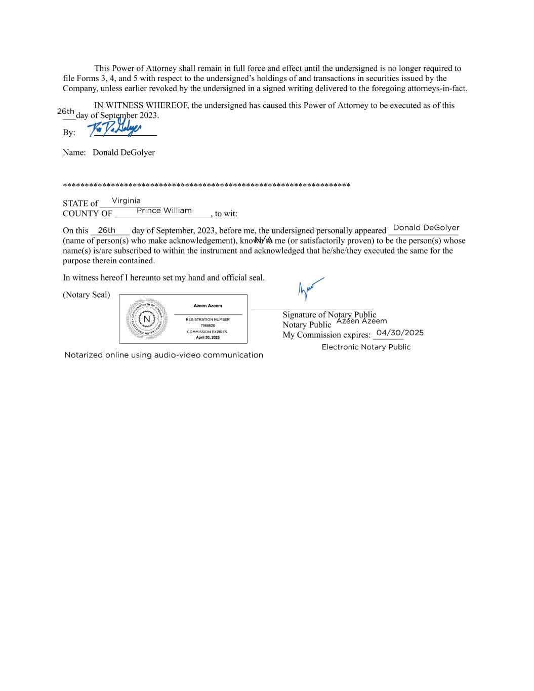 This Power of Attorney shall remain in full force and effect until the undersigned is no longer required to file Forms 3, 4, and 5 with respect to the undersigned’s holdings of and transactions in securities issued by the Company, unless earlier revoked by the undersigned in a signed writing delivered to the foregoing attorneys-in-fact. IN WITNESS WHEREOF, the undersigned has caused this Power of Attorney to be executed as of this ___day of September 2023. By: Name: Donald DeGolyer ****************************************************************** STATE of ______________ COUNTY OF ______________________, to wit: On this _________ day of September, 2023, before me, the undersigned personally appeared ________________ (name of person(s) who make acknowledgement), known to me (or satisfactorily proven) to be the person(s) whose name(s) is/are subscribed to within the instrument and acknowledged that he/she/they executed the same for the purpose therein contained. In witness hereof I hereunto set my hand and official seal. (Notary Seal) ____________________________ Signature of Notary Public Notary Public My Commission expires: _______ 26th Virginia Prince William 26th Donald DeGolyer Azeen Azeem 04/30/2025 Electronic Notary Public Notarized online using audio-video communication N/A
