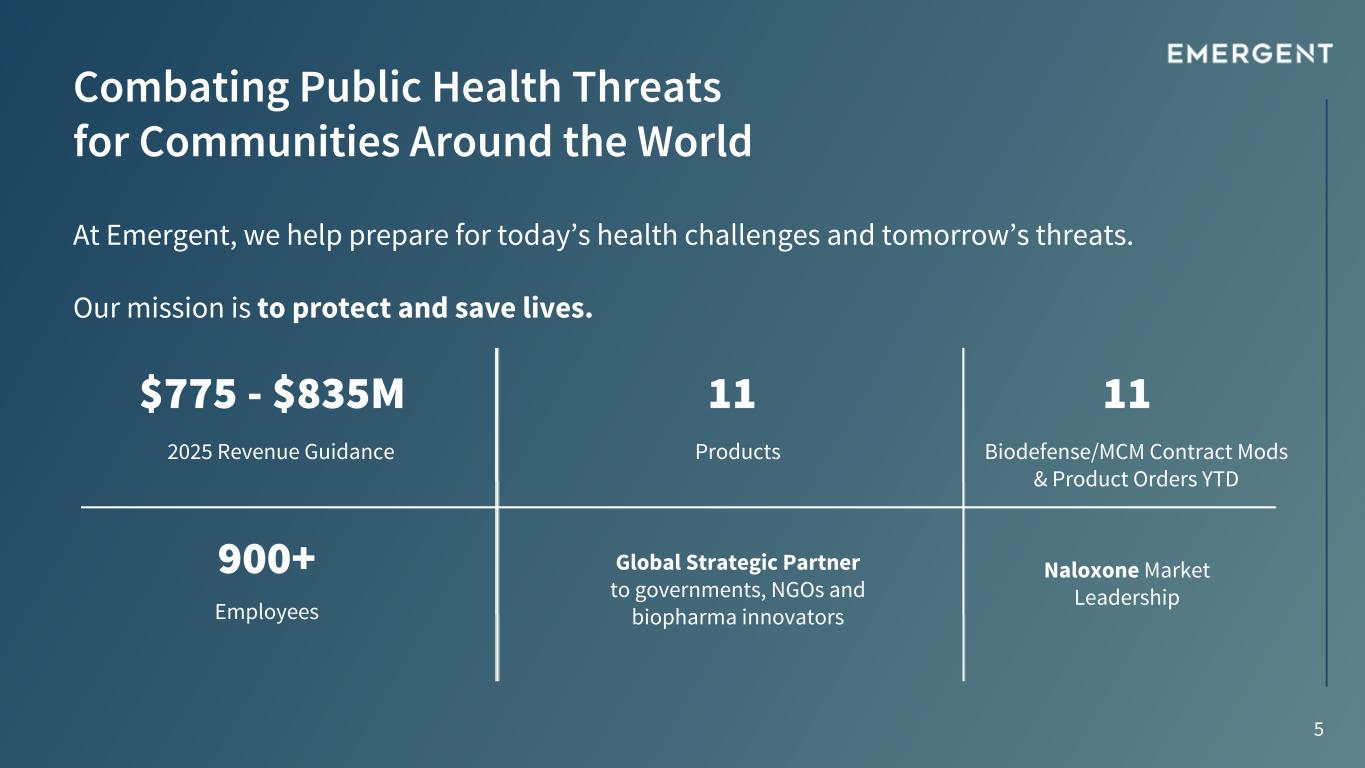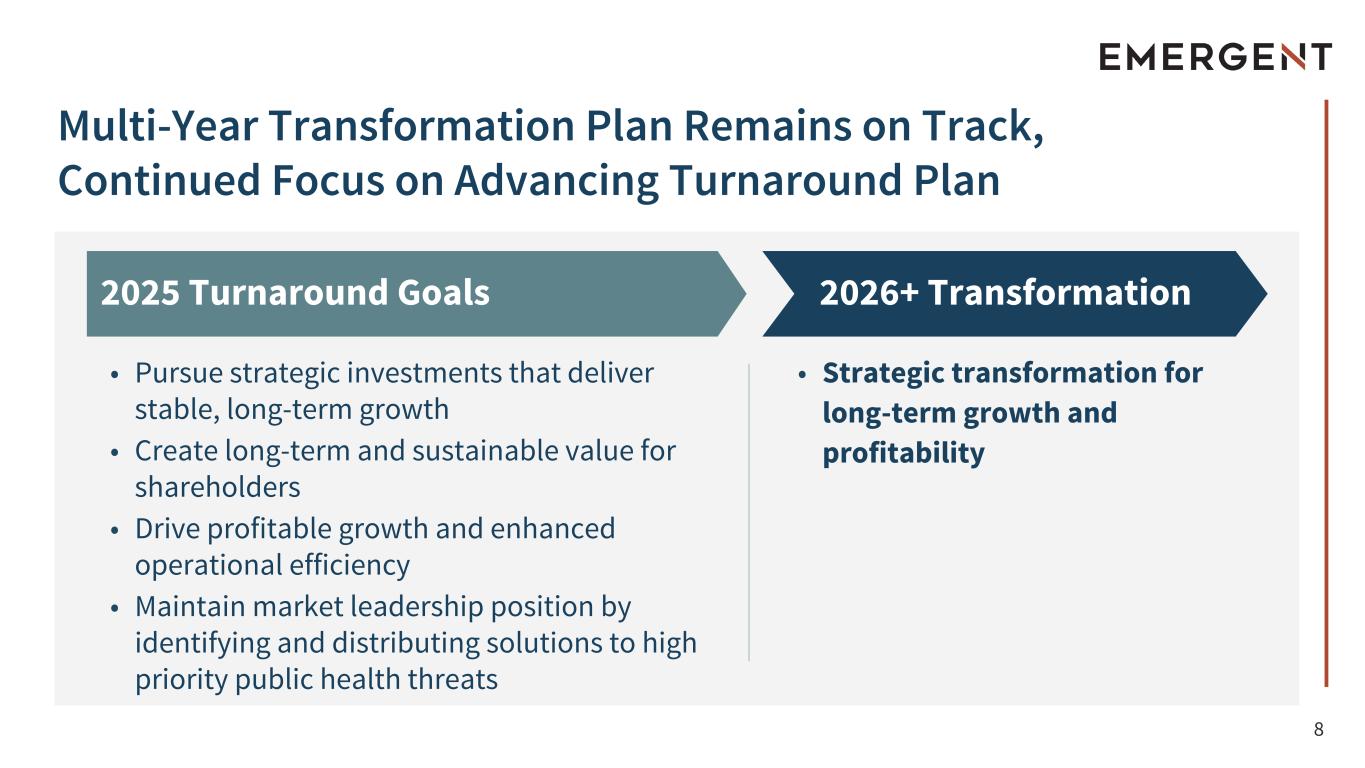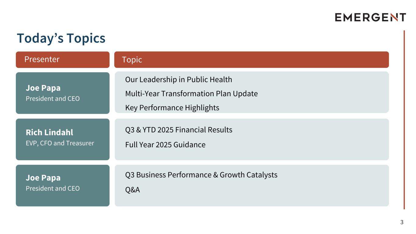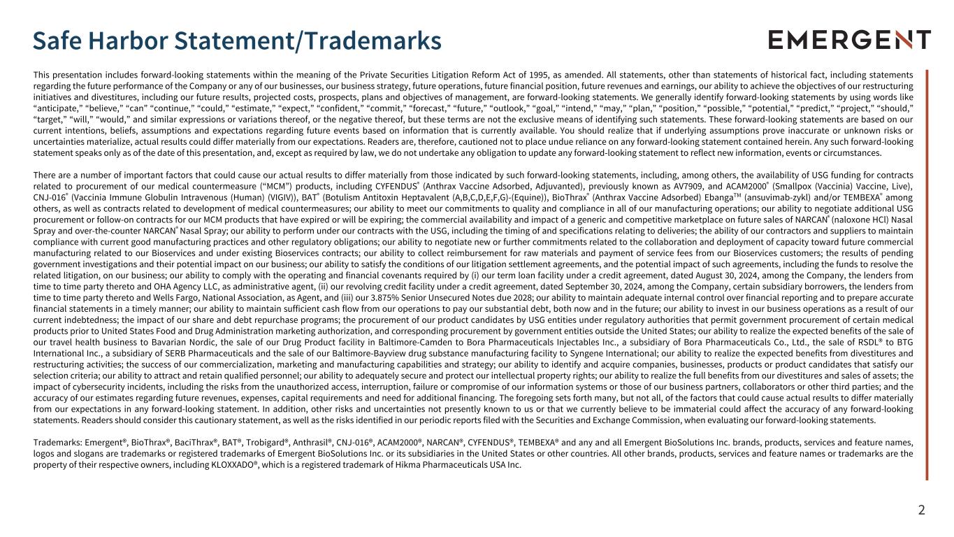 2 This presentation includes forward-looking statements within the meaning of the Private Securities Litigation Reform Act of 1995, as amended. All statements, other than statements of historical fact, including statements regarding the future performance of the Company or any of our businesses, our business strategy, future operations, future financial position, future revenues and earnings, our ability to achieve the objectives of our restructuring initiatives and divestitures, including our future results, projected costs, prospects, plans and objectives of management, are forward-looking statements. We generally identify forward-looking statements by using words like “anticipate,” “believe,” “can” “continue,” “could,” “estimate,” “expect,” “confident,” “commit,” “forecast,” “future,” “outlook,” “goal,” “intend,” “may,” “plan,” “position,” “possible,” “potential,” “predict,” “project,” “should,” “target,” “will,” “would,” and similar expressions or variations thereof, or the negative thereof, but these terms are not the exclusive means of identifying such statements. These forward-looking statements are based on our current intentions, beliefs, assumptions and expectations regarding future events based on information that is currently available. You should realize that if underlying assumptions prove inaccurate or unknown risks or uncertainties materialize, actual results could differ materially from our expectations. Readers are, therefore, cautioned not to place undue reliance on any forward-looking statement contained herein. Any such forward-looking statement speaks only as of the date of this presentation, and, except as required by law, we do not undertake any obligation to update any forward-looking statement to reflect new information, events or circumstances. There are a number of important factors that could cause our actual results to differ materially from those indicated by such forward-looking statements, including, among others, the availability of USG funding for contracts related to procurement of our medical countermeasure (“MCM”) products, including CYFENDUS® (Anthrax Vaccine Adsorbed, Adjuvanted), previously known as AV7909, and ACAM2000® (Smallpox (Vaccinia) Vaccine, Live), CNJ-016® (Vaccinia Immune Globulin Intravenous (Human) (VIGIV)), BAT® (Botulism Antitoxin Heptavalent (A,B,C,D,E,F,G)-(Equine)), BioThrax® (Anthrax Vaccine Adsorbed) EbangaTM (ansuvimab-zykl) and/or TEMBEXA® among others, as well as contracts related to development of medical countermeasures; our ability to meet our commitments to quality and compliance in all of our manufacturing operations; our ability to negotiate additional USG procurement or follow-on contracts for our MCM products that have expired or will be expiring; the commercial availability and impact of a generic and competitive marketplace on future sales of NARCAN® (naloxone HCl) Nasal Spray and over-the-counter NARCAN® Nasal Spray; our ability to perform under our contracts with the USG, including the timing of and specifications relating to deliveries; the ability of our contractors and suppliers to maintain compliance with current good manufacturing practices and other regulatory obligations; our ability to negotiate new or further commitments related to the collaboration and deployment of capacity toward future commercial manufacturing related to our Bioservices and under existing Bioservices contracts; our ability to collect reimbursement for raw materials and payment of service fees from our Bioservices customers; the results of pending government investigations and their potential impact on our business; our ability to satisfy the conditions of our litigation settlement agreements, and the potential impact of such agreements, including the funds to resolve the related litigation, on our business; our ability to comply with the operating and financial covenants required by (i) our term loan facility under a credit agreement, dated August 30, 2024, among the Company, the lenders from time to time party thereto and OHA Agency LLC, as administrative agent, (ii) our revolving credit facility under a credit agreement, dated September 30, 2024, among the Company, certain subsidiary borrowers, the lenders from time to time party thereto and Wells Fargo, National Association, as Agent, and (iii) our 3.875% Senior Unsecured Notes due 2028; our ability to maintain adequate internal control over financial reporting and to prepare accurate financial statements in a timely manner; our ability to maintain sufficient cash flow from our operations to pay our substantial debt, both now and in the future; our ability to invest in our business operations as a result of our current indebtedness; the impact of our share and debt repurchase programs; the procurement of our product candidates by USG entities under regulatory authorities that permit government procurement of certain medical products prior to United States Food and Drug Administration marketing authorization, and corresponding procurement by government entities outside the United States; our ability to realize the expected benefits of the sale of our travel health business to Bavarian Nordic, the sale of our Drug Product facility in Baltimore-Camden to Bora Pharmaceuticals Injectables Inc., a subsidiary of Bora Pharmaceuticals Co., Ltd., the sale of RSDL® to BTG International Inc., a subsidiary of SERB Pharmaceuticals and the sale of our Baltimore-Bayview drug substance manufacturing facility to Syngene International; our ability to realize the expected benefits from divestitures and restructuring activities; the success of our commercialization, marketing and manufacturing capabilities and strategy; our ability to identify and acquire companies, businesses, products or product candidates that satisfy our selection criteria; our ability to attract and retain qualified pe