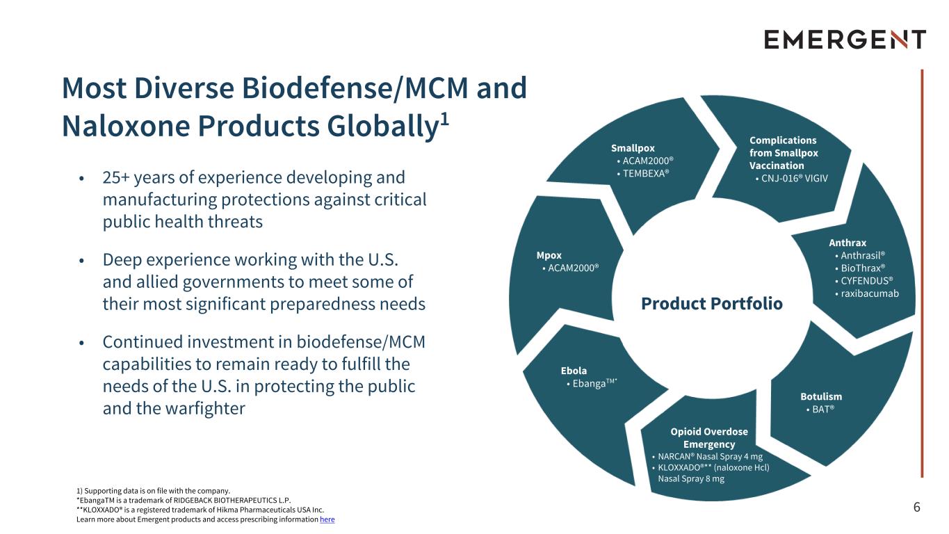 5 Combating Public Health Threats for Communities Around the World At Emergent, we help prepare for today’s health challenges and tomorrow’s threats. Our mission is to protect and save lives. Naloxone Market Leadership Global Strategic Partner to governments, NGOs and biopharma innovators Biodefense/MCM Contract Mods & Product Orders YTD Products2025 Revenue Guidance Employees $775 - $835M 11 11 900+