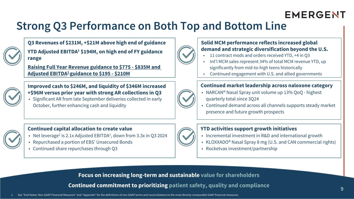 8 2025 Turnaround Goals • Pursue strategic investments that deliver stable, long-term growth • Create long-term and sustainable value for shareholders • Drive profitable growth and enhanced operational efficiency • Maintain market leadership position by identifying and distributing solutions to high priority public health threats 2026+ Transformation • Strategic transformation for long-term growth and profitability Multi-Year Transformation Plan Remains on Track, Continued Focus on Advancing Turnaround Plan