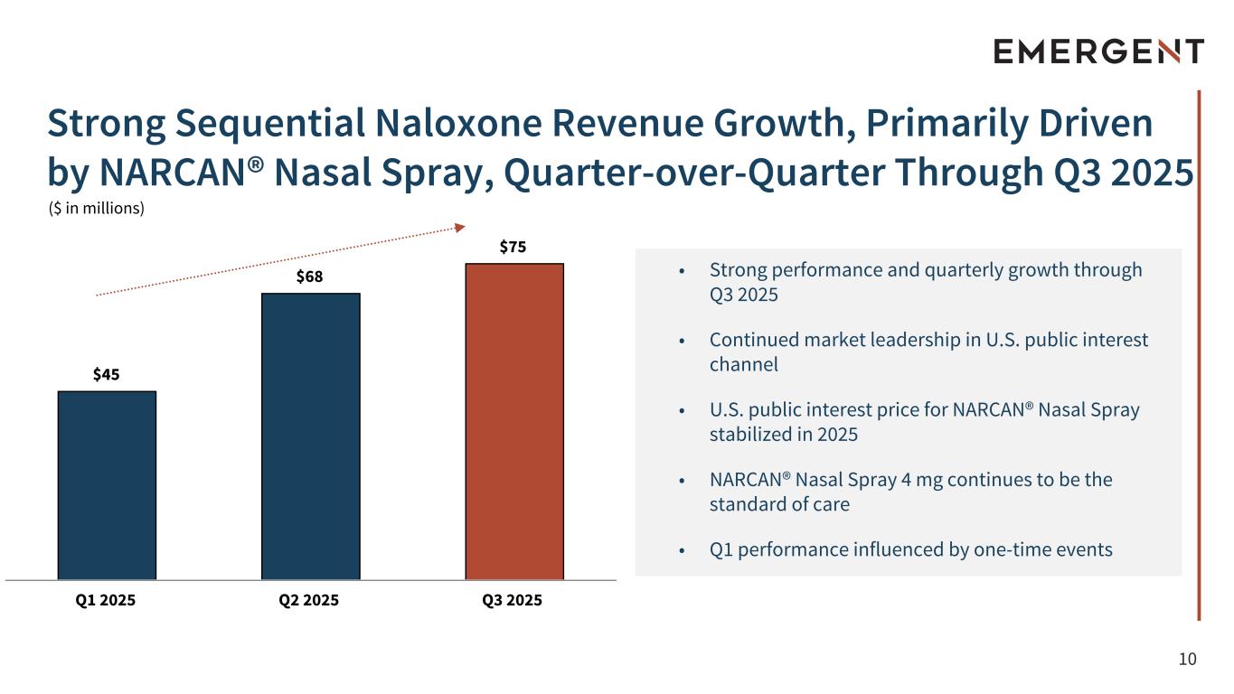 9 Solid MCM performance reflects increased global demand and strategic diversification beyond the U.S. • 11 contract mods and orders received YTD, +4 in Q3 • Int'l MCM sales represent 34% of total MCM revenue YTD, up significantly from mid-to-high teens historically • Continued engagement with U.S. and allied governments Improved cash to $246M, and liquidity of $346M increased +$96M versus prior year with strong AR collections in Q3 • Significant AR from late September deliveries collected in early October, further enhancing cash and liquidity Q3 Revenues of $231M, +$21M above high end of guidance YTD Adjusted EBITDA1 $194M, on high end of FY guidance range Raising Full Year Revenue guidance to $775 - $835M and Adjusted EBITDA1 guidance to $195 - $210M YTD activities support growth initiatives • Incremental investment in R&D and international growth • KLOXXADO® Nasal Spray 8 mg (U.S. and CAN commercial rights) • Rocketvax investment/partnership Continued capital allocation to create value • Net leverage1 is 2.1x Adjusted EBITDA1, down from 3.3x in Q3 2024 • Repurchased a portion of EBS' Unsecured Bonds • Continued share repurchases through Q3 Focus on increasing long-term and sustainable value for shareholders Continued commitment to prioritizing patient safety, quality and compliance Strong Q3 Performance on Both Top and Bottom Line Continued market leadership across naloxone category • NARCAN® Nasal Spray unit volume up 13% QoQ - highest quarterly total since 3Q24 • Continued demand across all channels supports steady market presence and future growth prospects 1. See "End Notes: Non-GAAP Financial Measures" and "Appendix" for the definitions of non-GAAP terms and reconciliations to the most directly comparable GAAP financial measures.
