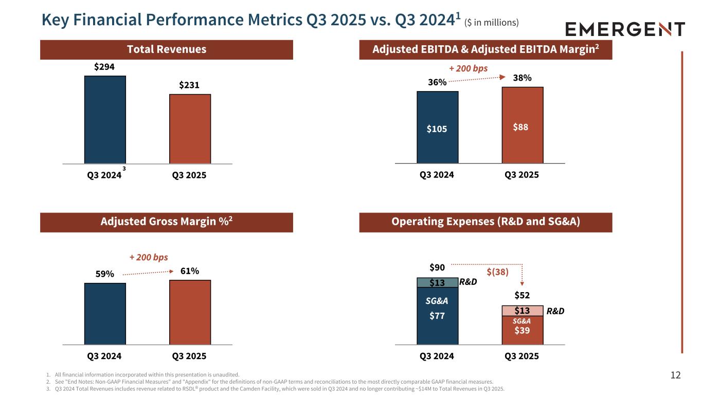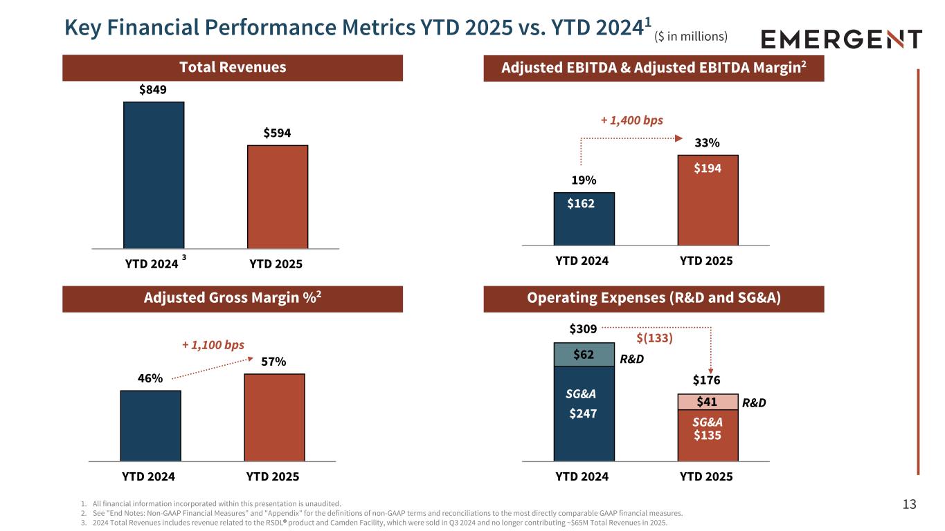 12 $90 $52 $77 $39 $13 $13 Q3 2024 Q3 2025 36% 38% Q3 2024 Q3 2025 59% 61% Q3 2024 Q3 2025 $294 $231 Q3 2024 Q3 2025 ($ in millions) 1. All financial information incorporated within this presentation is unaudited. 2. See "End Notes: Non-GAAP Financial Measures" and "Appendix" for the definitions of non-GAAP terms and reconciliations to the most directly comparable GAAP financial measures. 3. Q3 2024 Total Revenues includes revenue related to RSDL® product and the Camden Facility, which were sold in Q3 2024 and no longer contributing ~$14M to Total Revenues in Q3 2025. Total Revenues Adjusted EBITDA & Adjusted EBITDA Margin2 Adjusted Gross Margin %2 Operating Expenses (R&D and SG&A) SG&A SG&A Key Financial Performance Metrics Q3 2025 vs. Q3 20241 R&D SG&A R&D + 200 bps 3 + 200 bps $(38) $105 $88