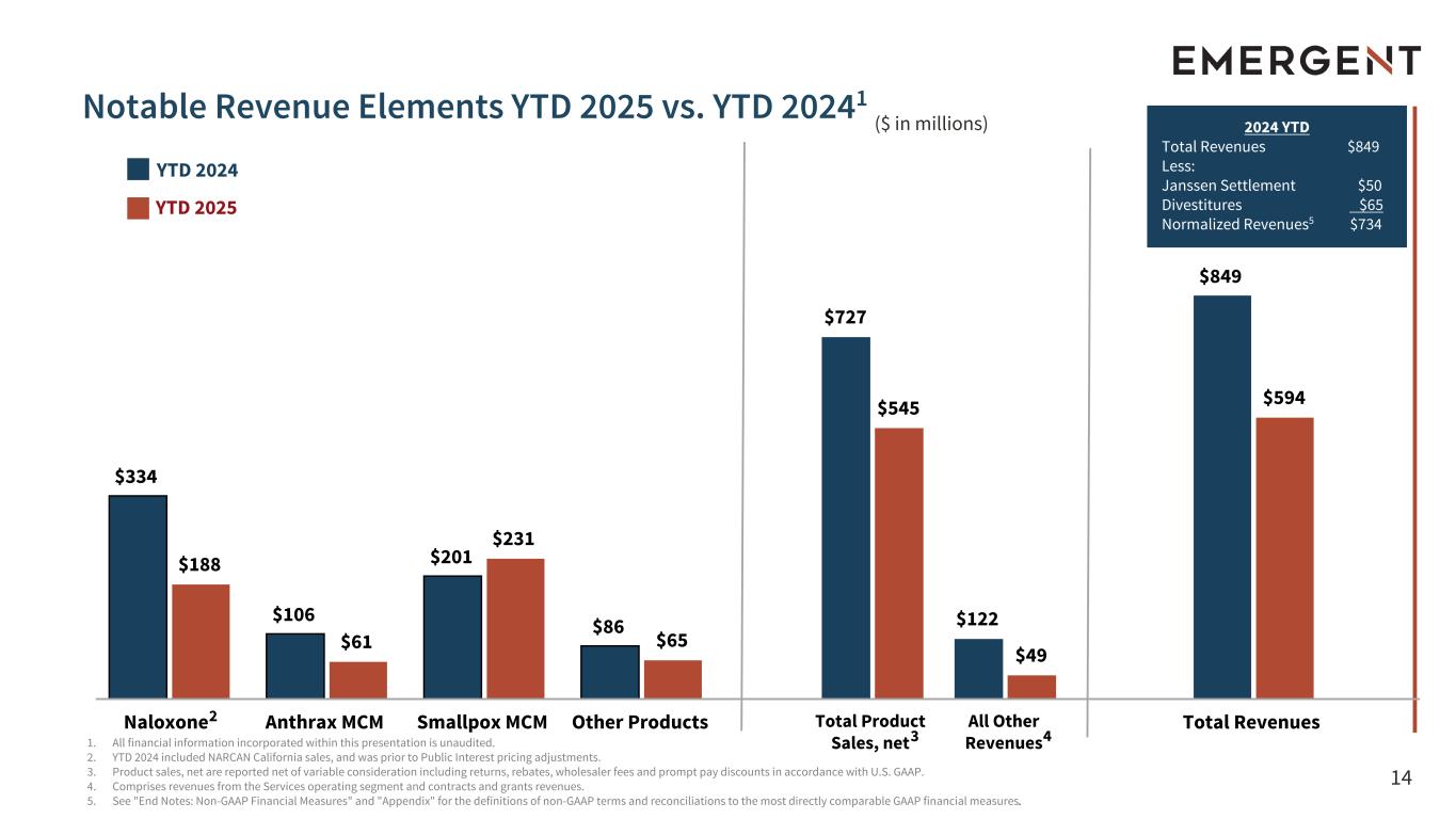 13 19% 33% YTD 2024 YTD 2025 $309 $176 $247 $135 $62 $41 YTD 2024 YTD 2025 46% 57% YTD 2024 YTD 2025 $849 $594 YTD 2024 YTD 2025 ($ in millions) 1. All financial information incorporated within this presentation is unaudited. 2. See "End Notes: Non-GAAP Financial Measures" and "Appendix" for the definitions of non-GAAP terms and reconciliations to the most directly comparable GAAP financial measures. 3. 2024 Total Revenues includes revenue related to the RSDL® product and Camden Facility, which were sold in Q3 2024 and no longer contributing ~$65M Total Revenues in 2025. Total Revenues Adjusted EBITDA & Adjusted EBITDA Margin2 Adjusted Gross Margin %2 Operating Expenses (R&D and SG&A) SG&A SG&A Key Financial Performance Metrics YTD 2025 vs. YTD 20241 R&D SG&A R&D + 1,100 bps 3 + 1,400 bps $(133) $162 $194
