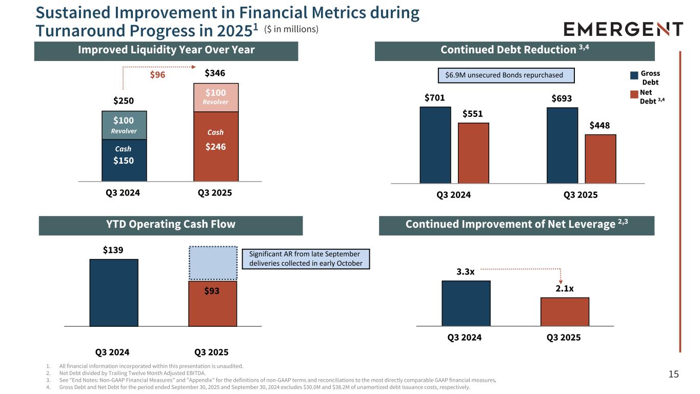 14 $334 $106 $201 $86 $188 $61 $231 $65 Naloxone Anthrax MCM Smallpox MCM Other Products $849 $594 Total Revenues $727 $122 $545 $49 Total Product Sales, net All Other Revenues1. All financial information incorporated within this presentation is unaudited. 2. YTD 2024 included NARCAN California sales, and was prior to Public Interest pricing adjustments. 3. Product sales, net are reported net of variable consideration including returns, rebates, wholesaler fees and prompt pay discounts in accordance with U.S. GAAP. 4. Comprises revenues from the Services operating segment and contracts and grants revenues. 5. See "End Notes: Non-GAAP Financial Measures" and "Appendix" for the definitions of non-GAAP terms and reconciliations to the most directly comparable GAAP financial measures. Notable Revenue Elements YTD 2025 vs. YTD 20241 YTD 2024 YTD 2025 ($ in millions) 3 4 2 2024 YTD Total Revenues $849 Less: Janssen Settlement $50 Divestitures $65 Normalized Revenues5 $734