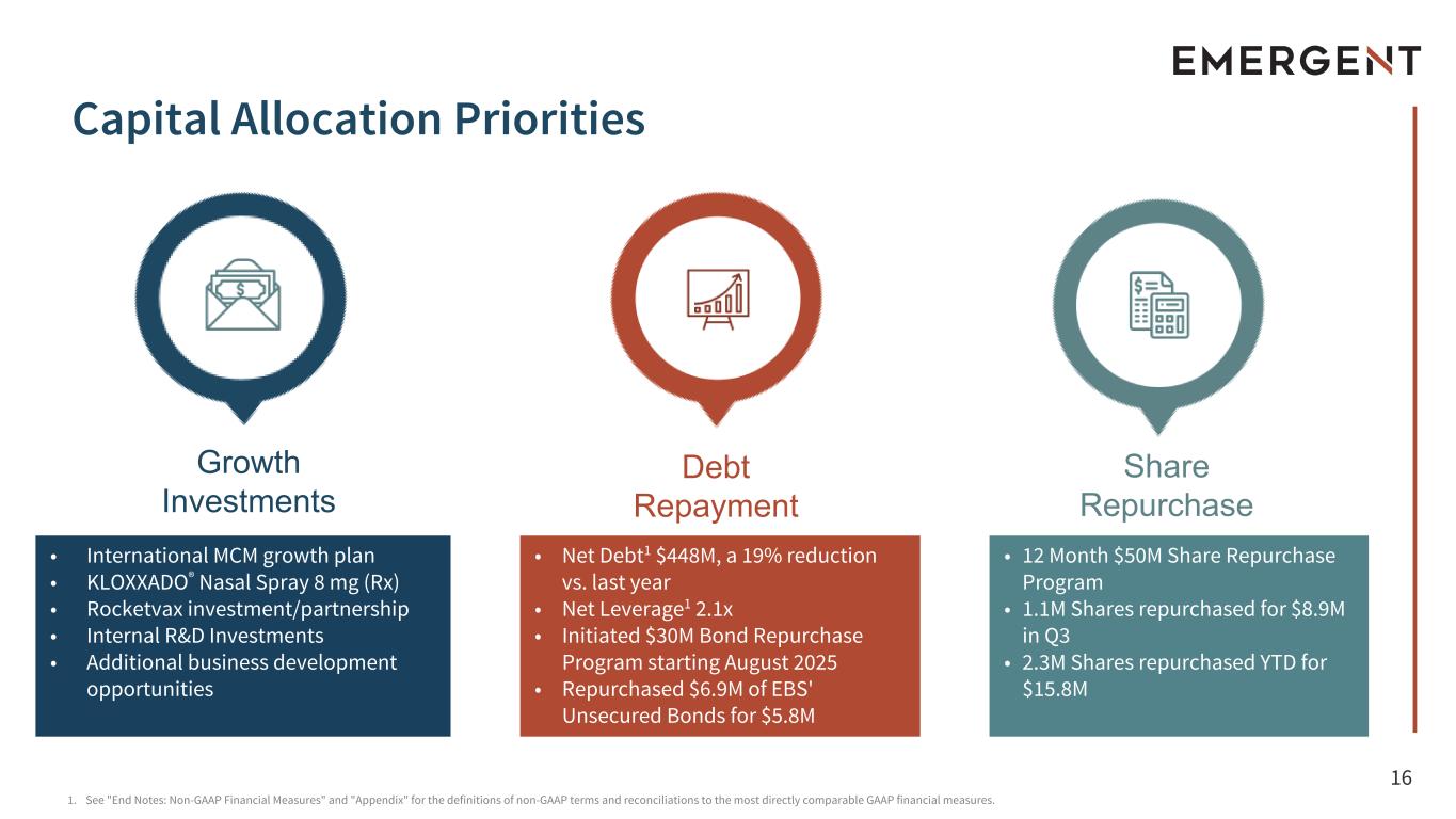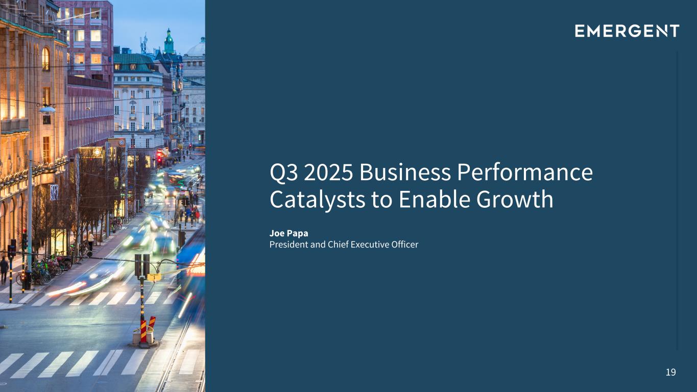 “Following a strong second quarter, we are proud to again beat the high end of our third quarter 2025 revenue guidance by $21 million, with continued margin expansion that gives us confidence in meeting the higher end of our adjusted EBITDA guidance for 2025,” said Joe Papa, president and CEO of Emergent. “We remain confident in our products business as evidenced by the sequential growth of our naloxone franchise, where pricing has stabilized for NARCAN® Nasal Spray, as well as continued demand from our international customers, who represent 34% of our medical countermeasures orders year to date. The Company has now secured eleven MCM contract modifications and product orders in 2025, highlighting the consistent global demand for medical countermeasures products, in a world where biological threats represent a growing risk. Our balance sheet is healthy, and we are judiciously deploying our capital to create shareholder value and build a long-term growth trajectory.”