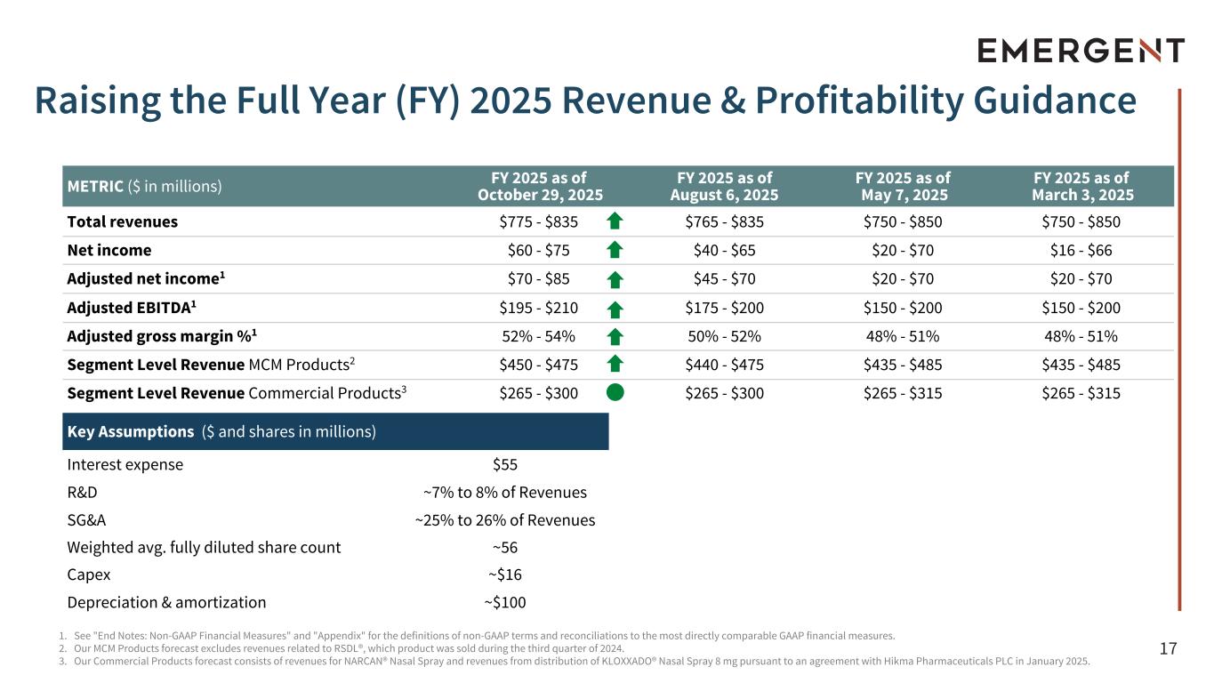 16 Capital Allocation Priorities Share Repurchase Growth Investments Debt Repayment • 12 Month $50M Share Repurchase Program • 1.1M Shares repurchased for $8.9M in Q3 • 2.3M Shares repurchased YTD for $15.8M • Net Debt1 $448M, a 19% reduction vs. last year • Net Leverage1 2.1x • Initiated $30M Bond Repurchase Program starting August 2025 • Repurchased $6.9M of EBS' Unsecured Bonds for $5.8M 1. See "End Notes: Non-GAAP Financial Measures" and "Appendix" for the definitions of non-GAAP terms and reconciliations to the most directly comparable GAAP financial measures. • International MCM growth plan • KLOXXADO® Nasal Spray 8 mg (Rx) • Rocketvax investment/partnership • Internal R&D Investments • Additional business development opportunities
