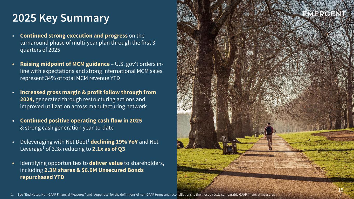 17 METRIC ($ in millions) FY 2025 as of October 29, 2025 FY 2025 as of August 6, 2025 FY 2025 as of May 7, 2025 FY 2025 as of March 3, 2025 Total revenues $775 - $835 $765 - $835 $750 - $850 $750 - $850 Net income $60 - $75 $40 - $65 $20 - $70 $16 - $66 Adjusted net income1 $70 - $85 $45 - $70 $20 - $70 $20 - $70 Adjusted EBITDA1 $195 - $210 $175 - $200 $150 - $200 $150 - $200 Adjusted gross margin %1 52% - 54% 50% - 52% 48% - 51% 48% - 51% Segment Level Revenue MCM Products2 $450 - $475 $440 - $475 $435 - $485 $435 - $485 Segment Level Revenue Commercial Products3 $265 - $300 $265 - $300 $265 - $315 $265 - $315 Key Assumptions ($ and shares in millions) Interest expense $55 R&D ~7% to 8% of Revenues SG&A ~25% to 26% of Revenues Weighted avg. fully diluted share count ~56 Capex ~$16 Depreciation & amortization ~$100 1. See "End Notes: Non-GAAP Financial Measures" and "Appendix" for the definitions of non-GAAP terms and reconciliations to the most directly comparable GAAP financial measures. 2. Our MCM Products forecast excludes revenues related to RSDL®, which product was sold during the third quarter of 2024. 3. Our Commercial Products forecast consists of revenues for NARCAN® Nasal Spray and revenues from distribution of KLOXXADO® Nasal Spray 8 mg pursuant to an agreement with Hikma Pharmaceuticals PLC in January 2025. Raising the Full Year (FY) 2025 Revenue & Profitability Guidance