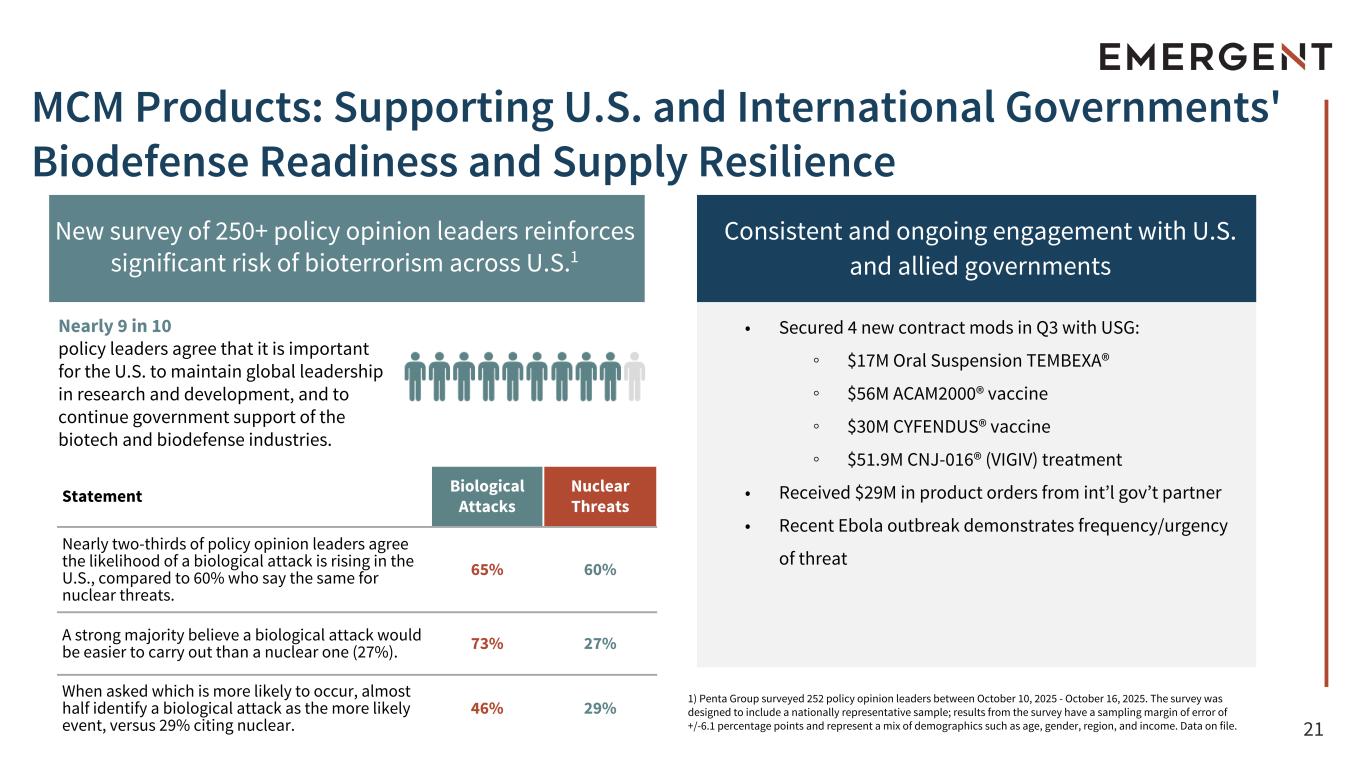 20 • New Harris poll of 1,230 parents in the U.S. found just one in five parents reported having naloxone on hand in the event of an overdose1 • While many factors are driving the reduction in opioid overdose deaths since 2023-2024, third-party sources have associated the timing and introduction of OTC NARCAN® Nasal Spray with this decline2 • $50+B in total reported opioid settlement dollars; ongoing support from Federal and State support programs • Leading the fight through continued investments in awareness initiatives to help reduce opioid overdose deaths • Market-leading offerings, e.g. NARCANDirect®, continue to command differentiated capabilities; platform now features KLOXXADO® Nasal Spray and Convenience Kits • Continued partnership with National Safety Council (NSC); received the NSC Green Cross Advocate for Safety Award, alongside Amazon • Announced new Global Workplace Tool Kit with the Penington Institute Naloxone Business: Leading With Purpose to Help Save Lives 1. Victoria’s Voice Foundation Release, accessed October 17, 2025: https://victoriasvoice.foundation/research/new-national- survey-reveals-continued-need-to-connect-parents-with-vital-prevention-education-and-awareness/ 2. Washington Post, Opinion | Purdue Pharma’s $7.4 billion settlement should go toward Narcan