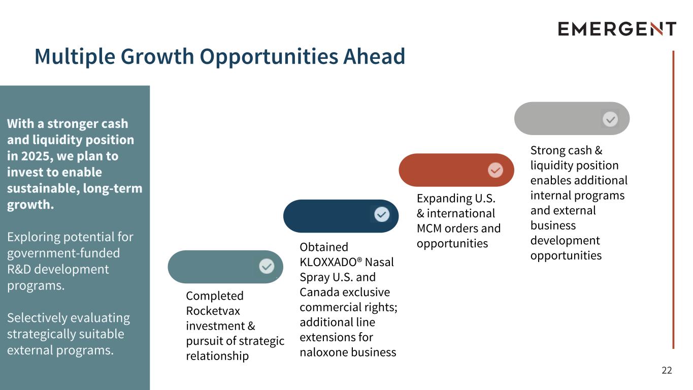 21 MCM Products: Supporting U.S. and International Governments' Biodefense Readiness and Supply Resilience New survey of 250+ policy opinion leaders reinforces significant risk of bioterrorism across U.S.1 Consistent and ongoing engagement with U.S. and allied governments • Secured 4 new contract mods in Q3 with USG: ◦ $17M Oral Suspension TEMBEXA® ◦ $56M ACAM2000® vaccine ◦ $30M CYFENDUS® vaccine ◦ $51.9M CNJ-016® (VIGIV) treatment • Received $29M in product orders from int’l gov’t partner • Recent Ebola outbreak demonstrates frequency/urgency of threat 1) Penta Group surveyed 252 policy opinion leaders between October 10, 2025 - October 16, 2025. The survey was designed to include a nationally representative sample; results from the survey have a sampling margin of error of +/-6.1 percentage points and represent a mix of demographics such as age, gender, region, and income. Data on file. Nearly 9 in 10 policy leaders agree that it is important for the U.S. to maintain global leadership in research and development, and to continue government support of the biotech and biodefense industries. Statement Biological Attacks Nuclear Threats Nearly two-thirds of policy opinion leaders agree the likelihood of a biological attack is rising in the U.S., compared to 60% who say the same for nuclear threats. 65% 60% A strong majority believe a biological attack would be easier to carry out than a nuclear one (27%). 73% 27% When asked which is more likely to occur, almost half identify a biological attack as the more likely event, versus 29% citing nuclear. 46% 29%