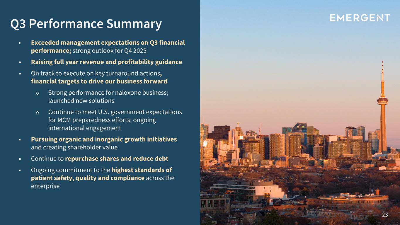 22 Multiple Growth Opportunities Ahead With a stronger cash and liquidity position in 2025, we plan to invest to enable sustainable, long-term growth. Exploring potential for government-funded R&D development programs. Selectively evaluating strategically suitable external programs. Completed Rocketvax investment & pursuit of strategic relationship Obtained KLOXXADO® Nasal Spray U.S. and Canada exclusive commercial rights; additional line extensions for naloxone business Expanding U.S. & international MCM orders and opportunities Strong cash & liquidity position enables additional internal programs and external business development opportunities