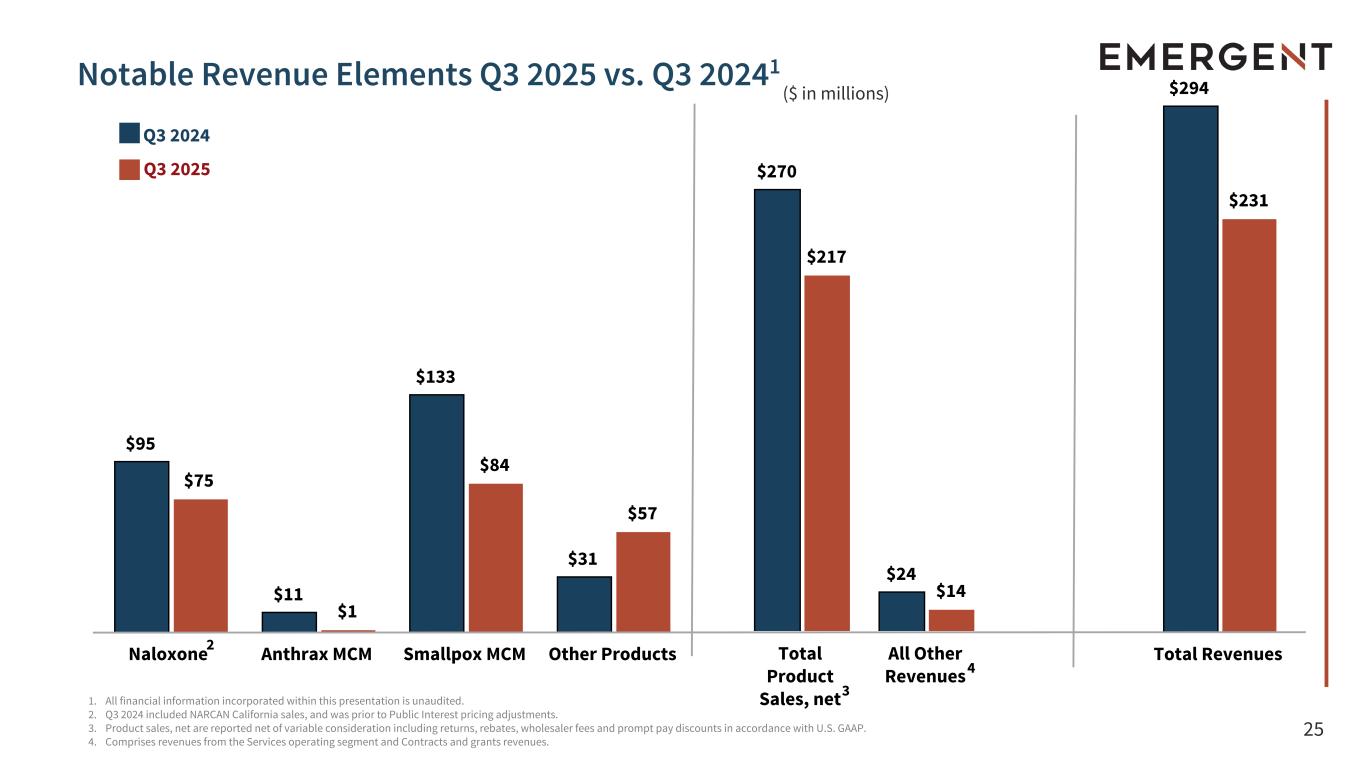 25 $95 $11 $133 $31 $75 $1 $84 $57 Naloxone Anthrax MCM Smallpox MCM Other Products $294 $231 Total Revenues $270 $24 $217 $14 Total Product Sales, net All Other Revenues 1. All financial information incorporated within this presentation is unaudited. 2. Q3 2024 included NARCAN California sales, and was prior to Public Interest pricing adjustments. 3. Product sales, net are reported net of variable consideration including returns, rebates, wholesaler fees and prompt pay discounts in accordance with U.S. GAAP. 4. Comprises revenues from the Services operating segment and Contracts and grants revenues. Notable Revenue Elements Q3 2025 vs. Q3 20241 Q3 2024 Q3 2025 ($ in millions) 3 4 2