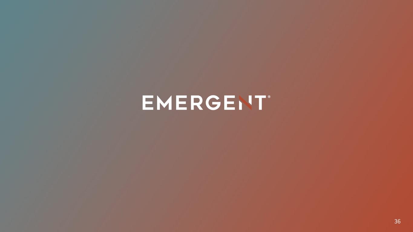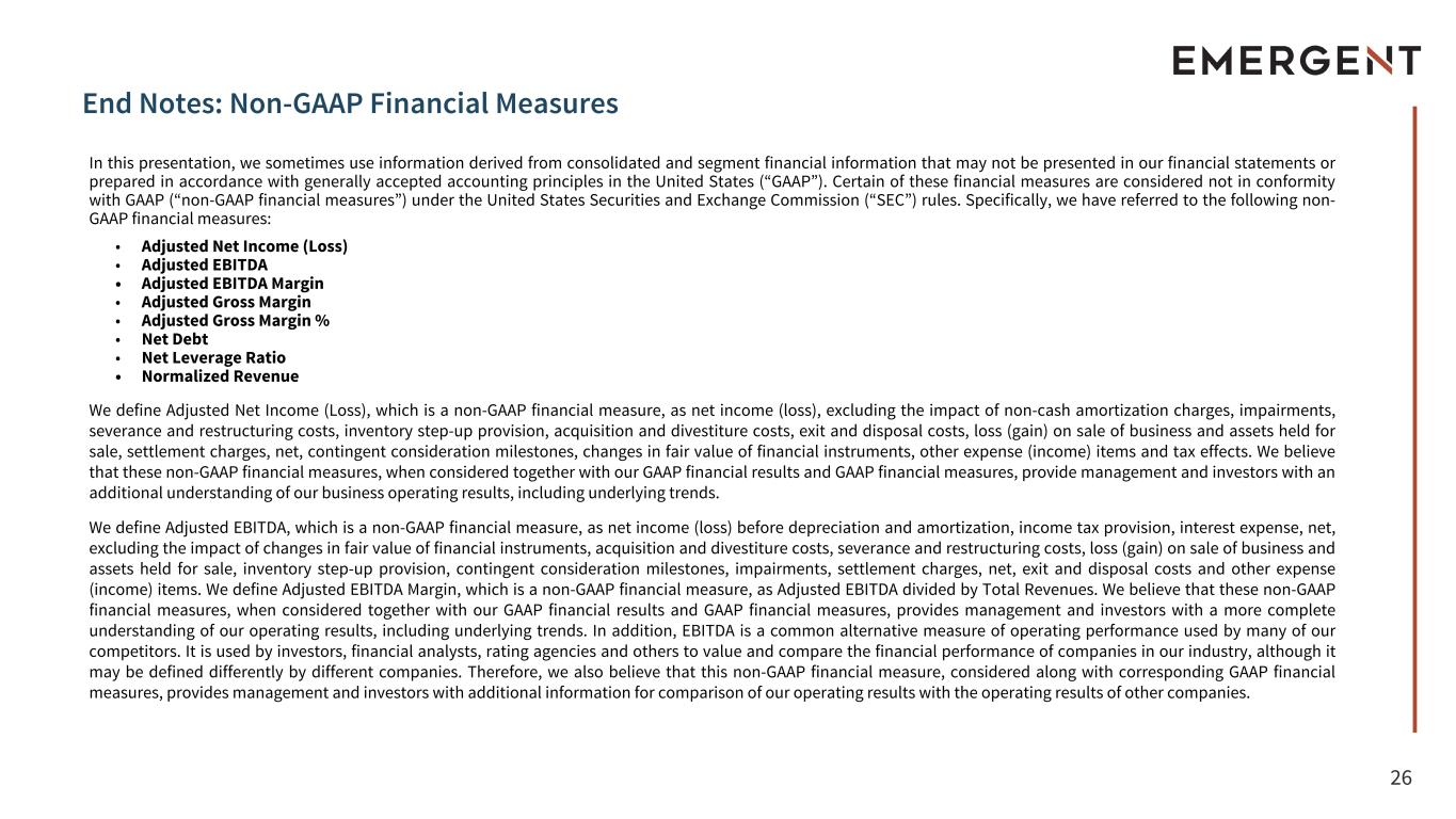 27 End Notes: Non-GAAP Financial Measures (Continued) We define Adjusted Gross Margin, which is a non-GAAP financial measure, as Gross Margin, excluding the impact of intangible asset amortization, restructuring costs, changes in the fair value of financial instruments, settlement charge, net and inventory step-up provision. We define Adjusted Gross Margin %, which is a non-GAAP financial measure, as Adjusted Gross Margin as a percentage of Products and services sales, net. We define Net Debt, which is a non-GAAP financial measure, as our total debt less our cash and cash equivalents. We believe this non-GAAP financial measure, when considered together with our GAAP financial results, provides management and investors with an additional understanding of the Company's ability to pay its debts. We define Net Leverage Ratio, which is a non-GAAP financial measure, as our Net Debt divided by our Trailing Twelve Month Adjusted EBITDA. We believe this non-GAAP financial measure, when considered together with our GAAP financial results, provides management and investors with an additional understanding of the Company's current borrowing capabilities. We define Normalized Revenues which is a non-GAAP financial measure, as the Total Revenues, less non-recurring revenue related to the Janssen settlement and divestitures of RSDL® and Camden. We believe this non-GAAP financial measure, when considered together with our GAAP financial results, provides management and investors with an additional understanding of the Company's revenues. Non-GAAP financial measures are not defined in the same manner by all companies and may not be comparable with other similarly titled measures of other companies. The determination of the amounts that are excluded from these non-GAAP financial measures are a matter of management judgment and depend upon, among other factors, the nature of the underlying expense or income amounts. Because non-GAAP financial measures exclude the effect of items that will increase or decrease the Company’s reported results of operations, management strongly encourages investors to review the Company’s consolidated financial statements and publicly filed reports in their entirety. For additional information on the non-GAAP financial measures noted here, please refer to the reconciliation tables provide in the Appendix to this presentation as well as the associated press release which can be found on the Company’s website at www.emergentbiosolutions.com.