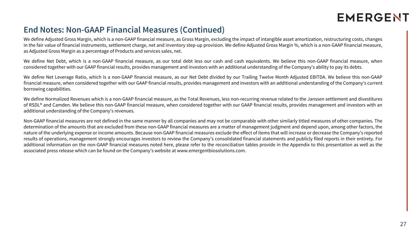 26 End Notes: Non-GAAP Financial Measures In this presentation, we sometimes use information derived from consolidated and segment financial information that may not be presented in our financial statements or prepared in accordance with generally accepted accounting principles in the United States (“GAAP”). Certain of these financial measures are considered not in conformity with GAAP (“non-GAAP financial measures”) under the United States Securities and Exchange Commission (“SEC”) rules. Specifically, we have referred to the following non- GAAP financial measures: • Adjusted Net Income (Loss) • Adjusted EBITDA • Adjusted EBITDA Margin • Adjusted Gross Margin • Adjusted Gross Margin % • Net Debt • Net Leverage Ratio • Normalized Revenue We define Adjusted Net Income (Loss), which is a non-GAAP financial measure, as net income (loss), excluding the impact of non-cash amortization charges, impairments, severance and restructuring costs, inventory step-up provision, acquisition and divestiture costs, exit and disposal costs, loss (gain) on sale of business and assets held for sale, settlement charges, net, contingent consideration milestones, changes in fair value of financial instruments, other expense (income) items and tax effects. We believe that these non-GAAP financial measures, when considered together with our GAAP financial results and GAAP financial measures, provide management and investors with an additional understanding of our business operating results, including underlying trends. We define Adjusted EBITDA, which is a non-GAAP financial measure, as net income (loss) before depreciation and amortization, income tax provision, interest expense, net, excluding the impact of changes in fair value of financial instruments, acquisition and divestiture costs, severance and restructuring costs, loss (gain) on sale of business and assets held for sale, inventory step-up provision, contingent consideration milestones, impairments, settlement charges, net, exit and disposal costs and other expense (income) items. We define Adjusted EBITDA Margin, which is a non-GAAP financial measure, as Adjusted EBITDA divided by Total Revenues. We believe that these non-GAAP financial measures, when considered together with our GAAP financial results and GAAP financial measures, provides management and investors with a more complete understanding of our operating results, including underlying trends. In addition, EBITDA is a common alternative measure of operating performance used by many of our competitors. It is used by investors, financial analysts, rating agencies and others to value and compare the financial performance of companies in our industry, although it may be defined differently by different companies. Therefore, we also believe that this non-GAAP financial measure, considered along with corresponding GAAP financial measures, provides management and investors with additional information for comparison of our operating results with the operating results of other companies.