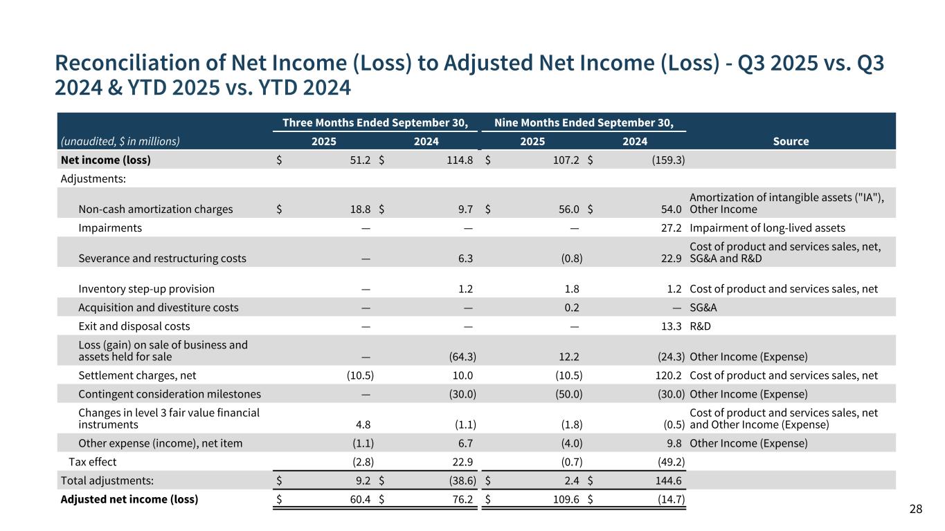 Reconciliation of Net Income (Loss) to Adjusted Net Income (Loss) - Q3 2025 vs. Q3 2024 & YTD 2025 vs. YTD 2024 28 (unaudited, $ in millions) Three Months Ended September 30, Nine Months Ended September 30, 2025 2024 2025 2024 Source Net income (loss) $ 51.2 $ 114.8 $ 107.2 $ (159.3) Adjustments: Non-cash amortization charges $ 18.8 $ 9.7 $ 56.0 $ 54.0 Amortization of intangible assets ("IA"), Other Income Impairments — — — 27.2 Impairment of long-lived assets Severance and restructuring costs — 6.3 (0.8) 22.9 Cost of product and services sales, net, SG&A and R&D Inventory step-up provision — 1.2 1.8 1.2 Cost of product and services sales, net Acquisition and divestiture costs — — 0.2 — SG&A Exit and disposal costs — — — 13.3 R&D Loss (gain) on sale of business and assets held for sale — (64.3) 12.2 (24.3) Other Income (Expense) Settlement charges, net (10.5) 10.0 (10.5) 120.2 Cost of product and services sales, net Contingent consideration milestones — (30.0) (50.0) (30.0) Other Income (Expense) Changes in level 3 fair value financial instruments 4.8 (1.1) (1.8) (0.5) Cost of product and services sales, net and Other Income (Expense) Other expense (income), net item (1.1) 6.7 (4.0) 9.8 Other Income (Expense) Tax effect (2.8) 22.9 (0.7) (49.2) Total adjustments: $ 9.2 $ (38.6) $ 2.4 $ 144.6 Adjusted net income (loss) $ 60.4 $ 76.2 $ 109.6 $ (14.7)