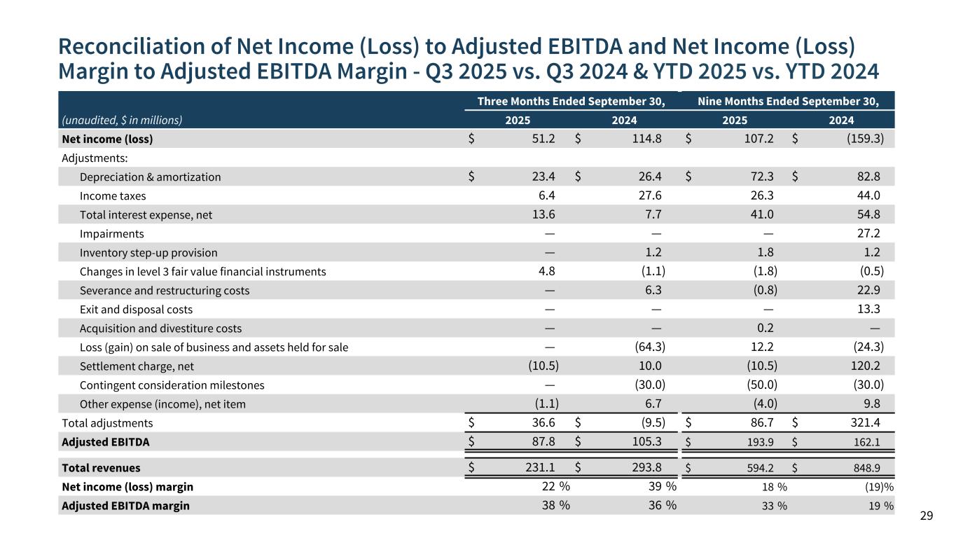 Reconciliation of Net Income (Loss) to Adjusted EBITDA and Net Income (Loss) Margin to Adjusted EBITDA Margin - Q3 2025 vs. Q3 2024 & YTD 2025 vs. YTD 2024 29 (unaudited, $ in millions) Three Months Ended September 30, Nine Months Ended September 30, 2025 2024 2025 2024 Net income (loss) $ 51.2 $ 114.8 $ 107.2 $ (159.3) Adjustments: Depreciation & amortization $ 23.4 $ 26.4 $ 72.3 $ 82.8 Income taxes 6.4 27.6 26.3 44.0 Total interest expense, net 13.6 7.7 41.0 54.8 Impairments — — — 27.2 Inventory step-up provision — 1.2 1.8 1.2 Changes in level 3 fair value financial instruments 4.8 (1.1) (1.8) (0.5) Severance and restructuring costs — 6.3 (0.8) 22.9 Exit and disposal costs — — — 13.3 Acquisition and divestiture costs — — 0.2 — Loss (gain) on sale of business and assets held for sale — (64.3) 12.2 (24.3) Settlement charge, net (10.5) 10.0 (10.5) 120.2 Contingent consideration milestones — (30.0) (50.0) (30.0) Other expense (income), net item (1.1) 6.7 (4.0) 9.8 Total adjustments $ 36.6 $ (9.5) $ 86.7 $ 321.4 Adjusted EBITDA $ 87.8 $ 105.3 $ 193.9 $ 162.1 Total revenues $ 231.1 $ 293.8 $ 594.2 $ 848.9 Net income (loss) margin 22 % 39 % 18 % (19) % Adjusted EBITDA margin 38 % 36 % 33 % 19 %