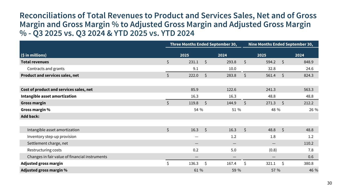 Reconciliations of Total Revenues to Product and Services Sales, Net and of Gross Margin and Gross Margin % to Adjusted Gross Margin and Adjusted Gross Margin % - Q3 2025 vs. Q3 2024 & YTD 2025 vs. YTD 2024 30 APPENDIX Three Months Ended September 30, Nine Months Ended September 30, ($ in millions) 2025 2024 2025 2024 Total revenues $ 231.1 $ 293.8 $ 594.2 $ 848.9 Contracts and grants 9.1 10.0 32.8 24.6 Product and services sales, net $ 222.0 $ 283.8 $ 561.4 $ 824.3 Cost of product and services sales, net 85.9 122.6 241.3 563.3 Intangible asset amortization 16.3 16.3 48.8 48.8 Gross margin $ 119.8 $ 144.9 $ 271.3 $ 212.2 Gross margin % 54 % 51 % 48 % 26 % Add back: Intangible asset amortization $ 16.3 $ 16.3 $ 48.8 $ 48.8 Inventory step-up provision — 1.2 1.8 1.2 Settlement charge, net — — — 110.2 Restructuring costs 0.2 5.0 (0.8) 7.8 Changes in fair value of financial instruments — — — 0.6 Adjusted gross margin $ 136.3 $ 167.4 $ 321.1 $ 380.8 Adjusted gross margin % 61 % 59 % 57 % 46 %