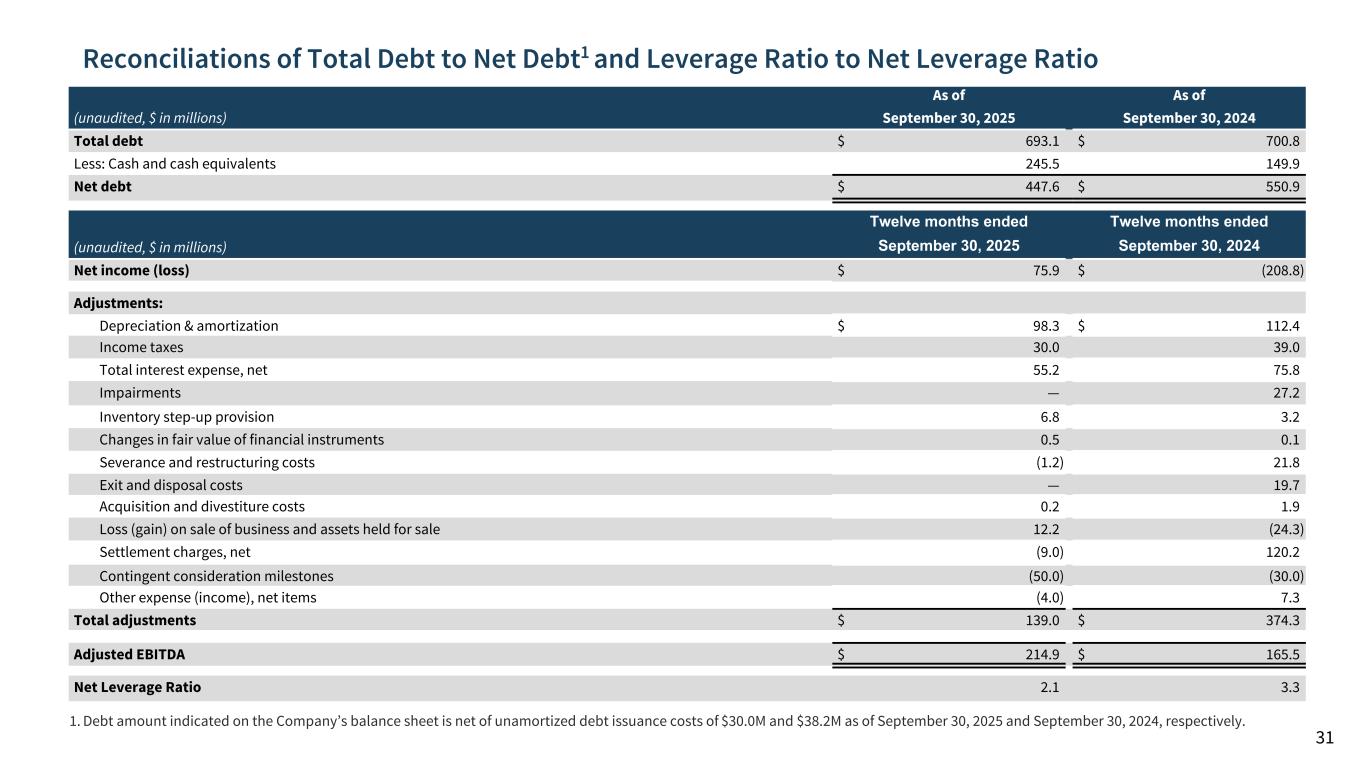 Reconciliations of Total Debt to Net Debt1 and Leverage Ratio to Net Leverage Ratio 31 (unaudited, $ in millions) As of As of September 30, 2025 September 30, 2024 Total debt $ 693.1 $ 700.8 Less: Cash and cash equivalents 245.5 149.9 Net debt $ 447.6 $ 550.9 Twelve months ended Twelve months ended (unaudited, $ in millions) September 30, 2025 September 30, 2024 Net income (loss) $ 75.9 $ (208.8) Adjustments: Depreciation & amortization $ 98.3 $ 112.4 Income taxes 30.0 39.0 Total interest expense, net 55.2 75.8 Impairments — 27.2 Inventory step-up provision 6.8 3.2 Changes in fair value of financial instruments 0.5 0.1 Severance and restructuring costs (1.2) 21.8 Exit and disposal costs — 19.7 Acquisition and divestiture costs 0.2 1.9 Loss (gain) on sale of business and assets held for sale 12.2 (24.3) Settlement charges, net (9.0) 120.2 Contingent consideration milestones (50.0) (30.0) Other expense (income), net items (4.0) 7.3 Total adjustments $ 139.0 $ 374.3 Adjusted EBITDA $ 214.9 $ 165.5 Net Leverage Ratio 2.1 3.3 1. Debt amount indicated on the Company’s balance sheet is net of unamortized debt issuance costs of $30.0M and $38.2M as of September 30, 2025 and September 30, 2024, respectively.