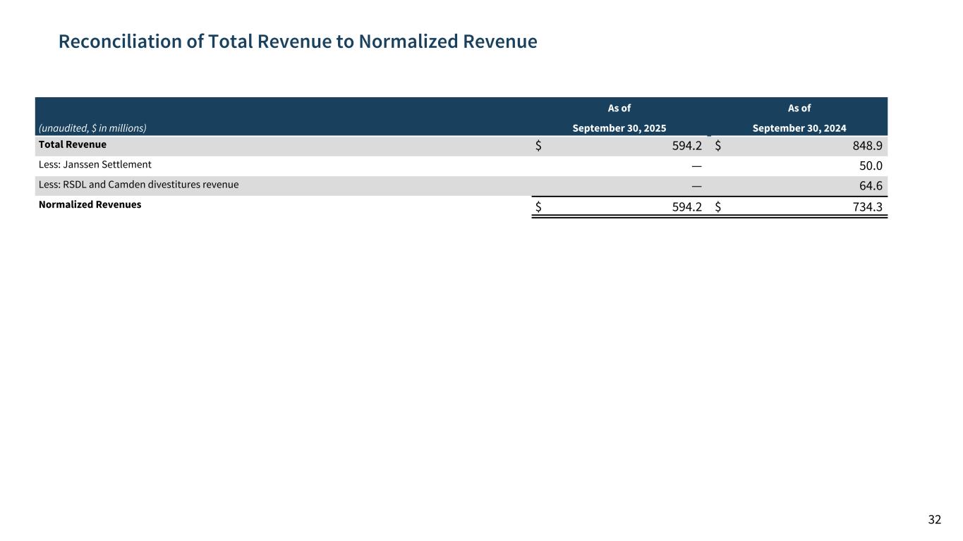 32 Reconciliation of Total Revenue to Normalized Revenue (unaudited, $ in millions) As of As of September 30, 2025 September 30, 2024 Total Revenue $ 594.2 $ 848.9 Less: Janssen Settlement — 50.0 Less: RSDL and Camden divestitures revenue — 64.6 Normalized Revenues $ 594.2 $ 734.3