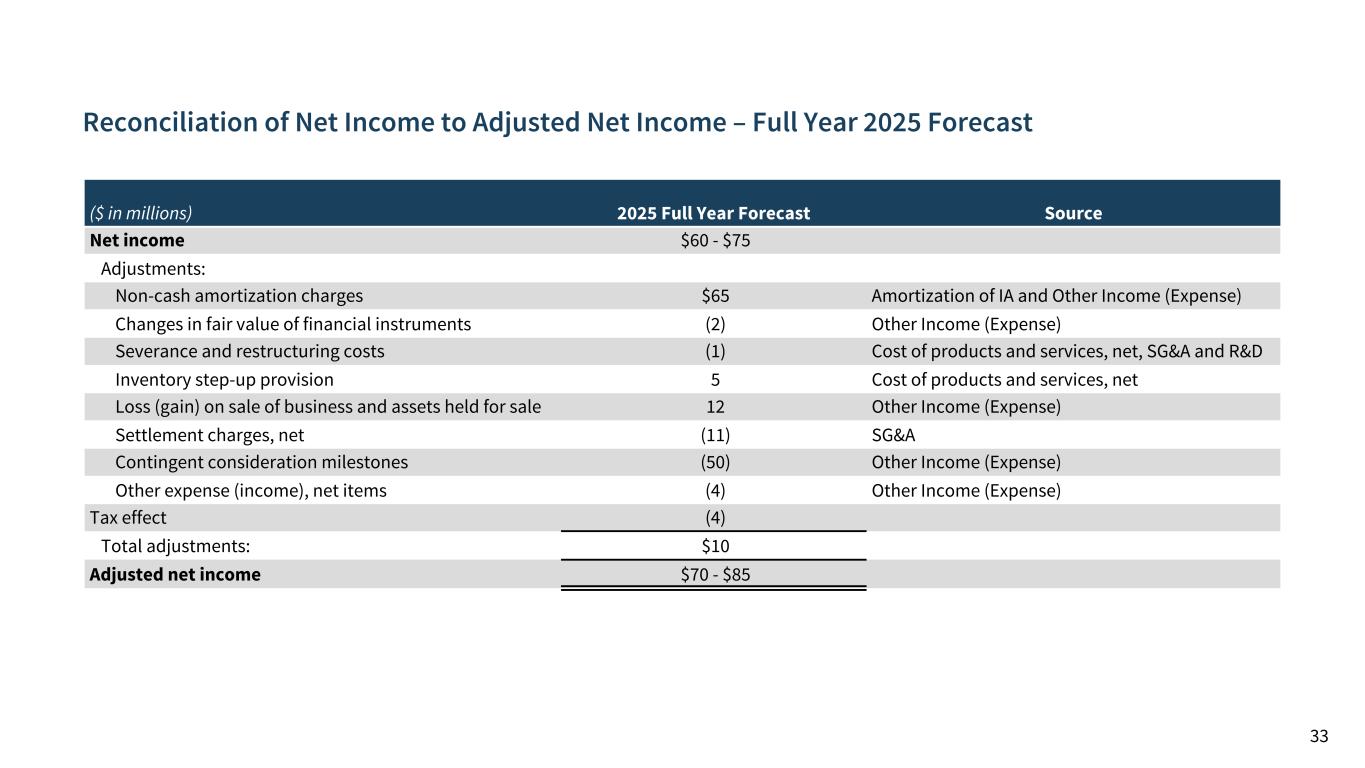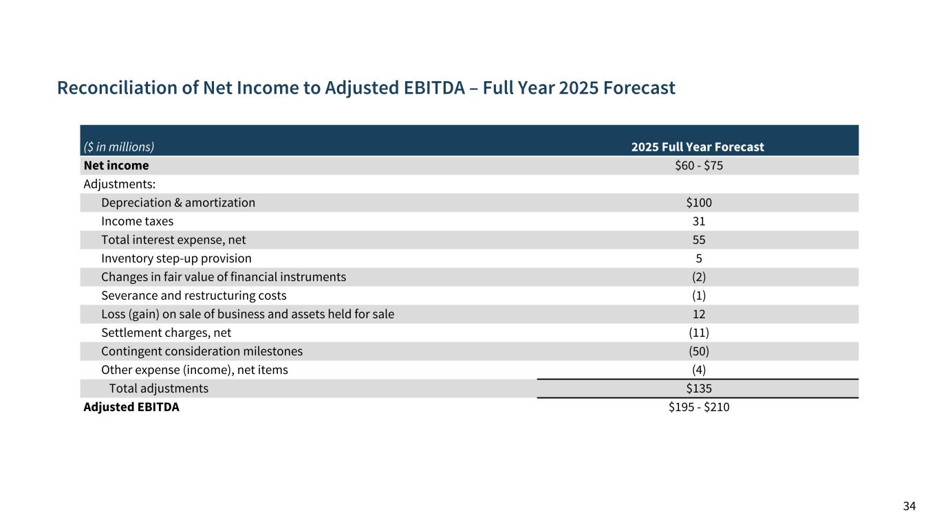 Reconciliation of Net Income to Adjusted Net Income – Full Year 2025 Forecast 33 ($ in millions) 2025 Full Year Forecast Source Net income $60 - $75 Adjustments: Non-cash amortization charges $65 Amortization of IA and Other Income (Expense) Changes in fair value of financial instruments (2) Other Income (Expense) Severance and restructuring costs (1) Cost of products and services, net, SG&A and R&D Inventory step-up provision 5 Cost of products and services, net Loss (gain) on sale of business and assets held for sale 12 Other Income (Expense) Settlement charges, net (11) SG&A Contingent consideration milestones (50) Other Income (Expense) Other expense (income), net items (4) Other Income (Expense) Tax effect (4) Total adjustments: $10 Adjusted net income $70 - $85