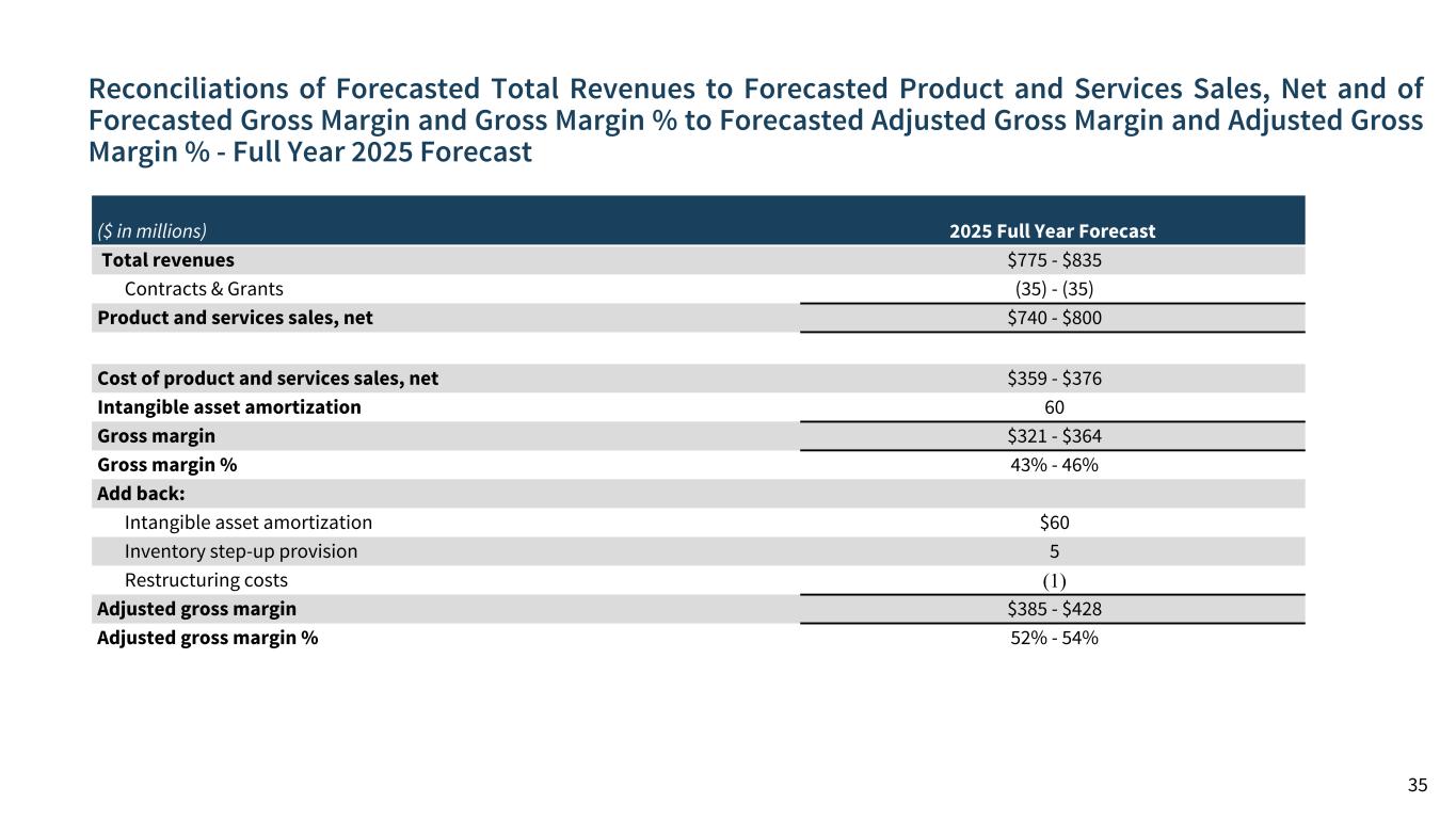Reconciliation of Net Income to Adjusted EBITDA – Full Year 2025 Forecast 34 ($ in millions) 2025 Full Year Forecast Net income $60 - $75 Adjustments: Depreciation & amortization $100 Income taxes 31 Total interest expense, net 55 Inventory step-up provision 5 Changes in fair value of financial instruments (2) Severance and restructuring costs (1) Loss (gain) on sale of business and assets held for sale 12 Settlement charges, net (11) Contingent consideration milestones (50) Other expense (income), net items (4) Total adjustments $135 Adjusted EBITDA $195 - $210