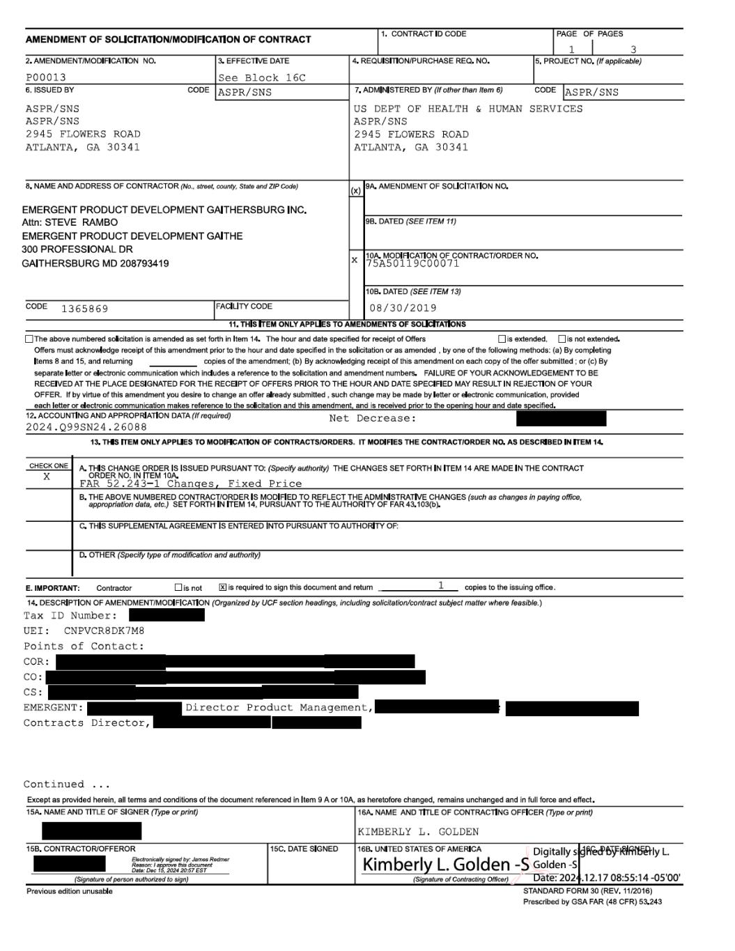 On June 20, 2024, Cangene bioPharma LLC (“Cangene”), a subsidiary of the Company (together with Cangene, the “Seller”), entered into an Asset Purchase Agreement with Bora, under which the Seller sold its drug product facility in Baltimore-Camden for a cash purchase price of approximately $35.0 million. The transaction closed on August 20, 2024.
