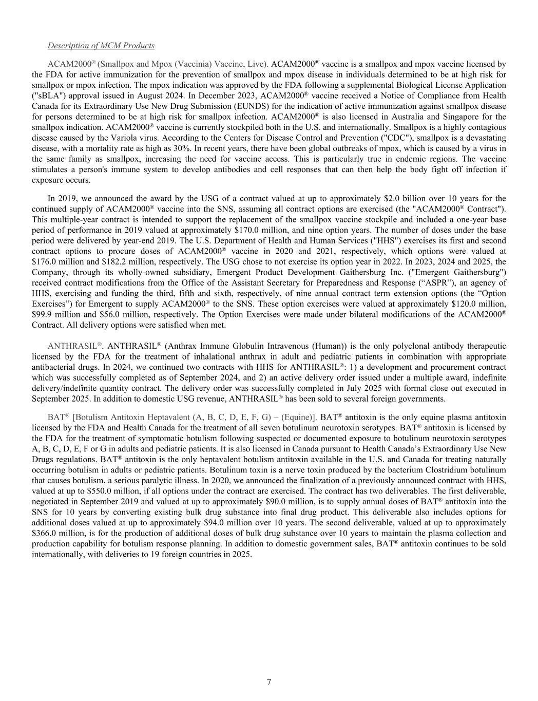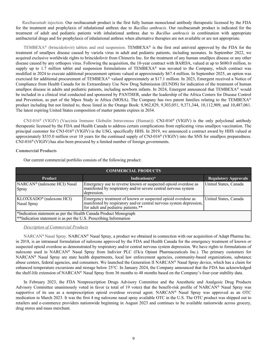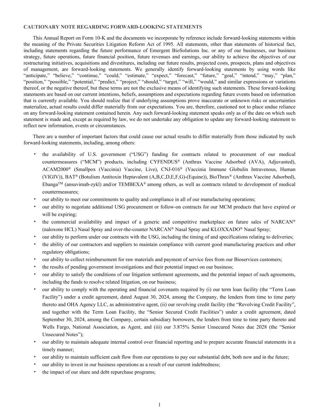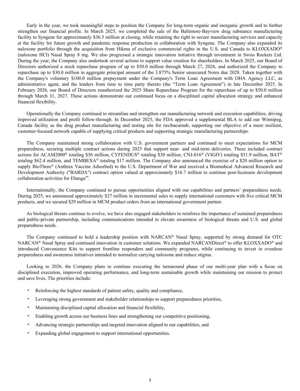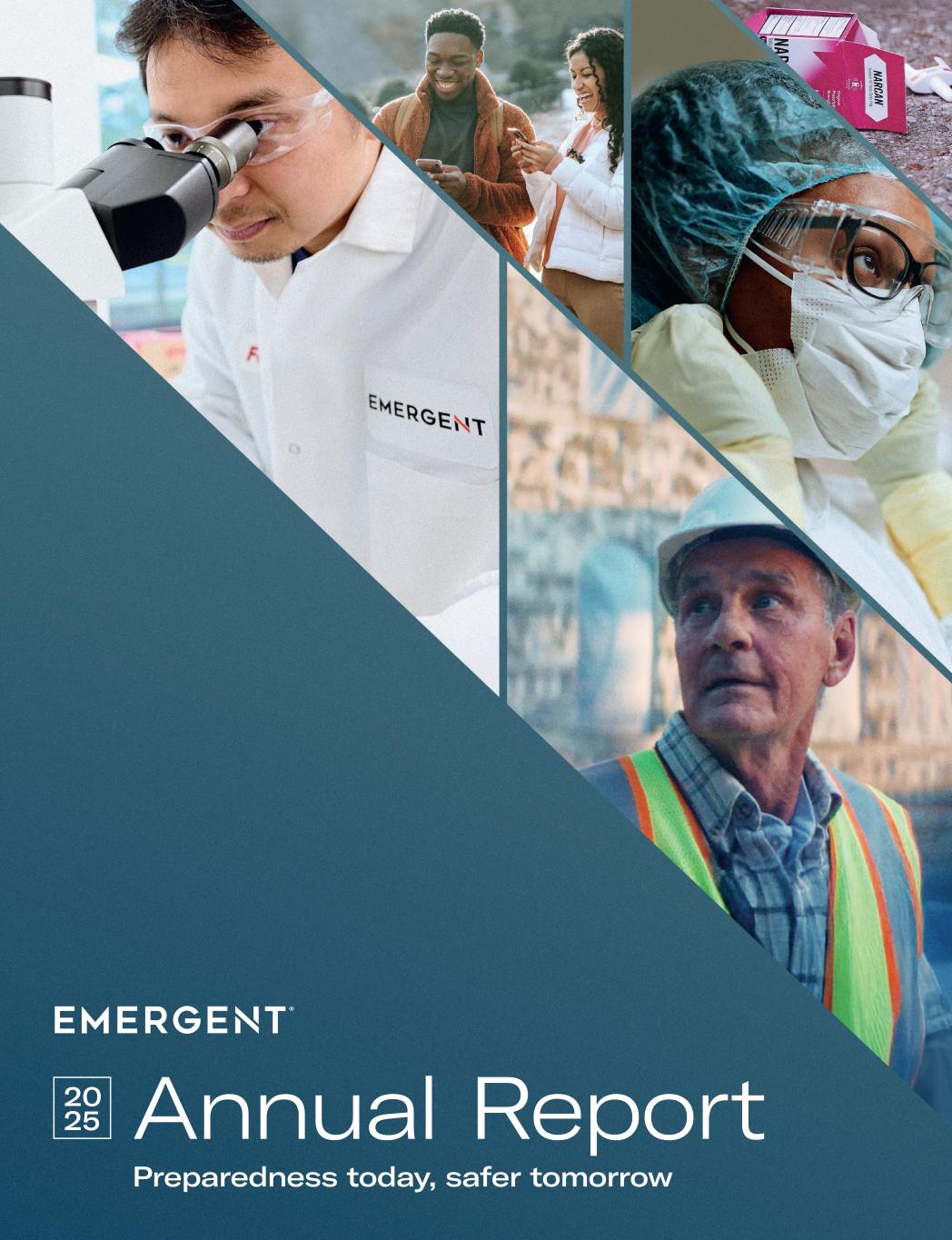 Dear Fellow Shareholders, In 2025, we made meaningful progress toward our multi-year strategy to turnaround and transform Emergent. As we continue our transformation journey, we remain committed to our mission to protect and save lives, while prioritizing patient safety, quality and compliance and advancing the operational and strategic priorities essential to long-term growth. This year we took important steps to strengthen our financial position through a customer- focused, lean and efficient business model, strong operating results, margin improvements and significant debt repayment. These actions, combined with the strategic divestitures and operational initiatives executed in 2024, enhanced our balance sheet and reinforced the foundation needed to support sustainable value creation. We successfully achieved several important milestones, including: Looking ahead, we are focused on the transformation of our company by investing in revenue growth drivers across both the MCM and naloxone businesses by advancing our internal pipeline, expanding our international revenue and pursuing targeted acquisitions and external opportunities that leverage our infrastructure and scale. Our products help protect communities and address critical public health challenges like smallpox, anthrax, botulism, Ebola and opioid overdoses. I want to express my deepest gratitude to my incredible colleagues at Emergent for another strong year of achievements and advancements. We believe Emergent is well positioned to deliver a strong 2026 and beyond. We are confident in our ability to transform the company and fulfill our mission to protect and save lives. Joe Papa President and CEO Delivered strong earnings and cash flow, improved our cash balance by $100M and reduced our debt by $110M. Secured multiple U.S. government contract awards for biodefense preparedness and delivered medical countermeasures to over 20 countries. Distributed over 100 million doses of NARCAN® Nasal Spray across the U.S. and Canada since 2016. Expanded naloxone portfolio by acquiring exclusive commercial rights to KLOXXADO® (naloxone HCI) Nasal Spray 8 mg and maintained market leadership position for NARCAN® Nasal Spray 4 mg. Divested Baltimore-Bayview facility for $36.5M while retaining rights to secure manufacturing capacity for future growth. Received U.S. FDA approval for drug product manufacturing of raxibacumab at Winnipeg facility. Announced investment agreement with Swiss Rockets AG and pursued strategic collaboration with its subsidiary Rocketvax. Advanced key initiatives to enhance quality and operational excellence across the enterprise.