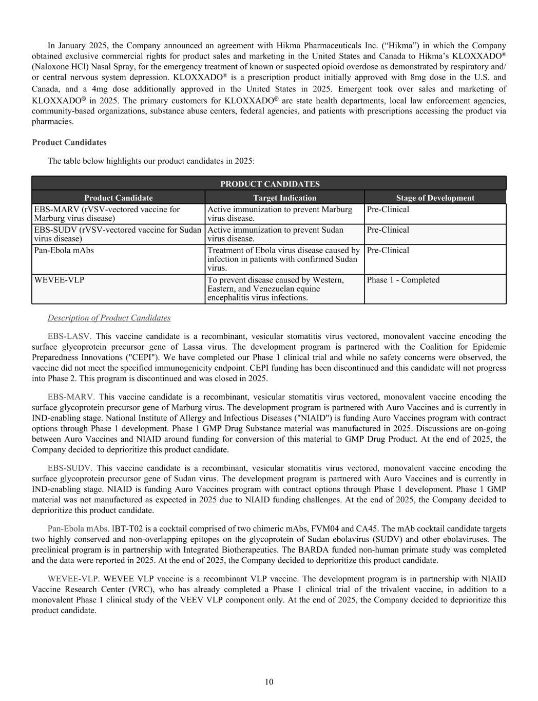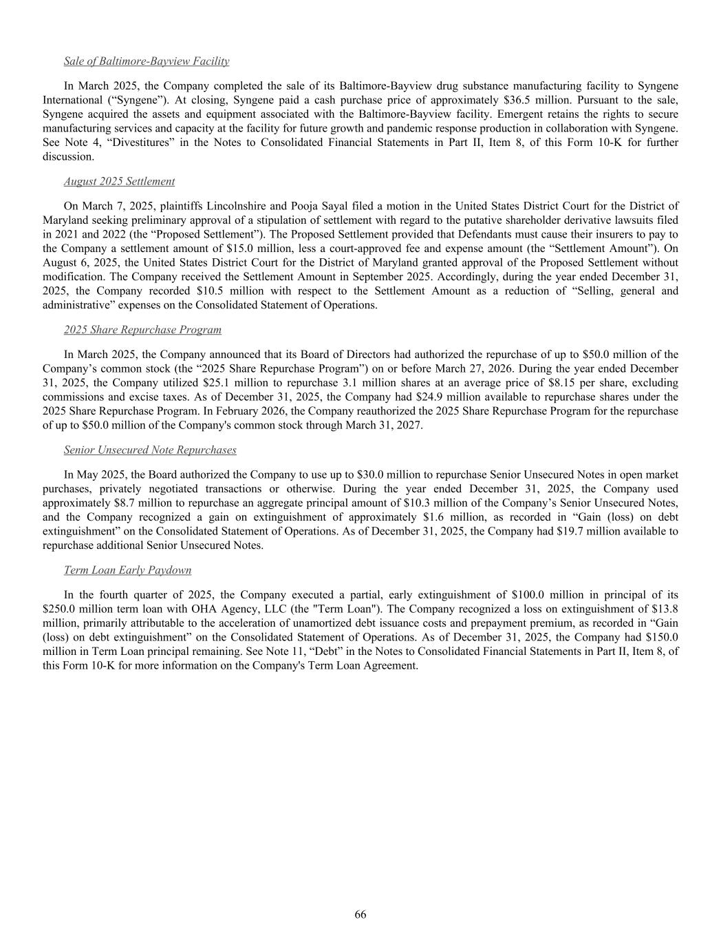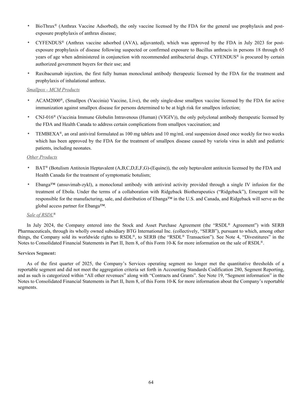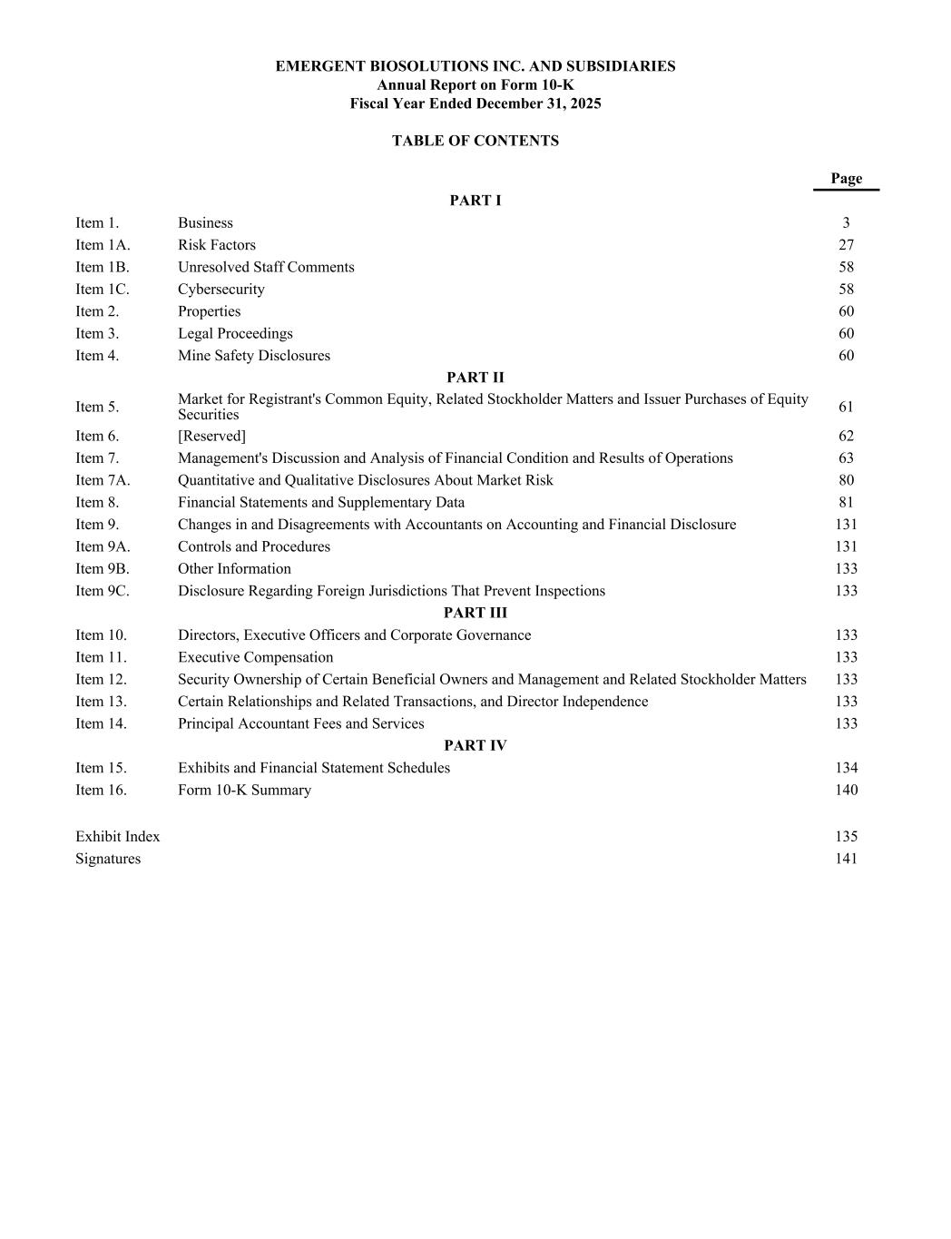 Dear Fellow Shareholders, In 2025, we made meaningful progress toward our multi-year strategy to turnaround and transform Emergent. As we continue our transformation journey, we remain committed to our mission to protect and save lives, while prioritizing patient safety, quality and compliance and advancing the operational and strategic priorities essential to long-term growth. This year we took important steps to strengthen our financial position through a customer- focused, lean and efficient business model, strong operating results, margin improvements and significant debt repayment. These actions, combined with the strategic divestitures and operational initiatives executed in 2024, enhanced our balance sheet and reinforced the foundation needed to support sustainable value creation. We successfully achieved several important milestones, including: Looking ahead, we are focused on the transformation of our company by investing in revenue growth drivers across both the MCM and naloxone businesses by advancing our internal pipeline, expanding our international revenue and pursuing targeted acquisitions and external opportunities that leverage our infrastructure and scale. Our products help protect communities and address critical public health challenges like smallpox, anthrax, botulism, Ebola and opioid overdoses. I want to express my deepest gratitude to my incredible colleagues at Emergent for another strong year of achievements and advancements. We believe Emergent is well positioned to deliver a strong 2026 and beyond. We are confident in our ability to transform the company and fulfill our mission to protect and save lives. Joe Papa President and CEO Delivered strong earnings and cash flow, improved our cash balance by $100M and reduced our debt by $110M. Secured multiple U.S. government contract awards for biodefense preparedness and delivered medical countermeasures to over 20 countries. Distributed over 100 million doses of NARCAN® Nasal Spray across the U.S. and Canada since 2016. Expanded naloxone portfolio by acquiring exclusive commercial rights to KLOXXADO® (naloxone HCI) Nasal Spray 8 mg and maintained market leadership position for NARCAN® Nasal Spray 4 mg. Divested Baltimore-Bayview facility for $36.5M while retaining rights to secure manufacturing capacity for future growth. Received U.S. FDA approval for drug product manufacturing of raxibacumab at Winnipeg facility. Announced investment agreement with Swiss Rockets AG and pursued strategic collaboration with its subsidiary Rocketvax. Advanced key initiatives to enhance quality and operational excellence across the enterprise.
