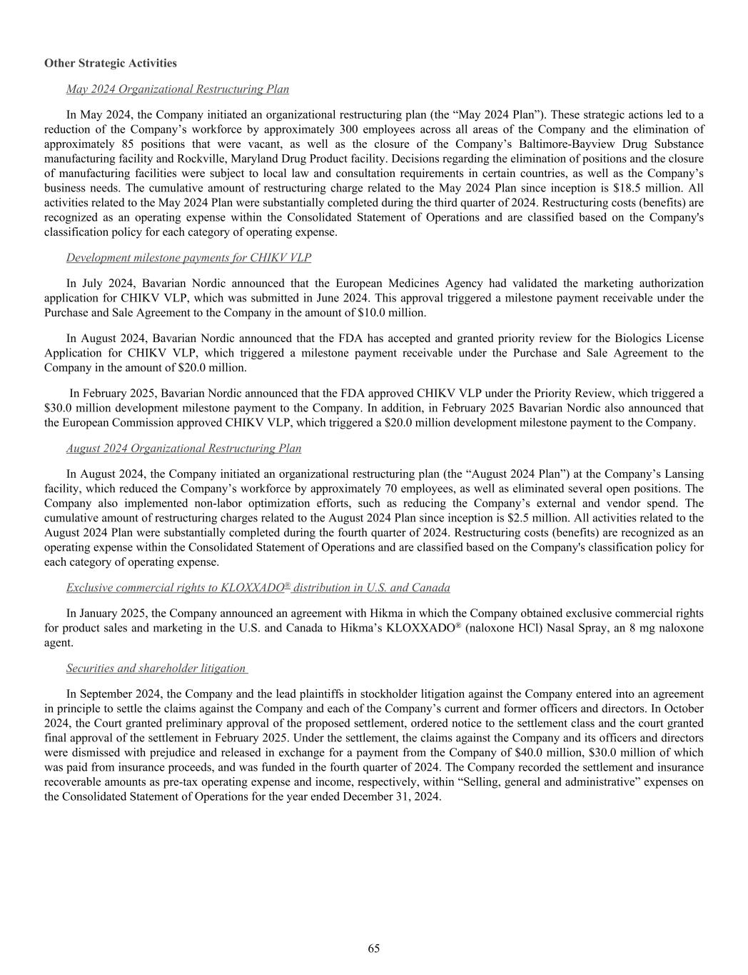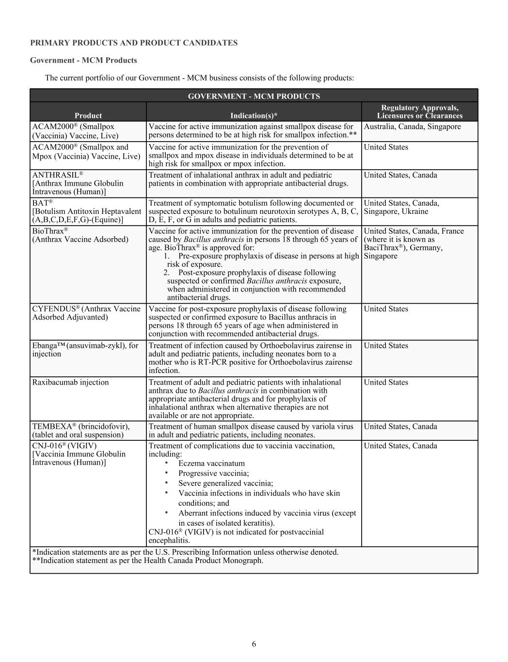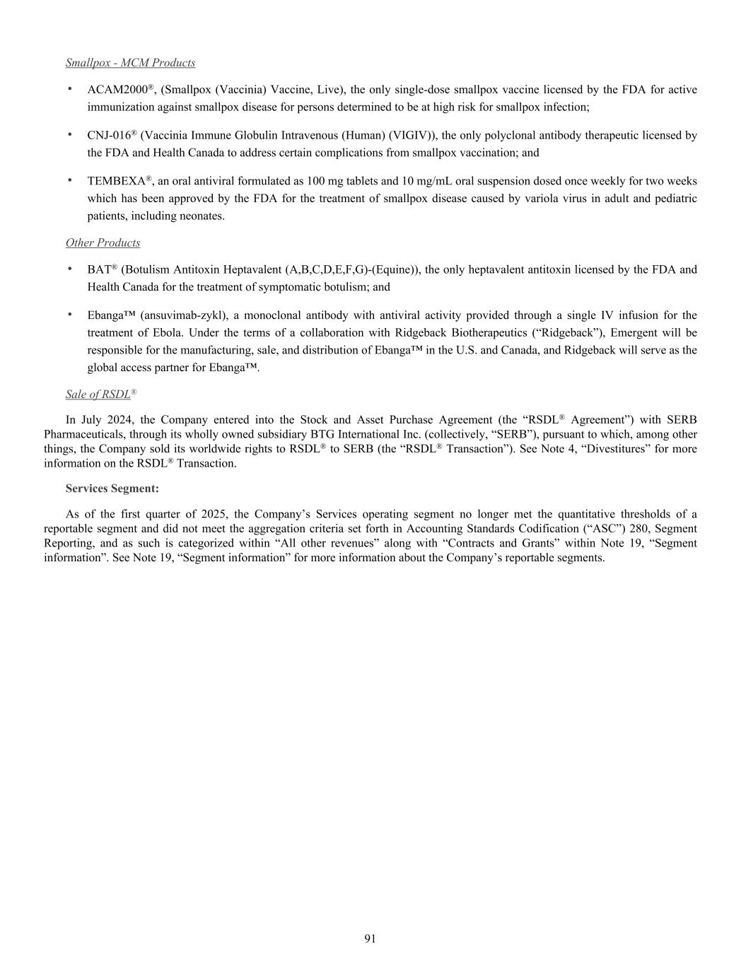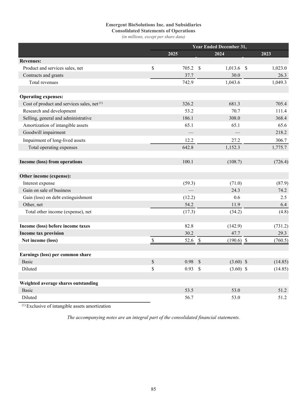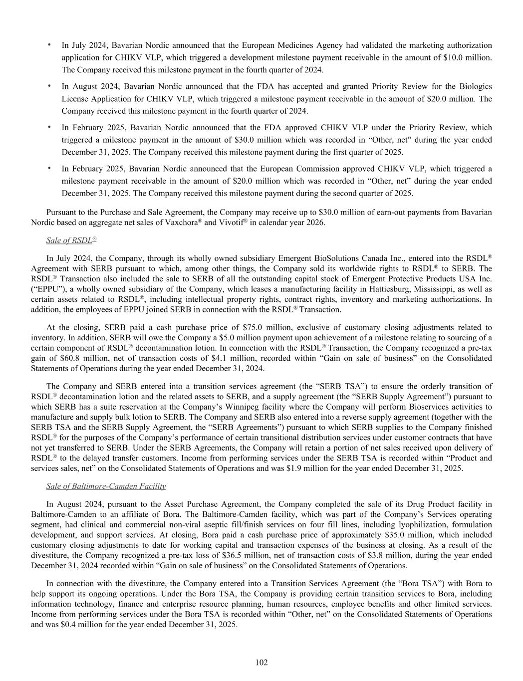 Dear Fellow Shareholders, In 2025, we made meaningful progress toward our multi-year strategy to turnaround and transform Emergent. As we continue our transformation journey, we remain committed to our mission to protect and save lives, while prioritizing patient safety, quality and compliance and advancing the operational and strategic priorities essential to long-term growth. This year we took important steps to strengthen our financial position through a customer- focused, lean and efficient business model, strong operating results, margin improvements and significant debt repayment. These actions, combined with the strategic divestitures and operational initiatives executed in 2024, enhanced our balance sheet and reinforced the foundation needed to support sustainable value creation. We successfully achieved several important milestones, including: Looking ahead, we are focused on the transformation of our company by investing in revenue growth drivers across both the MCM and naloxone businesses by advancing our internal pipeline, expanding our international revenue and pursuing targeted acquisitions and external opportunities that leverage our infrastructure and scale. Our products help protect communities and address critical public health challenges like smallpox, anthrax, botulism, Ebola and opioid overdoses. I want to express my deepest gratitude to my incredible colleagues at Emergent for another strong year of achievements and advancements. We believe Emergent is well positioned to deliver a strong 2026 and beyond. We are confident in our ability to transform the company and fulfill our mission to protect and save lives. Joe Papa President and CEO Delivered strong earnings and cash flow, improved our cash balance by $100M and reduced our debt by $110M. Secured multiple U.S. government contract awards for biodefense preparedness and delivered medical countermeasures to over 20 countries. Distributed over 100 million doses of NARCAN® Nasal Spray across the U.S. and Canada since 2016. Expanded naloxone portfolio by acquiring exclusive commercial rights to KLOXXADO® (naloxone HCI) Nasal Spray 8 mg and maintained market leadership position for NARCAN® Nasal Spray 4 mg. Divested Baltimore-Bayview facility for $36.5M while retaining rights to secure manufacturing capacity for future growth. Received U.S. FDA approval for drug product manufacturing of raxibacumab at Winnipeg facility. Announced investment agreement with Swiss Rockets AG and pursued strategic collaboration with its subsidiary Rocketvax. Advanced key initiatives to enhance quality and operational excellence across the enterprise.