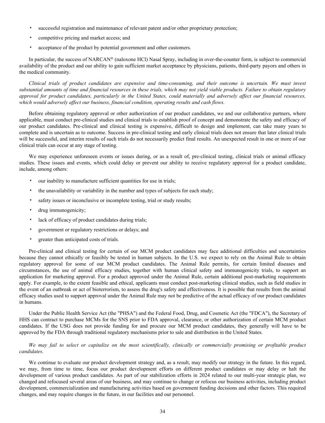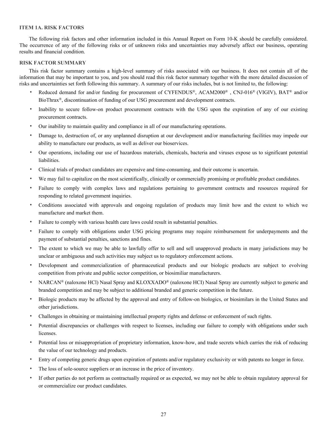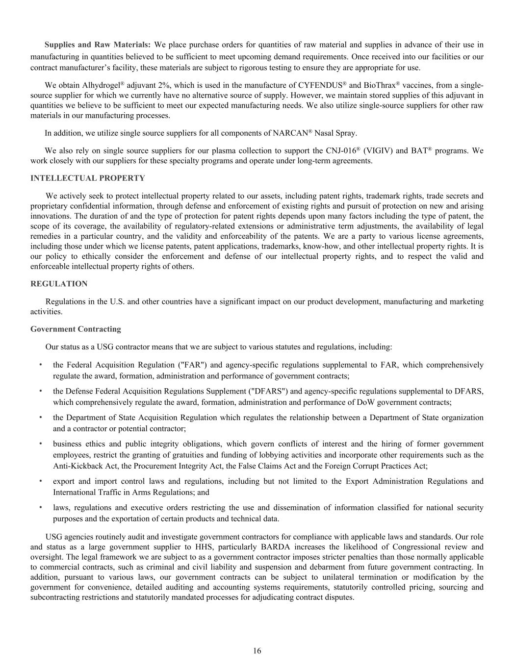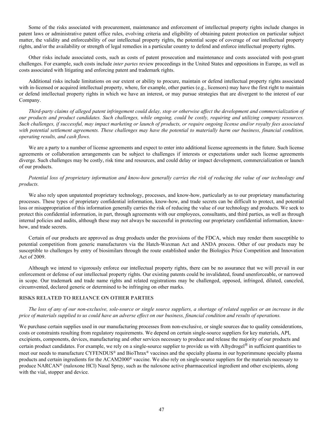 Dear Fellow Shareholders, In 2025, we made meaningful progress toward our multi-year strategy to turnaround and transform Emergent. As we continue our transformation journey, we remain committed to our mission to protect and save lives, while prioritizing patient safety, quality and compliance and advancing the operational and strategic priorities essential to long-term growth. This year we took important steps to strengthen our financial position through a customer- focused, lean and efficient business model, strong operating results, margin improvements and significant debt repayment. These actions, combined with the strategic divestitures and operational initiatives executed in 2024, enhanced our balance sheet and reinforced the foundation needed to support sustainable value creation. We successfully achieved several important milestones, including: Looking ahead, we are focused on the transformation of our company by investing in revenue growth drivers across both the MCM and naloxone businesses by advancing our internal pipeline, expanding our international revenue and pursuing targeted acquisitions and external opportunities that leverage our infrastructure and scale. Our products help protect communities and address critical public health challenges like smallpox, anthrax, botulism, Ebola and opioid overdoses. I want to express my deepest gratitude to my incredible colleagues at Emergent for another strong year of achievements and advancements. We believe Emergent is well positioned to deliver a strong 2026 and beyond. We are confident in our ability to transform the company and fulfill our mission to protect and save lives. Joe Papa President and CEO Delivered strong earnings and cash flow, improved our cash balance by $100M and reduced our debt by $110M. Secured multiple U.S. government contract awards for biodefense preparedness and delivered medical countermeasures to over 20 countries. Distributed over 100 million doses of NARCAN® Nasal Spray across the U.S. and Canada since 2016. Expanded naloxone portfolio by acquiring exclusive commercial rights to KLOXXADO® (naloxone HCI) Nasal Spray 8 mg and maintained market leadership position for NARCAN® Nasal Spray 4 mg. Divested Baltimore-Bayview facility for $36.5M while retaining rights to secure manufacturing capacity for future growth. Received U.S. FDA approval for drug product manufacturing of raxibacumab at Winnipeg facility. Announced investment agreement with Swiss Rockets AG and pursued strategic collaboration with its subsidiary Rocketvax. Advanced key initiatives to enhance quality and operational excellence across the enterprise.