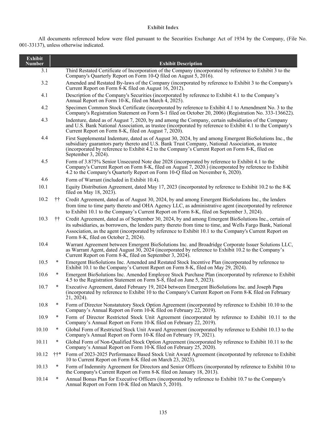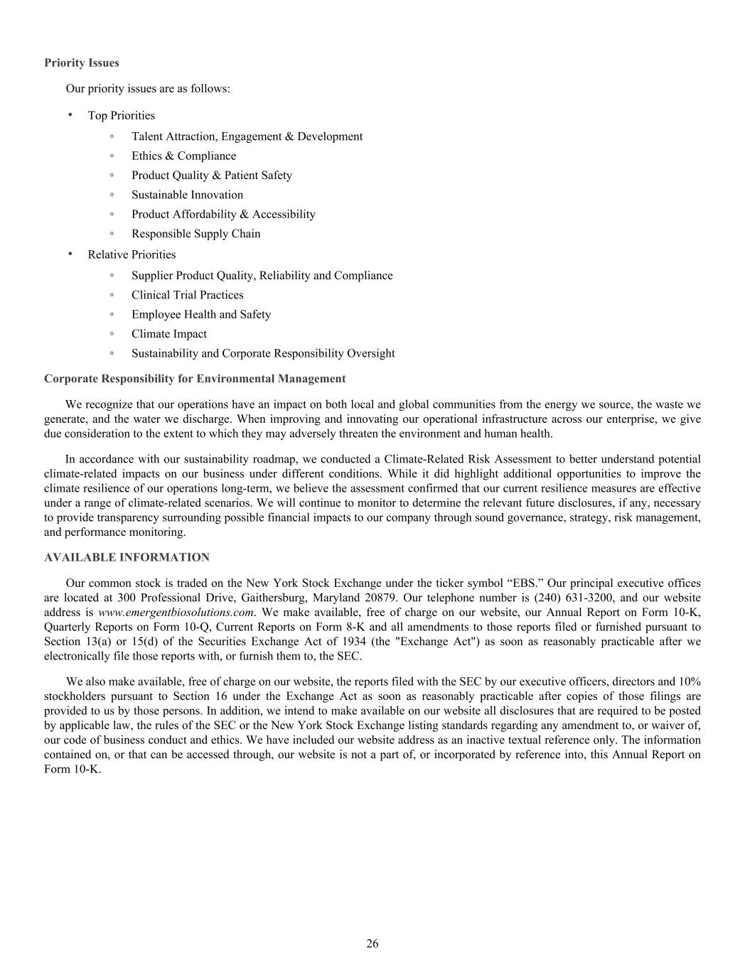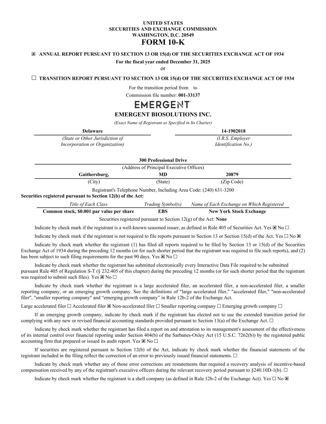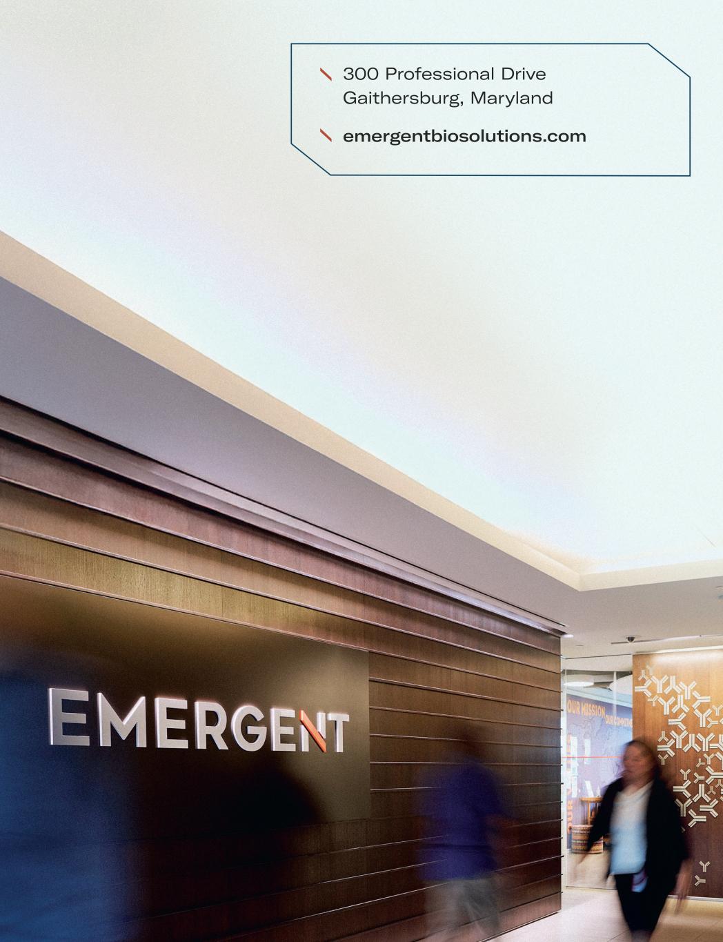 EXECUTIVE OFFICERS BOARD OF DIRECTORS CORPORATE HEADQUARTERS INDEPENDENT REGISTERED PUBLIC ACCOUNTING FIRM INVESTOR RELATIONS STOCK TRANSFER AGENT AND REGISTRAR ANNUAL MEETING MARKET INFORMATION CORPORATE GOVERNANCE Investors with questions concerning account information, new certificate issuances, lost or stolen certificate replacement, securities transfers, or the processing of a change of address should contact: . Our chief executive officer intends to submit his annual chief executive officer certification to the New York Stock Exchange within 30 days of the date of our Annual Meeting of Stockholders in accordance with the New York Stock Exchange listing requirements. Emergent BioSolutions Inc. is strongly committed to the highest standards of ethical conduct and corporate governance. Our Board of Directors has adopted Corporate Governance Guidelines, along with the charters of the Board Committees and a Code of Conduct and Business Ethics for directors, officers and employees, all of which are available on the company’s website at www.emergentbiosolutions.com. Additional copies of the company’s Form 10-K for the year ended December 31, 2025 of the exhibits thereto, are available without charge upon written request to Investor Relations, Emergent BioSolutions Inc., 300 Professional Drive, Gaithersburg, MD 20879 or by accessing the company's website at www.emergentbiosolutions.com. Broadridge Corporate Issuer Solutions, Inc. *All titles are as of 3/10/2026 Joseph Papa President, CEO and Director Richard Lindahl Executive Vice President, Chief Financial Officer Coleen Glessner Executive Vice President, Quality and Ethics and Compliance Jessica Perl Senior Vice President, General Counsel and Corporate Secretary William Hartzel Senior Vice President, Manufacturing and Bioservices Paul Williams Senior Vice President, Head of Products Business Simon Lowry Senior Vice President, Chief Medical Officer, Head of Research and Development Stephanie Duatschek Chief Global Strategy and Franchise Development Officer Michelle Pepin Senior Vice President and Chief Human Resources Officer Zsolt Harsanyi, Ph.D. Independent Director, Chairman of the Board Former Chief Executive Officer and Chairman of the Board, Exponential Biotherapies Inc. Audit and Finance Committee Member Quality, Compliance, Manufacturing and Risk Management Committee Member Scientific Review Committee Member Neal Fowler Independent Director Chief Executive Officer of Pathalys Pharma, Inc. Audit and Finance Committee Member Scientific Review Committee Member Sujata Dayal Independent Director Former Vice President and Global Chief Compliance Officer, Medline Industries, Inc. Chair, Quality, Compliance, Manufacturing and Risk Management Committee Audit and Finance Committee Member Keith Katkin Independent Director Former Chief Executive Officer, Urovant Sciences Ltd. Compensation Committee Member Nominating and Corporate Governance Committee Member Marvin White Independent Director President and Chief Executive Officer, Aptevo Therapeutics Inc. Chair, Audit and Finance Committee Scientific Review Committee Member Donald DeGolyer Independent Director Founder and Former Chief Executive Officer and Director of Vertice Pharma (a Warburg Pincus company) Chair, Compensation Committee Quality, Compliance, Manufacturing and Risk Management Committee Member Ronald Richard Independent Director Former President and Chief Executive Officer, The Cleveland Foundation Chair, Nominating and Corporate Governance Committee Compensation Committee Member Kathryn Zoon, Ph.D. Independent Director Scientist Emeritus, National Institute of Allergy and Infectious Diseases at the National Institutes of Health Chair, Scientific Review Committee Nominating and Corporate Governance Committee Member Quality, Compliance, Manufacturing and Risk Management Committee Member 300 Professional Drive Gaithersburg, MD 20879 Tel: 240-631-3200 Fax: 240-631-3203 Ernst & Young LLP, McLean, VA, United States P.O. Box 1342 Brentwood, NY 11717 1-877-830-4936 or 1-720-378-5591 Shareholder@broadridge.com Richard Lindahl Executive Vice President, Chief Financial Officer (240) 631-3360 Lindahlr@ebsi.com Emergent BioSolutions Inc.’s common stock trades on the New York Stock Exchange under the trading symbol "EBS." The annual meeting of Emergent BioSolutions Inc. will be held in virtual format via live audio webcast on April 29, 2026 at 9:00 a.m. Eastern Time. Stockholders can attend the meeting online at www.virtualshareholdermeeting.com/EBS2026 John Fowler, Jr. Independent Director Chair, Board of Trustees of the University of Virginia Darden School Foundation; Former Vice Chairman, Corporate and Investment Banking, Wells Fargo Audit and Finance Committee Member