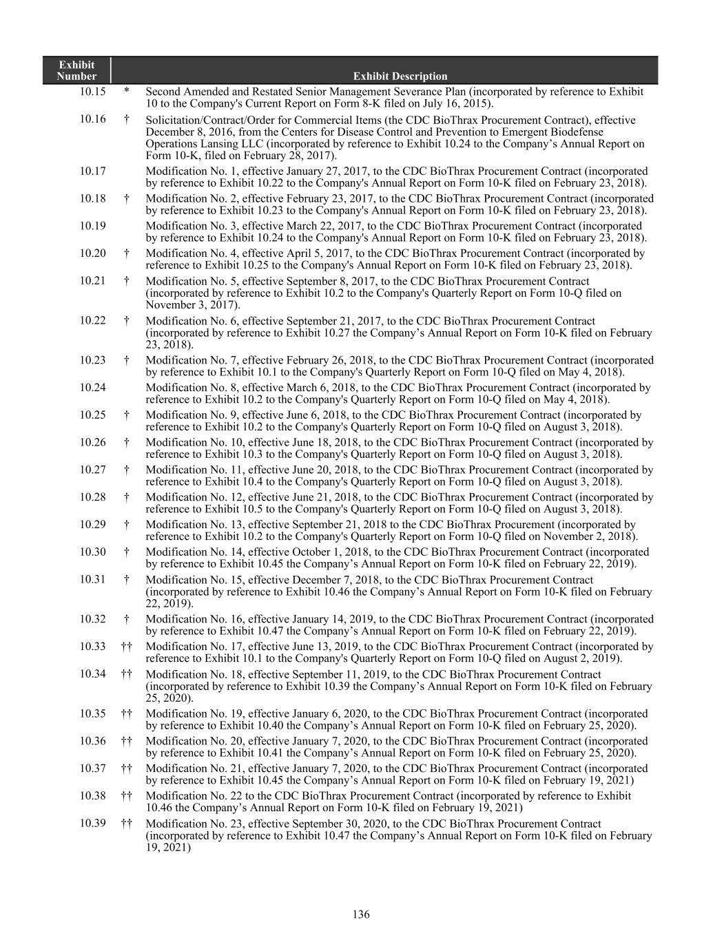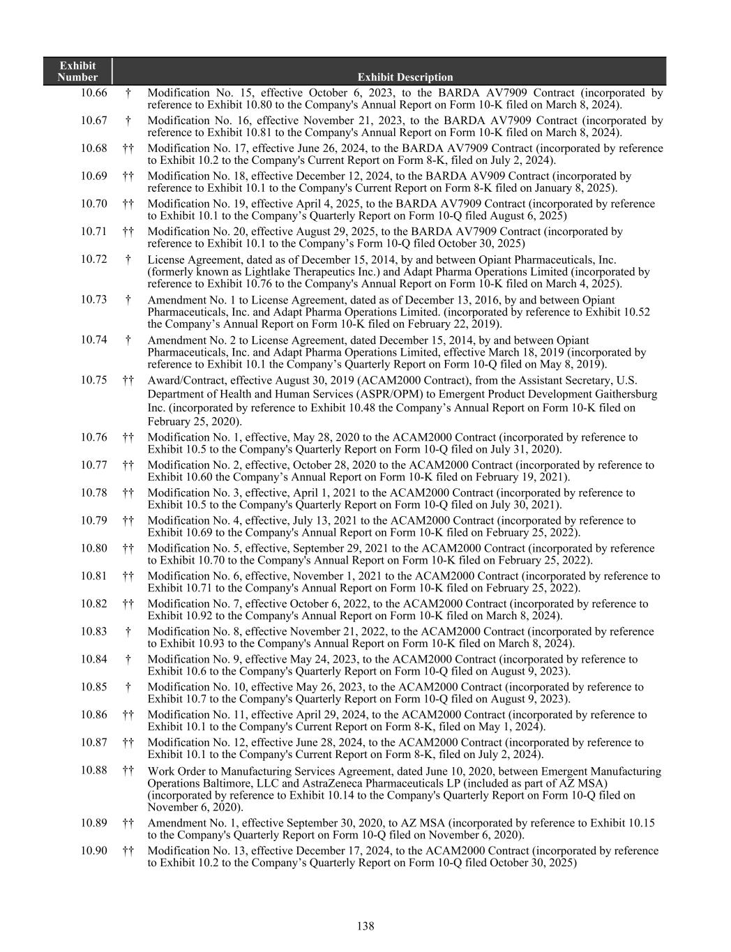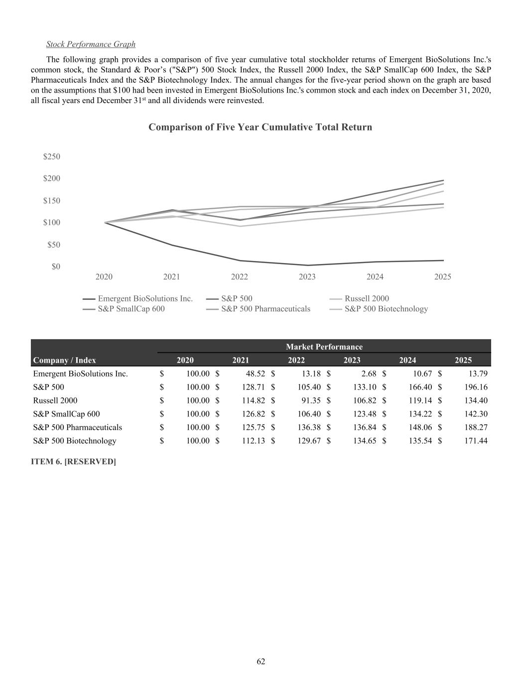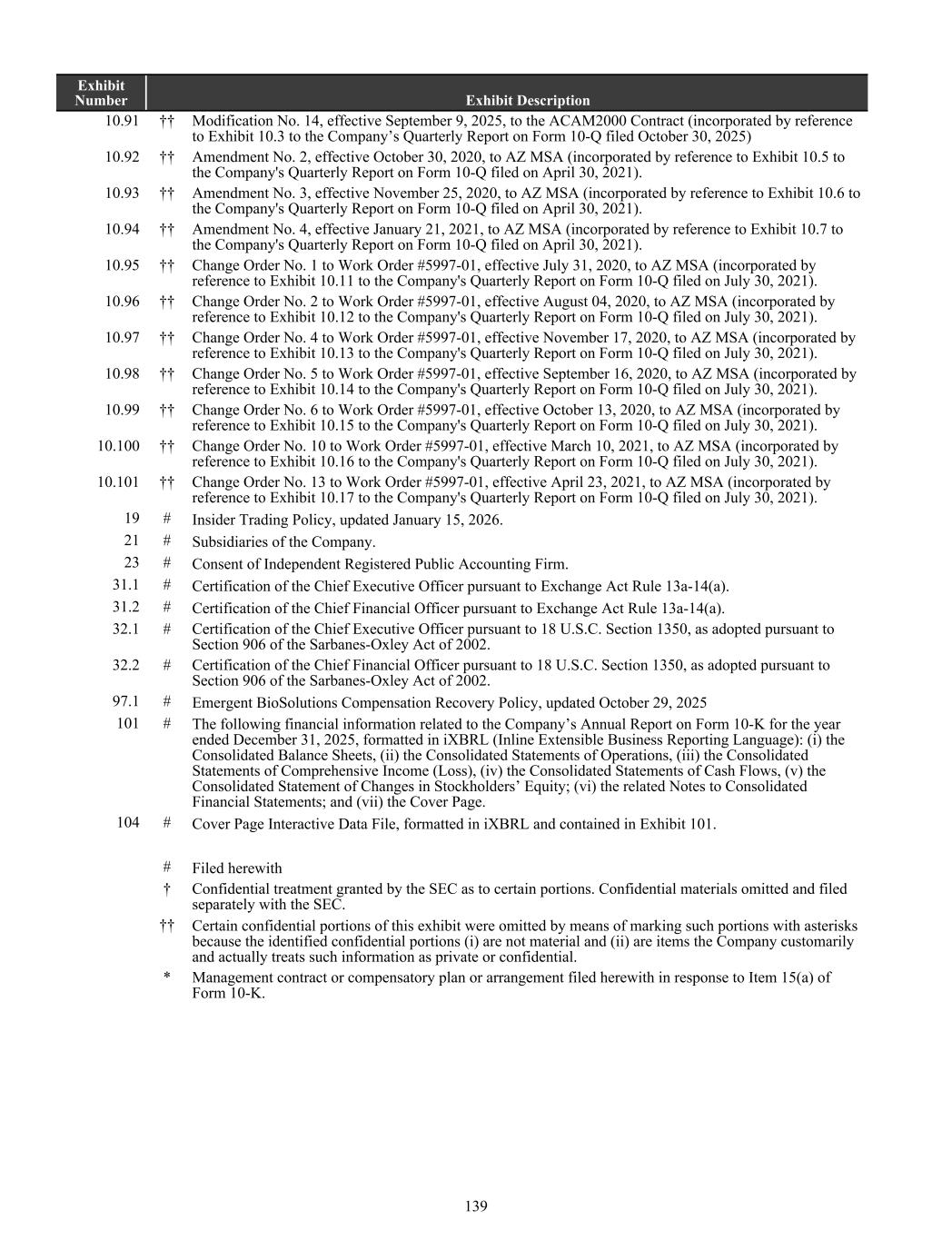 EXECUTIVE OFFICERS BOARD OF DIRECTORS CORPORATE HEADQUARTERS INDEPENDENT REGISTERED PUBLIC ACCOUNTING FIRM INVESTOR RELATIONS STOCK TRANSFER AGENT AND REGISTRAR ANNUAL MEETING MARKET INFORMATION CORPORATE GOVERNANCE Investors with questions concerning account information, new certificate issuances, lost or stolen certificate replacement, securities transfers, or the processing of a change of address should contact: . Our chief executive officer intends to submit his annual chief executive officer certification to the New York Stock Exchange within 30 days of the date of our Annual Meeting of Stockholders in accordance with the New York Stock Exchange listing requirements. Emergent BioSolutions Inc. is strongly committed to the highest standards of ethical conduct and corporate governance. Our Board of Directors has adopted Corporate Governance Guidelines, along with the charters of the Board Committees and a Code of Conduct and Business Ethics for directors, officers and employees, all of which are available on the company’s website at www.emergentbiosolutions.com. Additional copies of the company’s Form 10-K for the year ended December 31, 2025 of the exhibits thereto, are available without charge upon written request to Investor Relations, Emergent BioSolutions Inc., 300 Professional Drive, Gaithersburg, MD 20879 or by accessing the company's website at www.emergentbiosolutions.com. Broadridge Corporate Issuer Solutions, Inc. *All titles are as of 3/10/2026 Joseph Papa President, CEO and Director Richard Lindahl Executive Vice President, Chief Financial Officer Coleen Glessner Executive Vice President, Quality and Ethics and Compliance Jessica Perl Senior Vice President, General Counsel and Corporate Secretary William Hartzel Senior Vice President, Manufacturing and Bioservices Paul Williams Senior Vice President, Head of Products Business Simon Lowry Senior Vice President, Chief Medical Officer, Head of Research and Development Stephanie Duatschek Chief Global Strategy and Franchise Development Officer Michelle Pepin Senior Vice President and Chief Human Resources Officer Zsolt Harsanyi, Ph.D. Independent Director, Chairman of the Board Former Chief Executive Officer and Chairman of the Board, Exponential Biotherapies Inc. Audit and Finance Committee Member Quality, Compliance, Manufacturing and Risk Management Committee Member Scientific Review Committee Member Neal Fowler Independent Director Chief Executive Officer of Pathalys Pharma, Inc. Audit and Finance Committee Member Scientific Review Committee Member Sujata Dayal Independent Director Former Vice President and Global Chief Compliance Officer, Medline Industries, Inc. Chair, Quality, Compliance, Manufacturing and Risk Management Committee Audit and Finance Committee Member Keith Katkin Independent Director Former Chief Executive Officer, Urovant Sciences Ltd. Compensation Committee Member Nominating and Corporate Governance Committee Member Marvin White Independent Director President and Chief Executive Officer, Aptevo Therapeutics Inc. Chair, Audit and Finance Committee Scientific Review Committee Member Donald DeGolyer Independent Director Founder and Former Chief Executive Officer and Director of Vertice Pharma (a Warburg Pincus company) Chair, Compensation Committee Quality, Compliance, Manufacturing and Risk Management Committee Member Ronald Richard Independent Director Former President and Chief Executive Officer, The Cleveland Foundation Chair, Nominating and Corporate Governance Committee Compensation Committee Member Kathryn Zoon, Ph.D. Independent Director Scientist Emeritus, National Institute of Allergy and Infectious Diseases at the National Institutes of Health Chair, Scientific Review Committee Nominating and Corporate Governance Committee Member Quality, Compliance, Manufacturing and Risk Management Committee Member 300 Professional Drive Gaithersburg, MD 20879 Tel: 240-631-3200 Fax: 240-631-3203 Ernst & Young LLP, McLean, VA, United States P.O. Box 1342 Brentwood, NY 11717 1-877-830-4936 or 1-720-378-5591 Shareholder@broadridge.com Richard Lindahl Executive Vice President, Chief Financial Officer (240) 631-3360 Lindahlr@ebsi.com Emergent BioSolutions Inc.’s common stock trades on the New York Stock Exchange under the trading symbol "EBS." The annual meeting of Emergent BioSolutions Inc. will be held in virtual format via live audio webcast on April 29, 2026 at 9:00 a.m. Eastern Time. Stockholders can attend the meeting online at www.virtualshareholdermeeting.com/EBS2026 John Fowler, Jr. Independent Director Chair, Board of Trustees of the University of Virginia Darden School Foundation; Former Vice Chairman, Corporate and Investment Banking, Wells Fargo Audit and Finance Committee Member