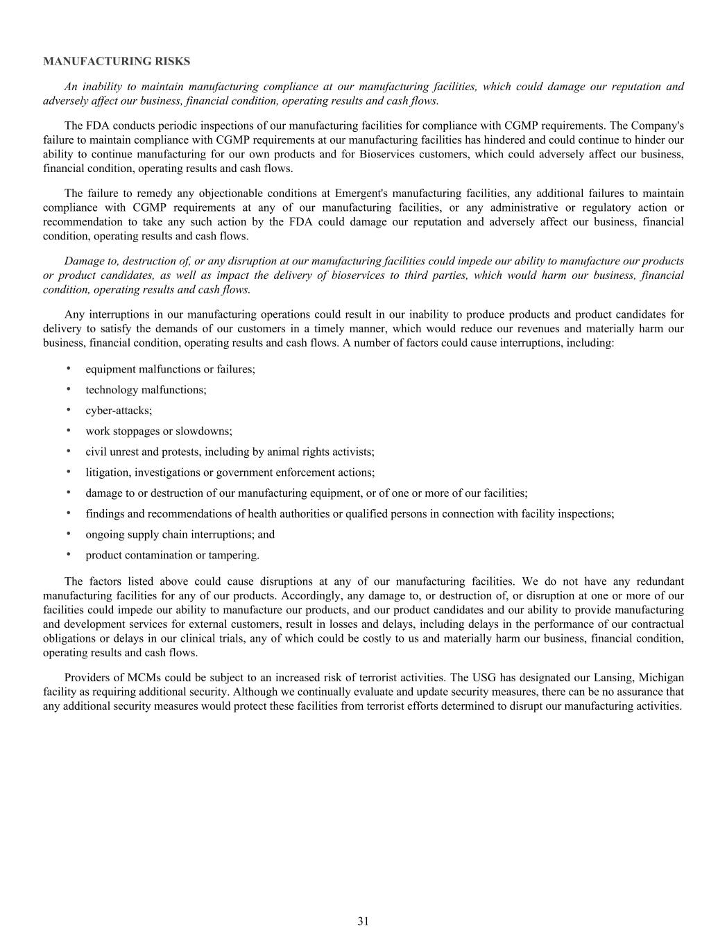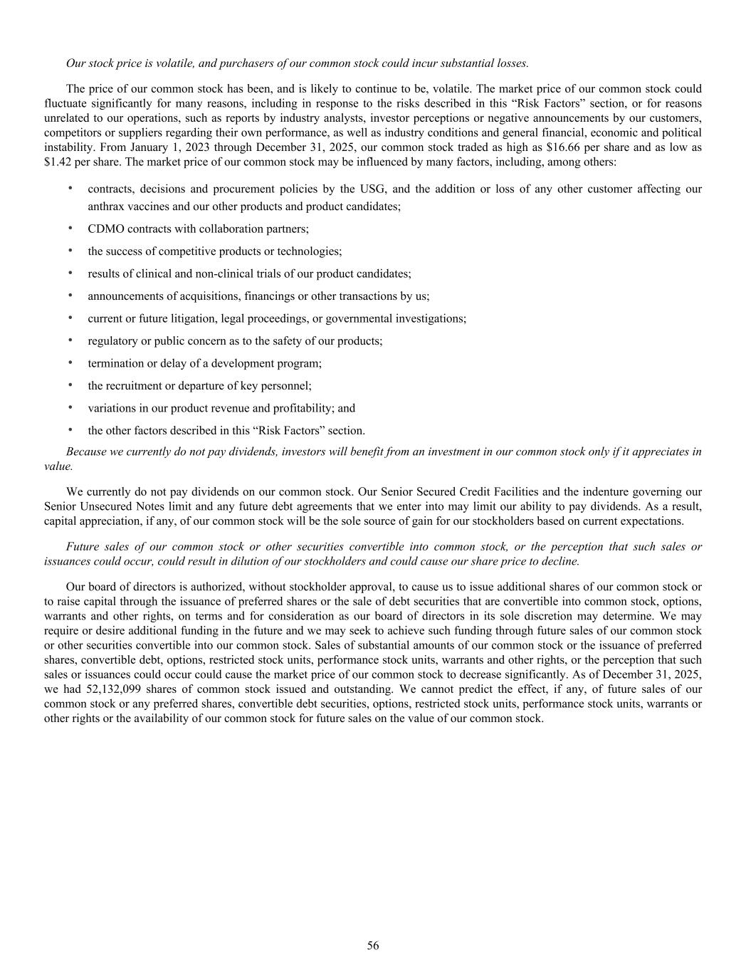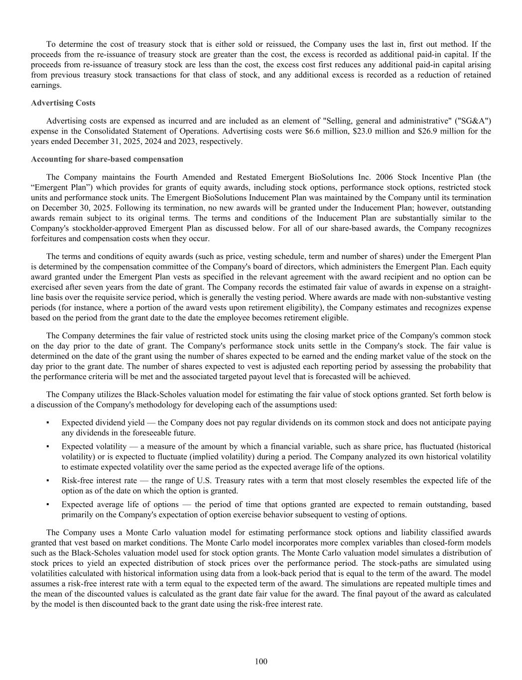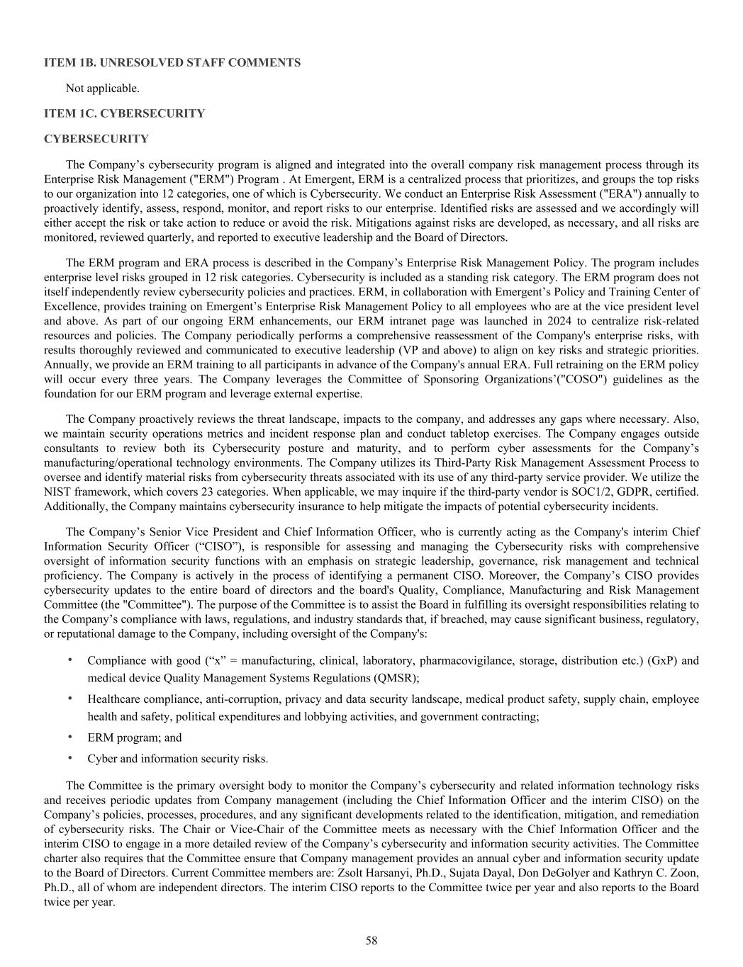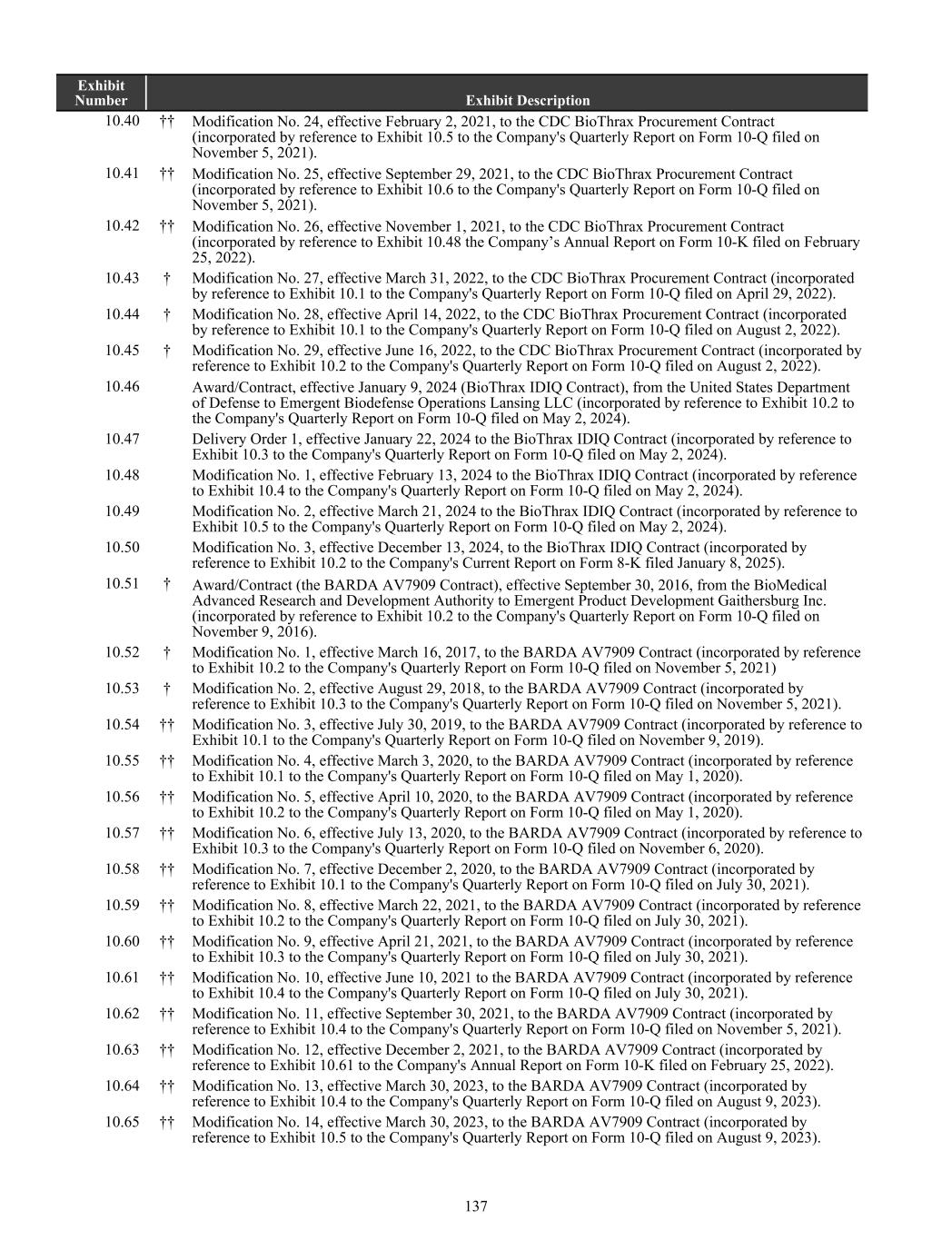 EXECUTIVE OFFICERS BOARD OF DIRECTORS CORPORATE HEADQUARTERS INDEPENDENT REGISTERED PUBLIC ACCOUNTING FIRM INVESTOR RELATIONS STOCK TRANSFER AGENT AND REGISTRAR ANNUAL MEETING MARKET INFORMATION CORPORATE GOVERNANCE Investors with questions concerning account information, new certificate issuances, lost or stolen certificate replacement, securities transfers, or the processing of a change of address should contact: . Our chief executive officer intends to submit his annual chief executive officer certification to the New York Stock Exchange within 30 days of the date of our Annual Meeting of Stockholders in accordance with the New York Stock Exchange listing requirements. Emergent BioSolutions Inc. is strongly committed to the highest standards of ethical conduct and corporate governance. Our Board of Directors has adopted Corporate Governance Guidelines, along with the charters of the Board Committees and a Code of Conduct and Business Ethics for directors, officers and employees, all of which are available on the company’s website at www.emergentbiosolutions.com. Additional copies of the company’s Form 10-K for the year ended December 31, 2025 of the exhibits thereto, are available without charge upon written request to Investor Relations, Emergent BioSolutions Inc., 300 Professional Drive, Gaithersburg, MD 20879 or by accessing the company's website at www.emergentbiosolutions.com. Broadridge Corporate Issuer Solutions, Inc. *All titles are as of 3/10/2026 Joseph Papa President, CEO and Director Richard Lindahl Executive Vice President, Chief Financial Officer Coleen Glessner Executive Vice President, Quality and Ethics and Compliance Jessica Perl Senior Vice President, General Counsel and Corporate Secretary William Hartzel Senior Vice President, Manufacturing and Bioservices Paul Williams Senior Vice President, Head of Products Business Simon Lowry Senior Vice President, Chief Medical Officer, Head of Research and Development Stephanie Duatschek Chief Global Strategy and Franchise Development Officer Michelle Pepin Senior Vice President and Chief Human Resources Officer Zsolt Harsanyi, Ph.D. Independent Director, Chairman of the Board Former Chief Executive Officer and Chairman of the Board, Exponential Biotherapies Inc. Audit and Finance Committee Member Quality, Compliance, Manufacturing and Risk Management Committee Member Scientific Review Committee Member Neal Fowler Independent Director Chief Executive Officer of Pathalys Pharma, Inc. Audit and Finance Committee Member Scientific Review Committee Member Sujata Dayal Independent Director Former Vice President and Global Chief Compliance Officer, Medline Industries, Inc. Chair, Quality, Compliance, Manufacturing and Risk Management Committee Audit and Finance Committee Member Keith Katkin Independent Director Former Chief Executive Officer, Urovant Sciences Ltd. Compensation Committee Member Nominating and Corporate Governance Committee Member Marvin White Independent Director President and Chief Executive Officer, Aptevo Therapeutics Inc. Chair, Audit and Finance Committee Scientific Review Committee Member Donald DeGolyer Independent Director Founder and Former Chief Executive Officer and Director of Vertice Pharma (a Warburg Pincus company) Chair, Compensation Committee Quality, Compliance, Manufacturing and Risk Management Committee Member Ronald Richard Independent Director Former President and Chief Executive Officer, The Cleveland Foundation Chair, Nominating and Corporate Governance Committee Compensation Committee Member Kathryn Zoon, Ph.D. Independent Director Scientist Emeritus, National Institute of Allergy and Infectious Diseases at the National Institutes of Health Chair, Scientific Review Committee Nominating and Corporate Governance Committee Member Quality, Compliance, Manufacturing and Risk Management Committee Member 300 Professional Drive Gaithersburg, MD 20879 Tel: 240-631-3200 Fax: 240-631-3203 Ernst & Young LLP, McLean, VA, United States P.O. Box 1342 Brentwood, NY 11717 1-877-830-4936 or 1-720-378-5591 Shareholder@broadridge.com Richard Lindahl Executive Vice President, Chief Financial Officer (240) 631-3360 Lindahlr@ebsi.com Emergent BioSolutions Inc.’s common stock trades on the New York Stock Exchange under the trading symbol "EBS." The annual meeting of Emergent BioSolutions Inc. will be held in virtual format via live audio webcast on April 29, 2026 at 9:00 a.m. Eastern Time. Stockholders can attend the meeting online at www.virtualshareholdermeeting.com/EBS2026 John Fowler, Jr. Independent Director Chair, Board of Trustees of the University of Virginia Darden School Foundation; Former Vice Chairman, Corporate and Investment Banking, Wells Fargo Audit and Finance Committee Member