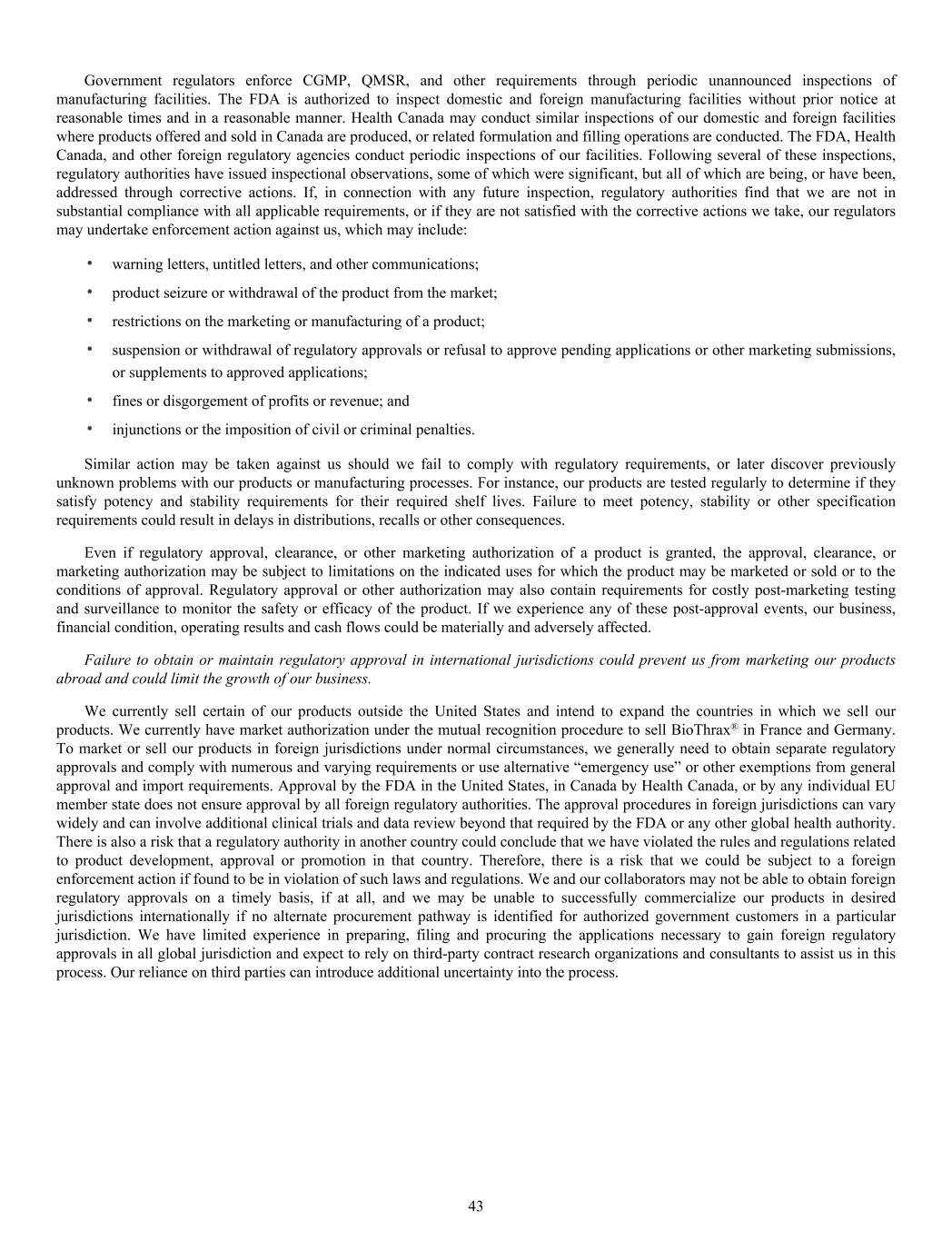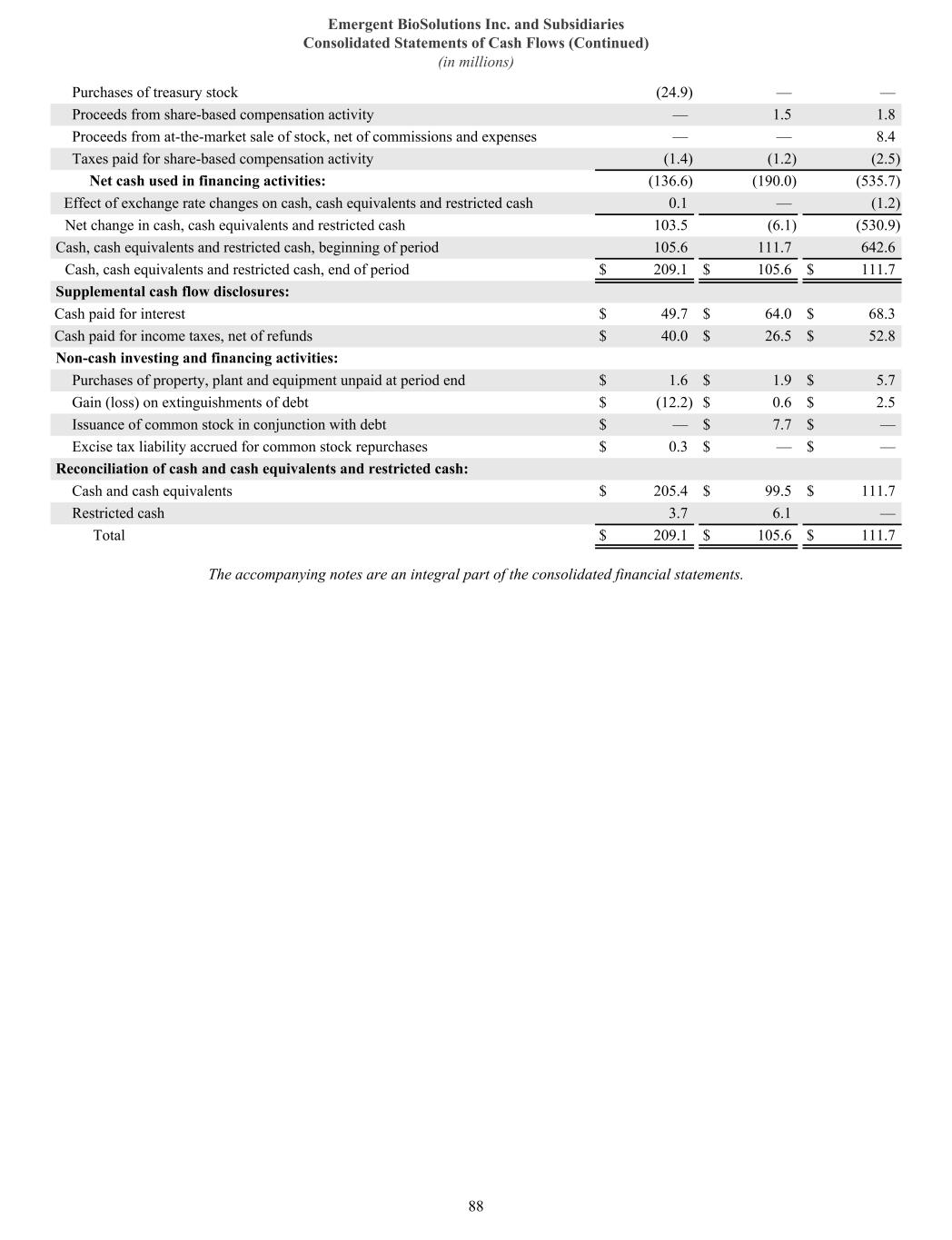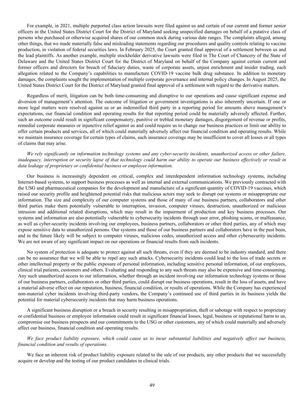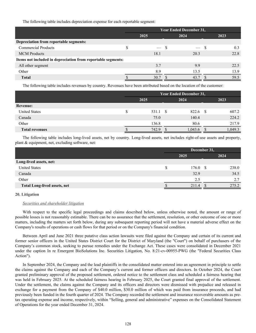 EXECUTIVE OFFICERS BOARD OF DIRECTORS CORPORATE HEADQUARTERS INDEPENDENT REGISTERED PUBLIC ACCOUNTING FIRM INVESTOR RELATIONS STOCK TRANSFER AGENT AND REGISTRAR ANNUAL MEETING MARKET INFORMATION CORPORATE GOVERNANCE Investors with questions concerning account information, new certificate issuances, lost or stolen certificate replacement, securities transfers, or the processing of a change of address should contact: . Our chief executive officer intends to submit his annual chief executive officer certification to the New York Stock Exchange within 30 days of the date of our Annual Meeting of Stockholders in accordance with the New York Stock Exchange listing requirements. Emergent BioSolutions Inc. is strongly committed to the highest standards of ethical conduct and corporate governance. Our Board of Directors has adopted Corporate Governance Guidelines, along with the charters of the Board Committees and a Code of Conduct and Business Ethics for directors, officers and employees, all of which are available on the company’s website at www.emergentbiosolutions.com. Additional copies of the company’s Form 10-K for the year ended December 31, 2025 of the exhibits thereto, are available without charge upon written request to Investor Relations, Emergent BioSolutions Inc., 300 Professional Drive, Gaithersburg, MD 20879 or by accessing the company's website at www.emergentbiosolutions.com. Broadridge Corporate Issuer Solutions, Inc. *All titles are as of 3/10/2026 Joseph Papa President, CEO and Director Richard Lindahl Executive Vice President, Chief Financial Officer Coleen Glessner Executive Vice President, Quality and Ethics and Compliance Jessica Perl Senior Vice President, General Counsel and Corporate Secretary William Hartzel Senior Vice President, Manufacturing and Bioservices Paul Williams Senior Vice President, Head of Products Business Simon Lowry Senior Vice President, Chief Medical Officer, Head of Research and Development Stephanie Duatschek Chief Global Strategy and Franchise Development Officer Michelle Pepin Senior Vice President and Chief Human Resources Officer Zsolt Harsanyi, Ph.D. Independent Director, Chairman of the Board Former Chief Executive Officer and Chairman of the Board, Exponential Biotherapies Inc. Audit and Finance Committee Member Quality, Compliance, Manufacturing and Risk Management Committee Member Scientific Review Committee Member Neal Fowler Independent Director Chief Executive Officer of Pathalys Pharma, Inc. Audit and Finance Committee Member Scientific Review Committee Member Sujata Dayal Independent Director Former Vice President and Global Chief Compliance Officer, Medline Industries, Inc. Chair, Quality, Compliance, Manufacturing and Risk Management Committee Audit and Finance Committee Member Keith Katkin Independent Director Former Chief Executive Officer, Urovant Sciences Ltd. Compensation Committee Member Nominating and Corporate Governance Committee Member Marvin White Independent Director President and Chief Executive Officer, Aptevo Therapeutics Inc. Chair, Audit and Finance Committee Scientific Review Committee Member Donald DeGolyer Independent Director Founder and Former Chief Executive Officer and Director of Vertice Pharma (a Warburg Pincus company) Chair, Compensation Committee Quality, Compliance, Manufacturing and Risk Management Committee Member Ronald Richard Independent Director Former President and Chief Executive Officer, The Cleveland Foundation Chair, Nominating and Corporate Governance Committee Compensation Committee Member Kathryn Zoon, Ph.D. Independent Director Scientist Emeritus, National Institute of Allergy and Infectious Diseases at the National Institutes of Health Chair, Scientific Review Committee Nominating and Corporate Governance Committee Member Quality, Compliance, Manufacturing and Risk Management Committee Member 300 Professional Drive Gaithersburg, MD 20879 Tel: 240-631-3200 Fax: 240-631-3203 Ernst & Young LLP, McLean, VA, United States P.O. Box 1342 Brentwood, NY 11717 1-877-830-4936 or 1-720-378-5591 Shareholder@broadridge.com Richard Lindahl Executive Vice President, Chief Financial Officer (240) 631-3360 Lindahlr@ebsi.com Emergent BioSolutions Inc.’s common stock trades on the New York Stock Exchange under the trading symbol "EBS." The annual meeting of Emergent BioSolutions Inc. will be held in virtual format via live audio webcast on April 29, 2026 at 9:00 a.m. Eastern Time. Stockholders can attend the meeting online at www.virtualshareholdermeeting.com/EBS2026 John Fowler, Jr. Independent Director Chair, Board of Trustees of the University of Virginia Darden School Foundation; Former Vice Chairman, Corporate and Investment Banking, Wells Fargo Audit and Finance Committee Member